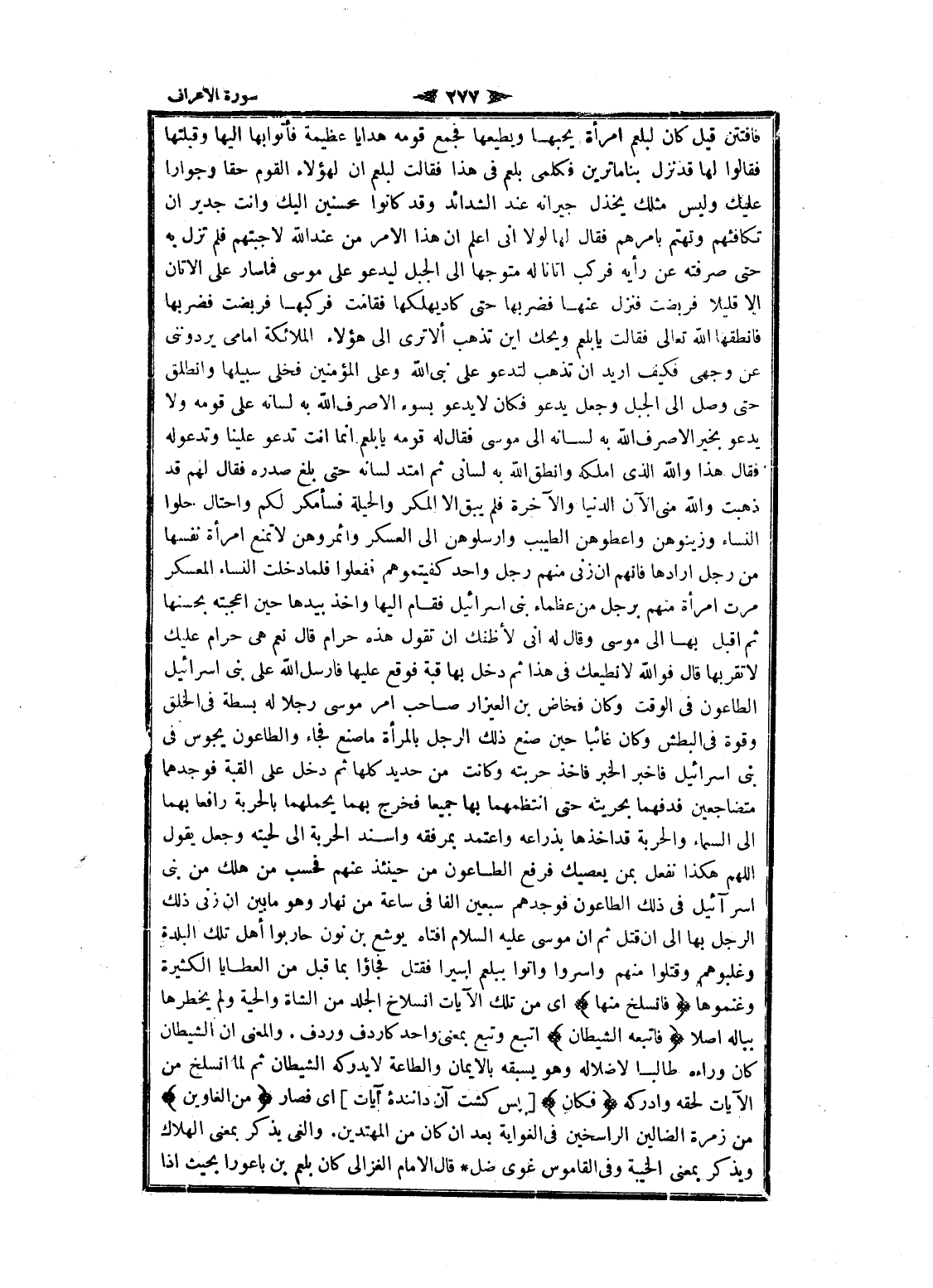 فافتتن قيل كان لبلعم امرأة يحبها ويطيعها فجمع قومه هدايا عظيمة فأتوا بها إليها وقبلتها فقالوا لها قد نزل بنا ماترين فكلمى بلعم فى هذا فقالت لبلعم ان لهؤلاء القوم حقا وجوارا عليك وليس مثلك يخذل جيرانه عند الشدائد وقد كانوا محسنين إليك وأنت جدير ان تكافئهم وتهتم بامرهم فقال لها لولا انى اعلم ان هذا الأمر من عند الله لاجبتهم فلم تزل به حتى صرفته عن رأيه فركب أتانا له متوجها الى الجبل ليدعو على موسى فما سار على الأتان الا قليلا فربضت فنزل عنها فضربها حتى كاد يهلكها فقامت فركبها فربضت فضربها فانطقها الله تعالى فقالت يا بلعم ويحك اين تذهب ألا ترى الى هؤلاء الملائكة امامى يردوننى عن وجهى فكيف أريد ان تذهب لتدعو على نبى الله وعلى المؤمنين فخلى سبيلها وانطلق حتى وصل الى الجبل وجعل يدعو فكان