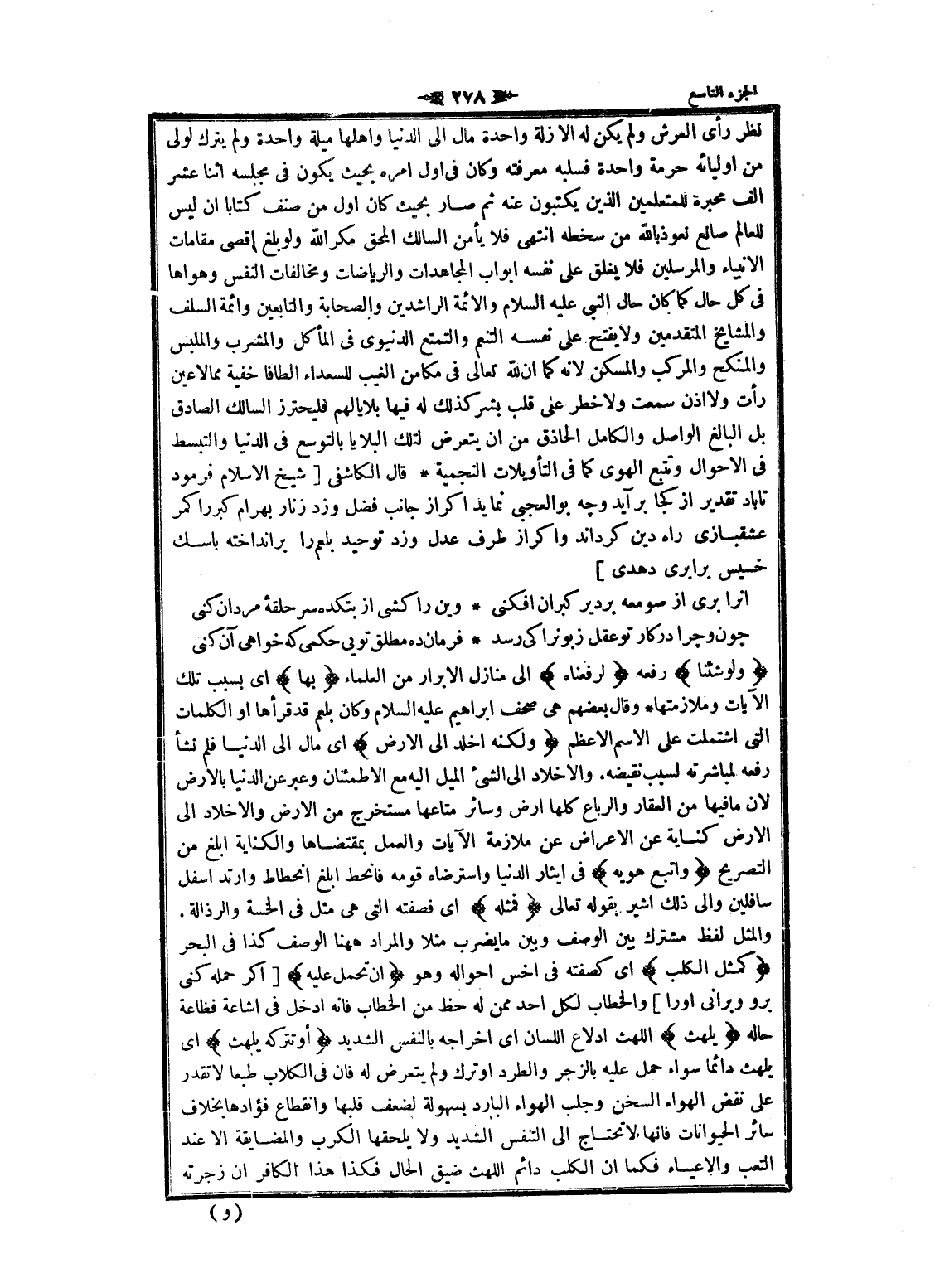 نظر رأى العرش ولم يكن له الا زلة واحدة مال الى الدنيا وأهلها ميلة واحدة ولم يترك لولى من أوليائه حرمة واحدة فسلبه معرفته وكان فى أول امره بحيث يكون فى مجلسه اثنا عشر الف محبرة للمتعلمين الذين يكتبون عنه ثم صار بحيث كان أول من صنف كتابا ان ليس للعالم صانع نعوذ بالله من سخطه انتهى فلا يأمن السالك المحق مكر الله ولو بلغ أقصى مقامات الأنبياء والمرسلين فلا يغلق على نفسه أبواب المجاهدات والرياضات ومخالفات النفس وهواها فى كل حال كما كان حال النبي عليه السلام والائمة الراشدين والصحابة والتابعين وائمة السلف والمشايخ المتقدمين ولا يفتح على نفسه التنعم والتمتع الدنيوي فى المأكل والمشرب والملبس والمنكح والمركب والمسكن لانه كما ان لله تعالى فى مكامن الغيب للسعداء الطافا خفية مما لا عين رأت ولا اذن سمعت ولا خطر على قلب بشر كذلك له فيها بلايا لهم فليحترز السالك الصادق بل البالغ الواصل والكامل الحاذق من ان يتعرض لتلك البلايا بالتوسع فى الدنيا والتبسط فى الأحوال وتتبع الهوى كما فى التأويلات النجمية قال الكاشفى [شيخ الإسلام فرمود تا باد تقدير از كجا بر آيد و چهـ بو العجبى نمايد اگر از جانب فضل وزد زنار بهرام كبر را كمر عشقبازى راه دين كرداند واگر از طرف عدل وزد توحيد بلعم را بر انداخته با سك خسيس برابرى دهدى]