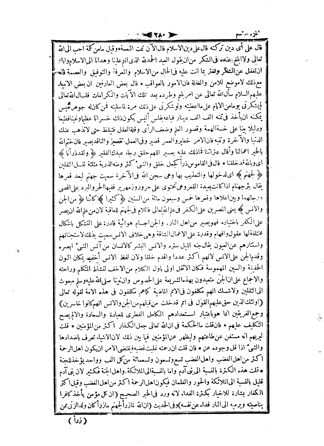 قال على أي دين تركته قال على دين الإسلام قال الآن تمت النعمة وقيل ما من كلمة أحب الى الله تعالى ولا ابلغ عنده فى الشكر من ان يقول العبد الحمد لله الذي أنعم علينا وهدانا الى الإسلام وإياك ان تغفل عن الشكر وتغتر بما أنت عليه فى الحال من الإسلام والمعرفة والتوفيق والعصمة فانه مع ذلك لا موضع للامن والغفلة فان الأمور بالعواقب قال بعض العارفين ان بعض الأنبياء عليهم السلام سأل الله تعالى عن امر بلعم وطرده بعد تلك الآيات والكرامات فقال الله تعالى لم يشكرنى يوما من الأيام على ما أعطيته ولو شكرنى على ذلك مرة لما سلبته فمن كان له جوهر نفيس يمكنه ان يأخذ فى ثمنه الف الف دينار فباعه بفلس أليس يكون ذلك خسرانا عظيما وغبنا فظيعا ودليلا بينا على خسة الهمة وقصور العلم وضعف الرأى وقلة العقل فتيقظ حتى لا تذهب عنك الدنيا والآخرة وتنبه فان الأمر خطير والعمر قصير وفى العمل تقصير والناقد بصير فان ختم الله بالخير اعمالنا وأقال عثراتنا فما ذلك عليه بعسير اللهم حقق رجاء عبدك الفقير وَلَقَدْ ذَرَأْنا اى وبالله قد خلقنا قال فى القاموس ذرأ كجعل خلق والشيء كثر ومنه الذرية مثلثة لنسل الثقلين لِجَهَنَّمَ اى لدخولها والتعذيب بها وهى سجن الله فى الآخرة سميت جهنم لبعد قعرها يقال بئر جهنام إذا كانت بعيدة القعر وهى تحتوى على حرور وزمهرير ففيها الحر والبرد على أقصى درجاتهما وبين أعلاها وقعرها خمس وسبعون مائة من السنين كَثِيراً كائنا مِنَ الْجِنِّ وَالْإِنْسِ يعنى المصرين على الكفر فى علم الله تعالى فاللام فى لجهنم للعاقبة لان من علم الله ان يصر على الكفر باختياره فهو يصير من اهل النار. والجن أجسام هوائية قادرة على التشكل باشكال مختلفة لها عقول وإفهام وقدرة على الأعمال الشاقة وهى خلاف الانس سميت بذلك لاستجنانهم واستتارهم عن العيون يقال جنه الليل ستره والانس البشر كالانسان من آنس الشيء أبصره وقدم الجن على الانس لانهم اكثر عددا واقدم خلقا ولان لفظ الانس أخف بمكان النون الخفيفة والسين المهموسة فكان الأثقل اولى باول الكلام من الأخف لنشاط المتكلم وراحته والإجماع على ان الجن متعبدون بهذه الشريعة على الخصوص وان نبينا صلى الله عليه وسلم مبعوث الى الثقلين ولا شك انهم مكلفون فى الأمم الماضية كما هم مكلفون فى هذه الامة لقوله تعالى أُولئِكَ الَّذِينَ حَقَّ عَلَيْهِمُ الْقَوْلُ فِي أُمَمٍ قَدْ خَلَتْ مِنْ قَبْلِهِمْ مِنَ الْجِنِّ وَالْإِنْسِ إِنَّهُمْ كانُوا خاسِرِينَ وجمع الفريقين انما هو باعتبار استعدادهم الكامل الفطري للعبادة والسعادة والألم يصح التكليف عليهم فان قلت ما الحكمة فى ان الله تعالى جعل الكفار اكثر من المؤمنين قلت ليريهم انه مستغن عن طاعتهم وليظهر عز المؤمنين فيما بين ذلك لان الأشياء تعرف بأضدادها والشيء إذا قل وجوده عز فان قلت ان رحمته غلبت غضبه فيقتضى الأمر ان يكون اهل الرحمة اكثر من اهل الغضب واهل الغضب تسع وتسعون وتسعمائة من كل الف وواحد يؤخذ للجنة قلت هذه الكثرة بالنسبة الى بنى آدم واما بالنسبة الى الملائكة واهل الجنة فكثير لان بنى آدم قليل بالنسبة الى الملائكة والحور والغلمان فيكون اهل الرحمة اكثر من اهل الغضب وقيل اكثر الكفار بشارة للاخيار بكثرة الفداء لانه ورد فى الخبر الصحيح (ان كل مؤمن يأخذ كافرا بناصيته ويرميه الى النار فداء عن نفسه) وفى الحديث (ان الله لما زرأ لجهنم ما زرأ كان ولد الزنى ممن