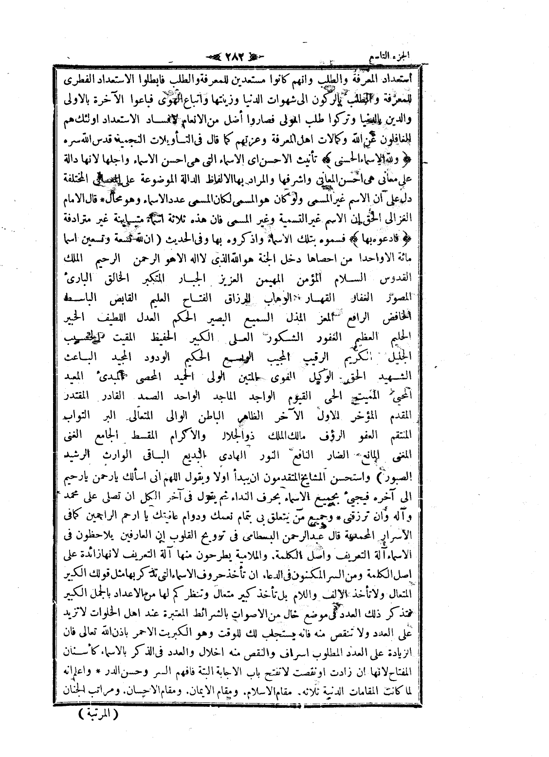 استعداد المعرفة والطلب وانهم كانوا مستعدين للمعرفة والطلب فابطلوا الاستعداد الفطري للمعرفة والطلب بالركون الى شهوات الدنيا وزينتها واتباع الهوى فباعوا الآخرة بالأولى والدين بالدنيا وتركوا طلب المولى فصاروا أضل من الانعام لا فساد الاستعداد أولئك هم الغافلون عن الله وكمالات اهل المعرفة وعزتهم كما قال فى التأويلات النجمية قدس الله سره وَلِلَّهِ الْأَسْماءُ الْحُسْنى تأنيث الأحسن اى الأسماء التي هى احسن الأسماء وأجلها لانها دالة على معانى هى احسن المعاني وأشرفها والمراد بها الألفاظ الدالة الموضوعة على المعاني المختلفة دل على ان الاسم غير المسمى ولو كان هو المسمى لكان المسمى عدد الأسماء وهو محال قال الامام الغزالي الحق ان الاسم غير التسمية وغير المسمى فان هذه ثلاثة اسماء متباينة غير مترادفة فَادْعُوهُ بِها فسموه بتلك الأسماء واذكروه بها وفى الحديث (ان لله تسعة وتسعين اسما مائة الا واحدا من أحصاها دخل الجنة هو الله الذي لا اله الا هو الرحمن الرحيم الملك القدوس السلام المؤمن المهيمن العزيز الجبار المتكبر الخالق البارئ المصور الغفار القهار الوهاب الرزاق الفتاح العليم القابض الباسط الخافض الرافع المعز المذل السميع البصير الحكم العدل اللطيف الخبير الحليم العظيم الغفور الشكور العلى الكبير الحفيظ المقيت الحسيب الجليل الكريم الرقيب المجيب الواسع الحكيم الودود المجيد الباعث الشهيد الحق الوكيل القوى المتين الولي الحميد المحصى المبدئ المعيد المحيي المميت الحي القيوم الواجد الماجد الواحد الصمد القادر المقتدر المقدم المؤخر الاول الآخر الظاهر الباطن الوالي المتعالي البر التواب المنتقم العفو الرؤوف مالك الملك ذو الجلال والإكرام المقسط الجامع الغنى المغني المانع الضار النافع النور الهادي البديع الباقي الوارث الرشيد الصبور) واستحسن المشايخ المتقدمون ان يبدأ اولا ويقول اللهم انى اسألك يا رحمن يا رحيم الى آخره فيجيىء بجميع الأسماء بحرف النداء ثم يقول فى آخر الكل ان تصلى على محمد وآله وان ترزقنى وجميع من يتعلق بي بتمام نعمك ودوام عافيتك يا ارحم الراحمين كما فى الاسرار المحمدية قال عبد الرحمن البسطامي فى ترويح القلوب ان العارفين يلاحظون فى الأسماء آلة التعريف واصل الكلمة. والملامية يطرحون منها آلة التعريف لانها زائدة على اصل الكلمة ومن السر المكنون فى الدعاء ان تأخذ حروف الأسماء التي تذكر بها مثل قولك الكبير المتعال ولا تأخذ الالف واللام بل تأخذ كبير متعال وتنظر كم لها من الاعداد بالجمل الكبير فتذكر ذلك العدد فى موضع خال من الأصوات بالشرائط المعتبرة عند اهل الخلوات لا تزيد على العدد ولا تنقص منه فانه يستجاب لك للوقت وهو الكبريت الأحمر بإذن الله تعالى فان الزيادة على العدد المطلوب إسراف والنقص منه إخلال والعدد فى الذكر بالأسماء كأسنان المفتاح لانها ان زادت او نقصت لا تفتح باب الاجابة البتة فافهم السر وحسن الدر واعلم انه لما كانت المقامات الدنية ثلاثة. مقام الإسلام. ومقام الايمان. ومقام الإحسان. ومراتب الجنان