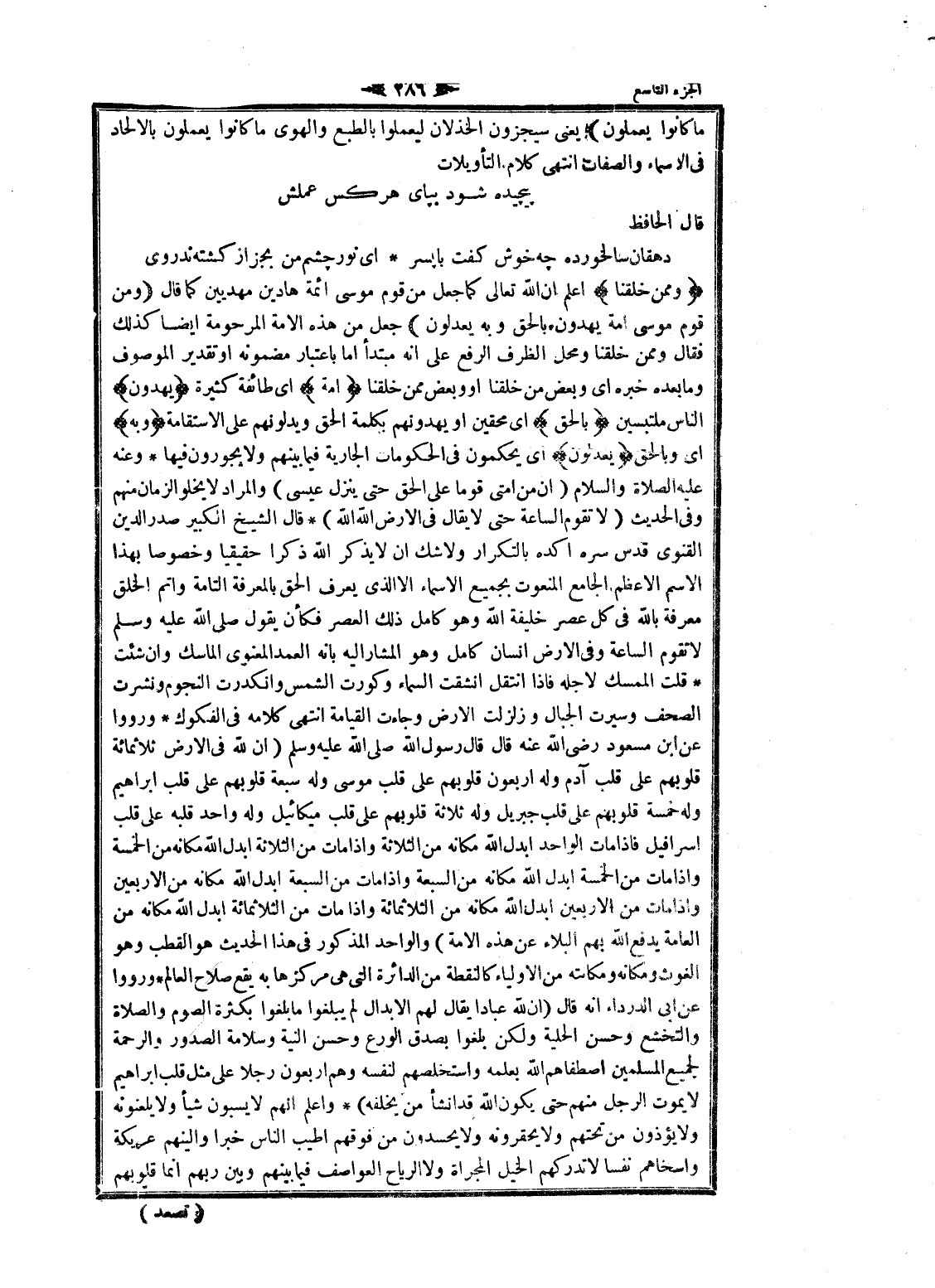 وَمِمَّنْ خَلَقْنا اعلم ان الله تعالى كما جعل من قوم موسى ائمة هادين مهديين كما قال وَمِنْ قَوْمِ مُوسى أُمَّةٌ يَهْدُونَ بِالْحَقِّ وَبِهِ يَعْدِلُونَ جعل من هذه الامة المرحومة ايضا كذلك فقال وممن خلقنا ومحل الظرف الرفع على انه مبتدأ اما باعتبار مضمونه او تقدير الموصوف وما بعده خبره اى وبعض من خلقنا او وبعض ممن خلقنا أُمَّةٌ اى طائفة كثيرة يَهْدُونَ الناس ملتبسين بِالْحَقِّ اى محقين او يهدونهم بكلمة الحق ويدلونهم على الاستقامة وَبِهِ اى وبالحق يَعْدِلُونَ اى يحكمون فى الحكومات الجارية فيما بينهم ولا يجورون فيها وعنه عليه الصلاة والسلام (ان من أمتي قوما على الحق حتى ينزل عيسى) والمراد لا يخلوا الزمان منهم وفى الحديث (لا تقوم الساعة حتى لا يقال فى الأرض الله الله) قال الشيخ الكبير صدر الدين القنوى قدس سره أكده بالتكرار ولا شك ان لا يذكر الله ذكرا حقيقيا وخصوصا بهذا الاسم الأعظم الجامع المنعوت بجميع الأسماء الا الذي يعرف الحق بالمعرفة التامة وأتم الخلق معرفة بالله فى كل عصر خليفة الله وهو كامل ذلك العصر فكأن يقول صلى الله عليه وسلم لا تقوم الساعة وفى الأرض انسان كامل وهو المشار اليه بانه العمد المعنوي الماسك وان شئت قلت الممسك لاجله فاذا انتقل انشقت السماء وكورت الشمس وانكدرت النجوم ونشرت الصحف وسيرت الجبال وزلزلت الأرض وجاءت القيامة انتهى كلامه فى الفكوك ورووا عن ابن مسعود رضى الله عنه قال قال رسول الله صلى الله عليه وسلم (ان لله فى الأرض ثلاثمائة قلوبهم على قلب آدم وله أربعون قلوبهم على قلب موسى وله سبعة قلوبهم على قلب ابراهيم وله خمسة قلوبهم على قلب جبريل وله ثلاثة قلوبهم على قلب ميكائيل وله واحد قلبه على قلب اسرافيل فاذا مات الواحد أبدل الله مكانه من الثلاثة وإذا مات من الثلاثة أبدل الله مكانه من الخمسة وإذا مات من الخمسة أبدل الله مكانه من السبعة وإذا مات من السبعة أبدل الله مكانه من الأربعين وإذا مات من الأربعين أبدل الله مكانه من الثلاثمائة وإذا مات من الثلاثمائة أبدل الله مكانه من العامة يدفع الله بهم البلاء عن هذه الامة) والواحد المذكور فى هذا الحديث هو القطب وهو الغوث ومكانه ومكانته من الأولياء كالنقطة من الدائرة التي هى مركزها به يقع صلاح العالم ورووا عن ابى الدرداء انه قال (ان لله عبادا يقال لهم الابدال لم يبلغوا ما بلغوا بكثرة الصوم والصلاة والتخشع وحسن الحلية ولكن بلغوا بصدق الورع وحسن النية وسلامة الصدور والرحمة لجميع المسلمين اصطفاهم الله بعلمه واستخلصهم لنفسه وهم أربعون رجلا على مثل قلب ابراهيم لا يموت الرجل منهم حتى يكون الله قد انشأ من يخلفه) واعلم انهم لا يسبون شيأ ولا يلعنونه ولا يؤذون من تحتهم ولا يحقرونه ولا يحسدون من فوقهم أطيب الناس خبرا وألينهم عريكة وأسخاهم نفسا لا تدركهم الخيل المجراة ولا الرياح العواصف فيما بينهم وبين ربهم انما قلوبهم