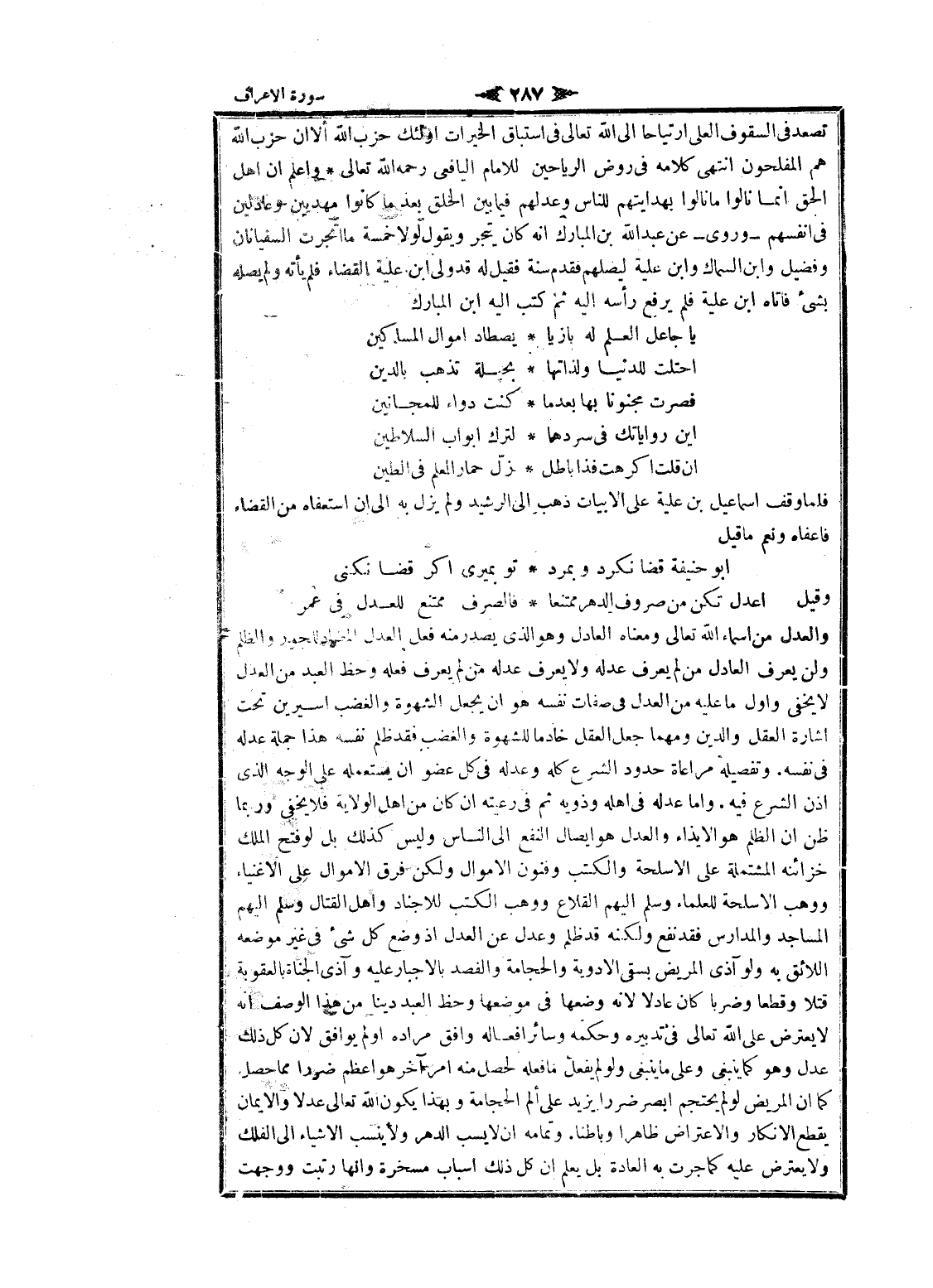 تصعد فى السقوف العلى ارتياحا الى الله تعالى فى استباق الخيرات أولئك حزب الله ألا ان حزب الله ألا ان حزب الله هم المفلحون انتهى كلامه فى روض الرياحين للامام اليافعي رحمه الله تعالى واعلم ان اهل الحق انما نالوا ما نالوا بهدايتهم للناس وعدلهم فيما بين الخلق بعد ما كانوا مهديين وعادلين فى أنفسهم- وروى- عن عبد الله بن المبارك انه كان يتجر ويقول لولا خمسة ما اتجرت السفيانان وفضيل وابن السماك وابن علية ليصلهم فقدم سنة فقيل له قد ولى ابن علية القضاء فلم يأته ولم يصله بشىء فاتاه ابن علية فلم يرفع رأسه اليه ثم كتب اليه ابن المبارك