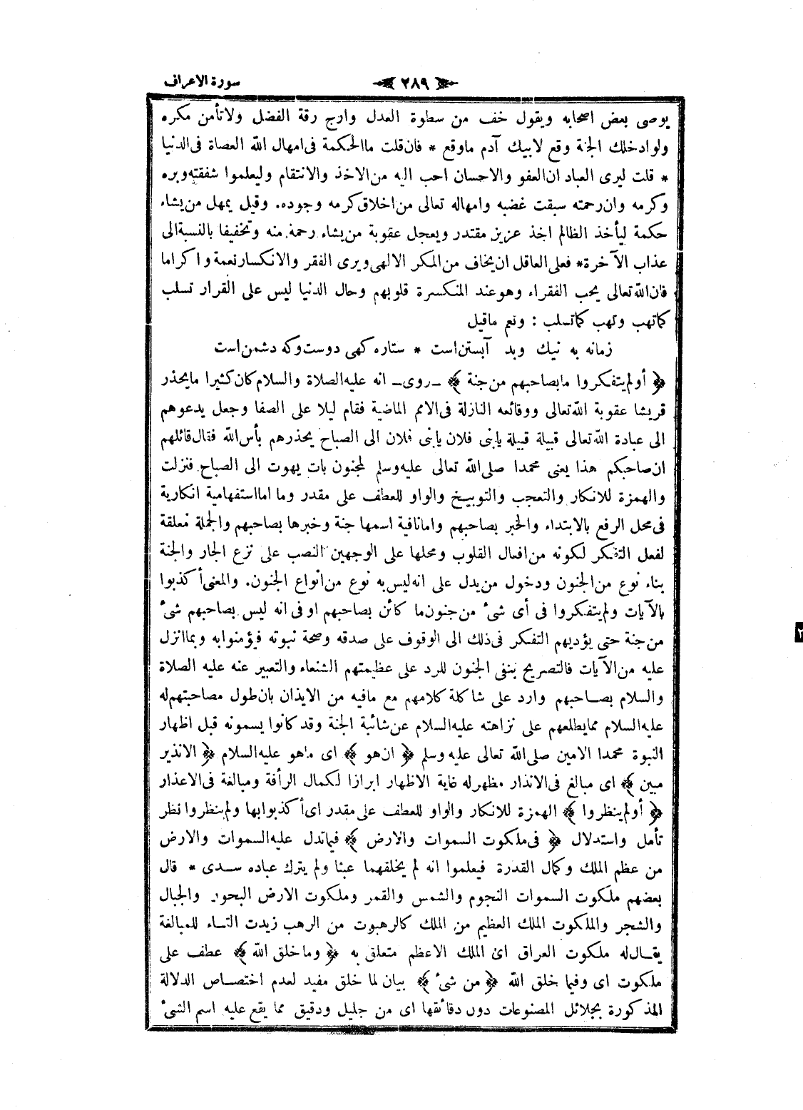 أَوَلَمْ يَتَفَكَّرُوا ما بِصاحِبِهِمْ مِنْ جِنَّةٍ- روى- انه عليه الصلاة والسلام كان كثيرا ما يحذر قريشا عقوبة الله تعالى ووقائعه النازلة فى الأمم الماضية فقام ليلا على الصفا وجعل يدعوهم الى عبادة الله تعالى قبيلة قبيلة يا بنى فلان يا بنى فلان الى الصباح يحذرهم بأس الله فقال قائلهم ان صاحبكم هذا يعنى محمدا صلى الله تعالى عليه وسلم لمجنون بات يهوت الى الصباح فنزلت والهمزة للانكار والتعجب والتوبيخ والواو للعطف على مقدر وما اما استفهامية انكارية فى محل الرفع بالابتداء والخبر بصاحبهم واما نافية اسمها جنة وخبرها بصاحبهم والجملة معلقة لفعل التفكر لكونه من افعال القلوب ومحلها على الوجهين النصب على نزع الجار والجنة بناء نوع من الجنون ودخول من يدل على انه ليس به نوع من انواع الجنون. والمعنى أكذبوا بالآيات ولم يتفكروا فى أي شىء من جنون ما كائن بصاحبهم او فى انه ليس بصاحبهم شىء من جنة حتى يؤديهم التفكر فى ذلك الى الوقوف على صدقه وصحة نبوته فيؤمنوا به وبما انزل عليه من الآيات فالتصريح بنفي الجنون للرد على عظيمتهم الشنعاء والتعبير عنه عليه الصلاة والسلام بصاحبهم وارد على شاكلة كلامهم مع ما فيه من الإيذان بان طول مصاحبتهم له عليه السلام مما يطلعهم على نزاهته عليه السلام عن شائبة الجنة وقد كانوا يسمونه قبل اظهار النبوة محمدا الامين صلى الله تعالى عليه وسلم إِنْ هُوَ اى ما هو عليه السلام إِلَّا نَذِيرٌ مُبِينٌ اى مبالغ فى الانذار مظهر له غاية الإظهار ابرازا لكمال الرأفة ومبالغة فى الاعذار أَوَلَمْ يَنْظُرُوا الهمزة للانكار والواو للعطف على مقدر اى أكذبوا بها ولم ينظروا نظر تأمل واستدلال فِي مَلَكُوتِ السَّماواتِ وَالْأَرْضِ فيما تدل عليه السموات والأرض من عظم الملك وكمال القدرة فيعلموا انه لم يخلقهما عبثا ولم يترك عباده سدى قال بعضهم ملكوت السموات النجوم والشمس والقمر وملكوت الأرض البحور والجبال والشجر والملكوت الملك العظيم من الملك كالرهبوت من الرهب زيدت التاء للمبالغة يقال له ملكوت العراق اى الملك الأعظم متعلق به وَما خَلَقَ اللَّهُ عطف على ملكوت اى وفيما خلق الله مِنْ شَيْءٍ بيان لما خلق مفيد لعدم اختصاص الدلالة المذكورة بجلائل المصنوعات دون دقائقها اى من جليل ودقيق مما يقع عليه اسم الشيء