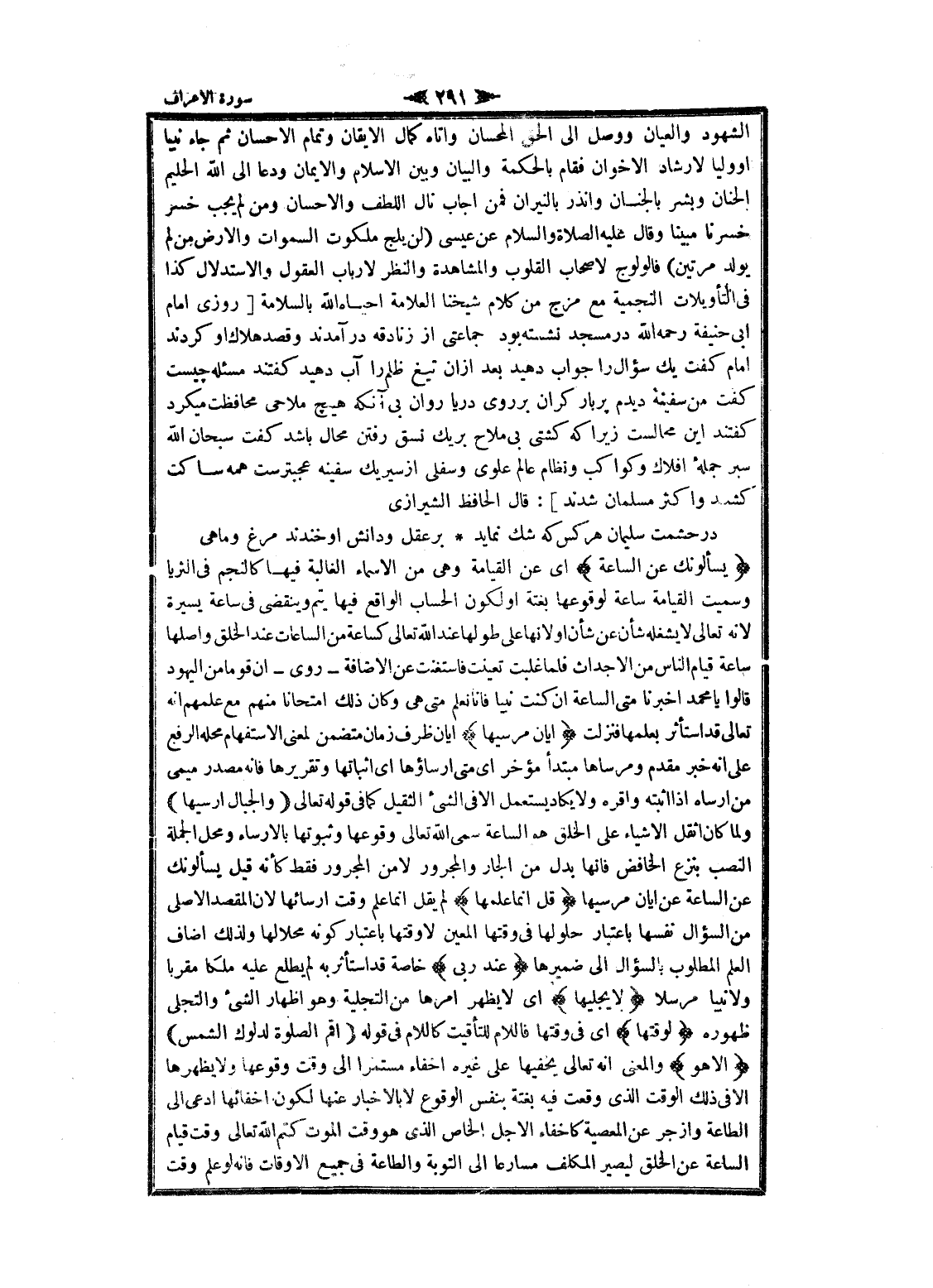يَسْئَلُونَكَ عَنِ السَّاعَةِ اى عن القيامة وهى من الأسماء الغالبة فيها كالنجم فى الثريا وسميت القيامة ساعة لوقوعها بغتة او لكون الحساب الواقع فيها يتم وينقضى فى ساعة يسيرة لانه تعالى لا يشغله شأن عن شأن أو لأنها على طولها عند الله تعالى كساعة من الساعات عند الخلق وأصلها ساعة قيام الناس من الأجداث فلما غلبت تعينت فاستغنت عن الاضافة- روى- ان قوما من اليهود قالوا يا محمد أخبرنا متى الساعة ان كنت نبيا فانا نعلم متى هى وكان ذلك امتحانا منهم مع علمهم انه تعالى قد استأثر بعلمها فنزلت أَيَّانَ مُرْساها أيان ظرف زمان متضمن لمعنى الاستفهام محله الرفع على انه خبر مقدم ومرساها مبتدأ مؤخر اى متى ارساؤها اى إثباتها وتقريرها فانه مصدر ميمى من ارساه إذا أثبته وأقره ولا يكاد يستعمل الا فى الشيء الثقيل كما فى قوله تعالى وَالْجِبالَ أَرْساها ولما كان أثقل الأشياء على الخلق هو الساعة سمى الله تعالى وقوعها وثبوتها بالارساء ومحل الجملة النصب بنزع الخافض فانها بدل من الجار والمجرور لا من المجرور فقط كأنه قيل يسألونك عن الساعة عن أيان مرسيها قُلْ إِنَّما عِلْمُها لم يقل انما علم وقت ارسائها لان المقصد الأصلي من السؤال نفسها باعتبار حلولها فى وقتها المعين لا وقتها باعتبار كونه محلالها ولذلك أضاف العلم المطلوب بالسؤال الى ضميرها عِنْدَ رَبِّي خاصة قد استأثر به لم يطلع عليه ملكا مقربا ولانبيا مرسلا لا يُجَلِّيها اى لا يظهر أمرها من التجلية وهو اظهار الشيء والتجلي ظهوره لِوَقْتِها اى فى وقتها فاللام للتأقيت كاللام فى قوله أَقِمِ الصَّلاةَ لِدُلُوكِ الشَّمْسِ إِلَّا هُوَ والمعنى انه تعالى يخفيها على غيره إخفاء مستمرا الى وقت وقوعها ولا يظهرها الا فى ذلك الوقت الذي وقعت فيه بغتة بنفس الوقوع لا بالأخبار عنها لكون اخفائها ادعى الى الطاعة وازجر عن المعصية كاخفاء الاجل الخاص الذي هو وقت الموت كتم الله تعالى وقت قيام الساعة عن الخلق ليصير المكلف مسارعا الى التوبة والطاعة فى جميع الأوقات فانه لو علم وقت