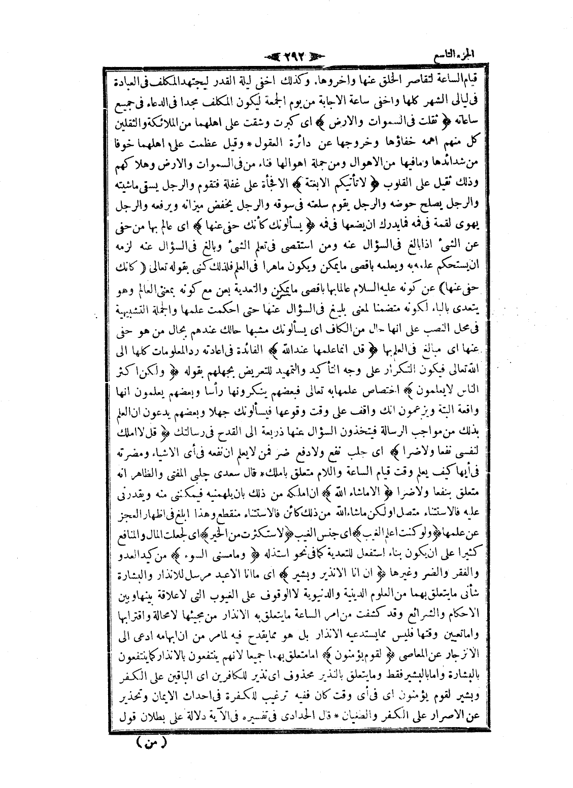 قيام الساعة لتقاصر الخلق عنها وأخروها. وكذلك أخفى ليلة القدر ليجتهد المكلف فى العبادة فى ليالى الشهر كلها وأخفى ساعة الاجابة من يوم الجمعة ليكون المكلف مجدا فى الدعاء فى جميع ساعاته ثَقُلَتْ فِي السَّماواتِ وَالْأَرْضِ اى كبرت وشقت على أهلهما من الملائكة والثقلين كل منهم أهمه خفاؤها وخروجها عن دائرة العقول وقيل عظمت على أهلهما خوفا من شدائدها وما فيها من الأهوال ومن جملة أهوالها فناء من فى السموات والأرض وهلاكهم وذلك ثقيل على القلوب لا تَأْتِيكُمْ إِلَّا بَغْتَةً الا فجأة على غفلة فتقوم والرجل يسقى ما شيته والرجل يصلح حوضه والرجل يقوم سلعته فى سوقه والرجل يخفض ميزانه ويرفعه والرجل يهوى لقمة فى فمه فما يدرك ان يضعها فى فمه يَسْئَلُونَكَ كَأَنَّكَ حَفِيٌّ عَنْها اى عالم بها من حفى عن الشيء إذا بالغ فى السؤال عنه ومن استقصى فى تعلم الشيء وبالغ فى السؤال عنه لزمه ان يستحكم علمه به ويعلمه بأقصى ما يمكن ويكون ماهرا فى العلم فلذلك كنى بقوله تعالى كَأَنَّكَ حَفِيٌّ عَنْها عن كونه عليه السلام عالما بها بأقصى ما يمكن والتعدية بعن مع كونه بمعنى العالم وهو يتعدى بالباء لكونه متضمنا لمعنى بليغ فى السؤال عنها حتى أحكمت علمها والجملة التشبيهية فى محل النصب على انها حال من الكاف اى يسألونك مشبها حالك عندهم بحال من هو حفى عنها اى مبالغ فى العلم بها قُلْ إِنَّما عِلْمُها عِنْدَ اللَّهِ الفائدة فى إعادته رد المعلومات كلها الى الله تعالى فيكون التكرار على وجه التأكيد والتمهيد للتعريض بجهلهم بقوله وَلكِنَّ أَكْثَرَ النَّاسِ لا يَعْلَمُونَ اختصاص علمها به تعالى فبعضهم ينكرونها رأسا وبعضهم يعلمون انها واقعة البتة ويزعمون انك واقف على وقت وقوعها فيسألونك جهلا وبعضهم يدعون ان العلم بذلك من مواجب الرسالة فيتخذون السؤال عنها ذريعة الى القدح فى رسالتك قُلْ لا أَمْلِكُ لِنَفْسِي نَفْعاً وَلا ضَرًّا