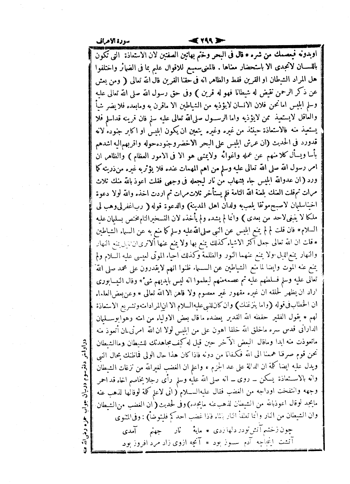 او بدونه فيعصمك من شره قال فى البحر وختم بهاتين الصفتين لان الاستعاذة التي تكون باللسان لا تجدى الا باستحضار معناها. فالمعنى سميع للاقوال عليم بما فى الضمائر واختلفوا هل المراد الشيطان او القرين فقط والظاهر انه فى حقنا القرين قال الله تعالى وَمَنْ يَعْشُ عَنْ ذِكْرِ الرَّحْمنِ نُقَيِّضْ لَهُ شَيْطاناً فَهُوَ لَهُ قَرِينٌ وفى حق رسول الله صلى الله تعالى عليه وسلم إبليس اما نحن فلان الإنسان لا يؤذيه من الشياطين الا ما قرن به وما بعده فلا يضر شيأ والعاقل لا يستعيذ ممن لا يؤذيه واما الرسول صلى الله تعالى عليه وسلم فان قرينه قد اسلم فلا يستعيذ منه فالاستعاذة حينئذ من غيره وغيره يتعين ان يكون إبليس او أكابر جنوده لانه قدورد فى الحديث (ان عرش إبليس على البحر الأخضر وجنوده حوله وأقربهم اليه أشدهم بأسا ويسأل كلا منهم عن عمله واغوائه ولا يمشى هو الا فى الأمور العظام) والظاهر