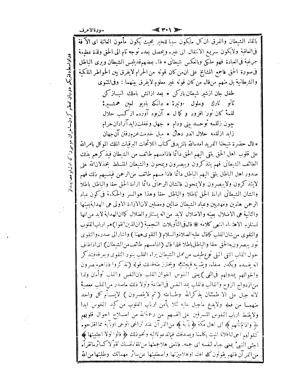 بإلقاء الشيطان والفرق ان كل ما يكون سببا للخير بحيث يكون مأمون الغائلة اى الآفة فى العاقبة ولا يكون سريع الانتقال الى غيره ويحصل بعده توجه تام الى الحق ولذة عظيمة مرغبة فى العبادة فهو ملكى وبالعكس شيطانى قال بعضهم قد يلبس الشيطان ويرى الباطل فى صورة الحق فاجمع المشايخ على ان من كان قوته من الحرام لا يفرق بين الخواطر الملكية والشيطانية بل منهم من قال من كان قوته غير معلوم لا يفرق بينهما: وفى المثنوى