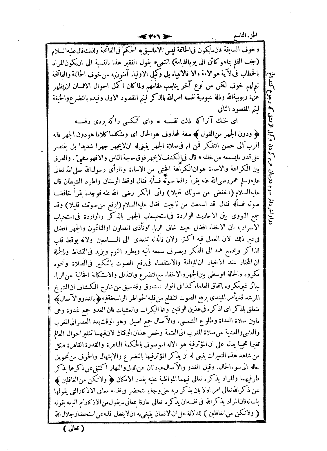 وخوف السابقة فان ما يكون فى الخاتمة ليس الا ما سبق به الحكم فى الفاتحة ولذلك قال عليه السلام (جف القلم بما هو كائن الى يوم القيامة) انتهى يقول الفقير هذا بالنسبة الى ان يكون المراد بالخطاب فى الآية هو الامة والا فالانبياء بل وكمل الأولياء آمنون به من خوف الخاتمة والفاتحة نعم لهم خوف لكن من نوع آخر يناسب مقامهم ولما كان أكمل احوال الإنسان ان يظهر عزة ربوبية الله وذلة عبودية نفسه امر الله بالذكر ليتم المقصود الاول وقيده بالتضرع والخيفة ليتم المقصود الثاني