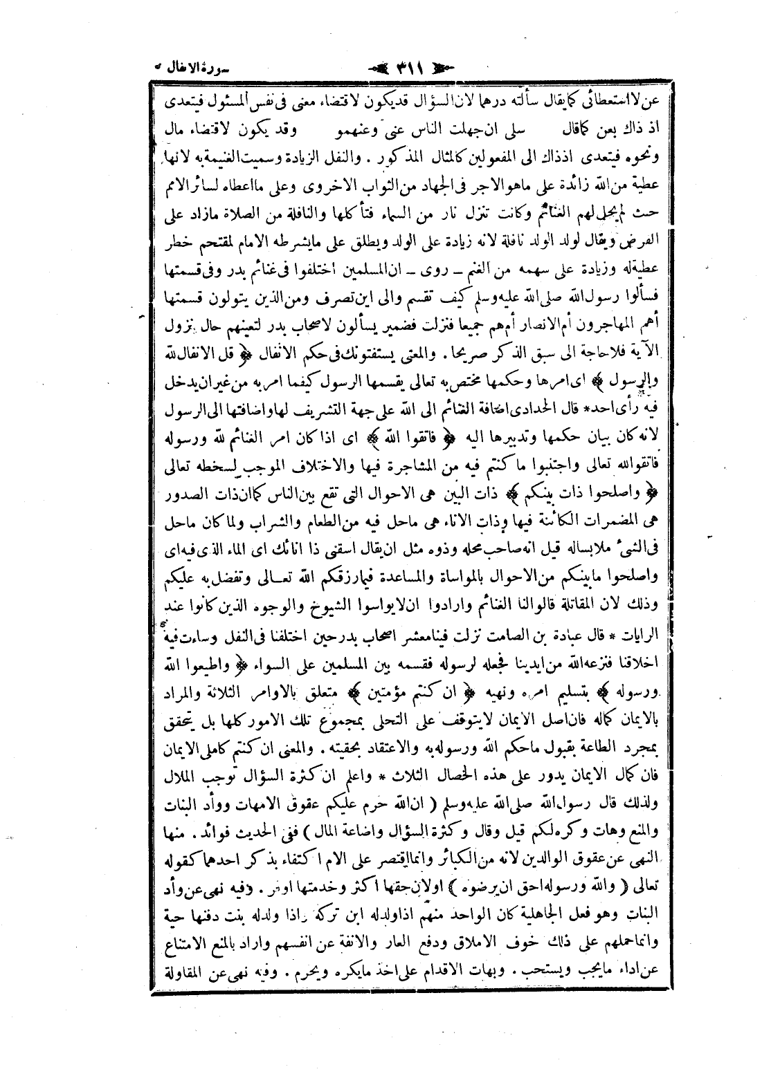 عن لا استعطائى كما يقال سألته درهما لان السؤال قد يكون لاقتضاء معنى فى نفس المسئول فبتعدى إذ ذاك بعن كما قال سلى ان جهلت الناس عنى وعنهمو وقد يكون لاقتضاء مال ونحوه فيتعدى إذ ذاك الى المفعولين كالمثال المذكور. والنفل الزيادة وسميت الغنيمة به لانها عطية من الله زائدة على ما هو الاجر فى الجهاد من الثواب الأخروي وعلى ما أعطاه لسائر الأمم حيث لم بحل لهم الغنائم وكانت تنزل نار من السماء فتأكلها والنافلة من الصلاة مازاد على الفرض ويقال لولد الولد نافلة لانه زيادة على الولد ويطلق على ما يشرطه الامام لمقتحم خطر عطية له وزيادة على سهمه من الغنم- روى- ان المسلمين اختلفوا فى غنائم بدر وفى قسمتها فسألوا رسول الله صلى الله عليه وسلم كيف تقسم والى اين تصرف ومن الذين يتولون قسمتها أهم المهاجرون أم الأنصار أم هم جميعا فنزلت فضمير يسألون لاصحاب بدر لتعينهم حال نزول الآية فلا حاجة الى سبق الذكر صريحا. والمعنى يستفتونك فى حكم الأنفال قُلِ الْأَنْفالُ لِلَّهِ وَالرَّسُولِ اى أمرها وحكمها مختص به تعالى يقسمها الرسول كيفما امر به من غير ان يدخل فيه رأى أحد قال الحدادي اضافة الغنائم الى الله على جهة التشريف لها واضافتها الى الرسول لانه كان بيان حكمها وتدبيرها اليه فَاتَّقُوا اللَّهَ اى إذا كان امر الغنائم لله ورسوله فاتقو الله تعالى واجتنبوا ما كنتم فيه من المشاجرة فيها والاختلاف الموجب لسخطه تعالى وَأَصْلِحُوا ذاتَ بَيْنِكُمْ ذات البين هى الأحوال التي تقع بين الناس كما ان ذات الصدور هى المضرات الكائنة فيها وذات الإناء هى ما حل فيه من الطعام والشراب ولما كان ما حل فى الشيء ملابسا له قيل انه صاحب محله وذوه مثل ان يقال اسقني ذا انائك اى الماء الذي فيه اى وأصلحوا ما بينكم من الأحوال بالمواساة والمساعدة فيما رزقكم الله تعالى وتفضل به عليكم وذلك لان المقاتلة قالوا لنا الغنائم وأرادوا ان لا يواسوا الشيوخ والوجوه الذين كانوا عند الرايات قال عبادة بن الصامت نزلت فينا معشر اصحاب بدر حين اختلفنا فى النفل وساءت فيه أخلاقنا فنزعه الله من أيدينا فجعله لرسوله فقسمه بين المسلمين على السواء وَأَطِيعُوا اللَّهَ وَرَسُولَهُ بتسليم امره ونهيه إِنْ كُنْتُمْ مُؤْمِنِينَ متعلق بالأوامر الثلاثة والمراد بالايمان كماله فان اصل الايمان لا يتوقف على التحلي بمجموع تلك الأمور كلها بل يتحقق بمجرد الطاعة بقبول ما حكم الله ورسوله به والاعتقاد بحقيته. والمعنى ان كنتم كاملى الايمان فان كمال الايمان يدور على هذه الخصال الثلاث واعلم ان كثرة السؤال توجب الملال ولذلك قال رسول الله صلى الله عليه وسلم (ان الله حرم عليكم عقوق الأمهات ووأد البنات والمنع وهات وكره لكم قيل وقال وكثرة السؤال واضاعة المال) ففى الحديث فوائد. منها النهى عن عقوق الوالدين لانه من الكبائر وانما اقتصر على الام اكتفاء بذكر أحدهما كقوله تعالى وَاللَّهُ وَرَسُولُهُ أَحَقُّ أَنْ يُرْضُوهُ او لان حقها اكثر وخدمتها أوفر. وفيه نهى عن وأد البنات وهو فعل الجاهلية كان الواحد منهم إذا ولد له ابن تركه وإذا ولد له بنت دفنها حية وانما حملهم على ذلك خوف الاملاق ودفع العار والانفة عن أنفسهم وأراد بالمنع الامتناع عن أداء ما يجب ويستحب. وبهات الاقدام على أخذ ما يكره ويحرم. وفيه نهى عن المقاولة