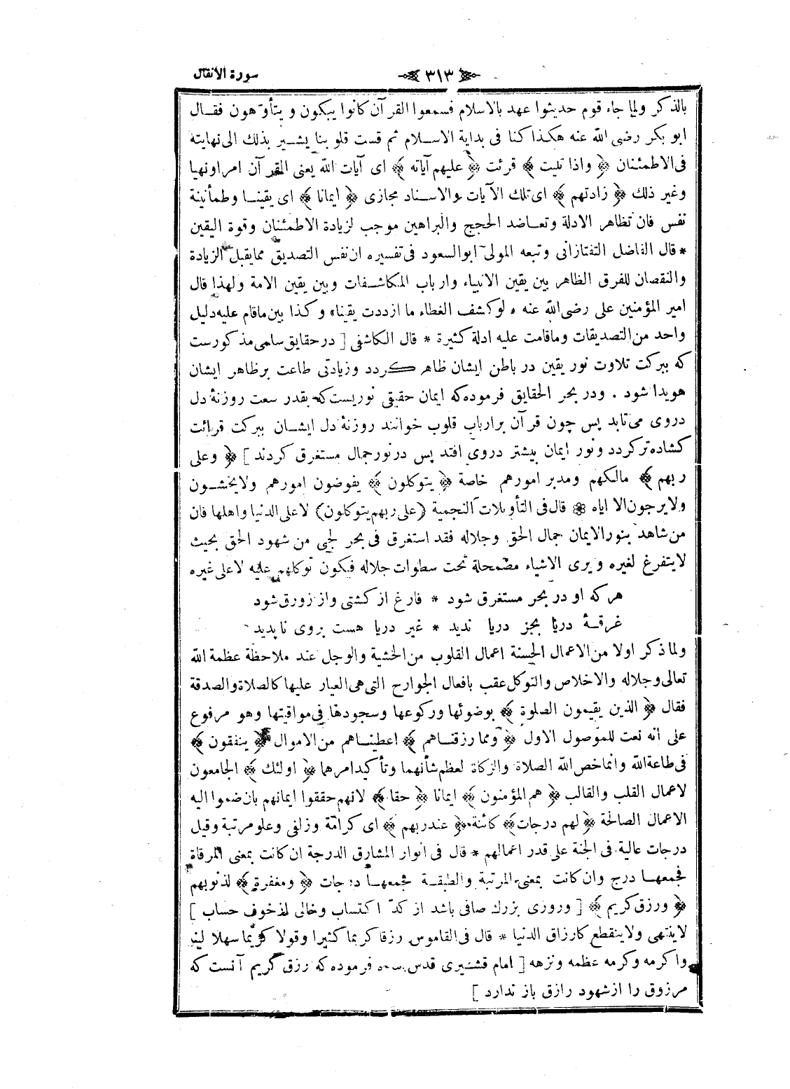 بالذكر ولما جاء قوم حديثوا عهد بالإسلام فسمعوا القرآن كانوا يبكون ويتأوّهون فقال أبو بكر رضى الله عنه هكذا كنا فى بداية الإسلام ثم قست قلوبنا يشير بذلك الى نهايته فى الاطمئنان وَإِذا تُلِيَتْ قرئت عَلَيْهِمْ آياتُهُ اى آيات الله يعنى القرآن امر او نهيا وغير ذلك زادَتْهُمْ اى تلك الآيات والاسناد مجازى إِيماناً اى يقينا وطمأنينة نفس فان تظاهر الادلة وتعاضد الحجج والبراهين موجب لزيادة الاطمئنان وقوة اليقين قال الفاضل التفتازانيّ وتبعه المولى ابو السعود فى تفسيره ان نفس التصديق مما يقبل الزيادة والنقصان للفرق الظاهر بين يقين الأنبياء وارباب المكاشفات وبين يقين الامة ولهذا قال امير المؤمنين على رضى الله عنه «لو كشف الغطاء ما ازددت يقينا» وكذا بين ما قام عليه دليل واحد من التصديقات وما قامت عليه ادلة كثيرة قال الكاشفى [در حقايق سلمى مذكورست كه ببركت تلاوت نور يقين در باطن ايشان ظاهر كردد وزيادتى طاعت بر ظاهر ايشان هويدا شود. ودر بحر الحقائق فرموده كه ايمان حقيقى نوريست كه بقدر سعت روزنه دل در وى مى تابد پس چون قرآن بر ارباب قلوب خوانند روزنه دل ايشان ببركت قرائت كشاده تر كردد ونور ايمان بيشتر در وى افتد پس در نور جمال مستغرق كردند] وَعَلى رَبِّهِمْ مالكهم ومدبر أمورهم خاصة يَتَوَكَّلُونَ يفوضون أمورهم ولا يخشون ولا يرجون الا إياه قال فى التأويلات النجمية عَلى رَبِّهِمْ يَتَوَكَّلُونَ لا على الدنيا وأهلها فان من شاهد بنور الايمان جمال الحق وجلاله فقد استغرق فى بحر لجى من شهود الحق بحيث لا يتفرغ لغيره ويرى الأشياء مضمحلة تحت سطوات جلاله فيكون توكلهم عليه لا على غيره