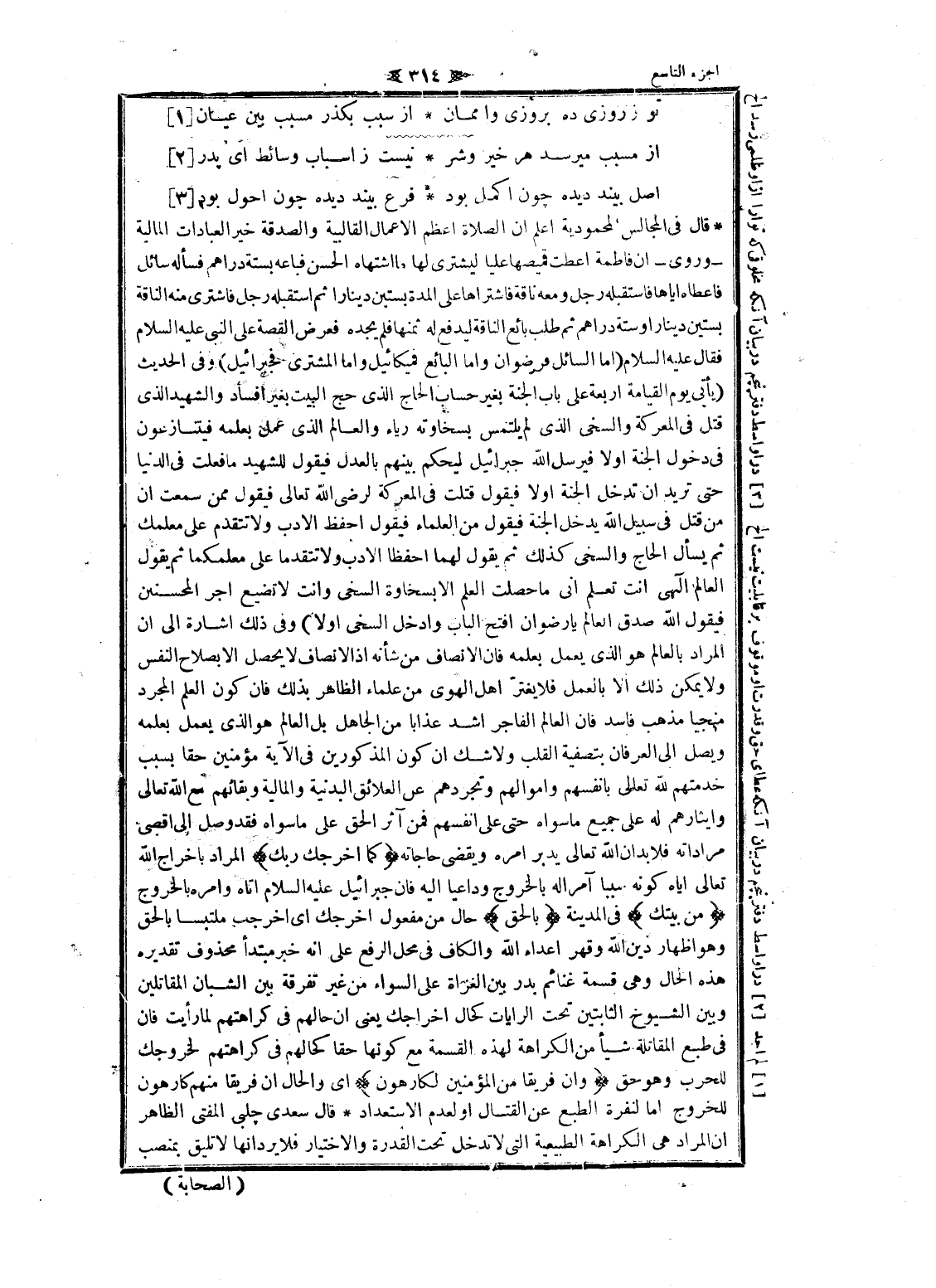 قال فى المجالس المحمودية اعلم ان الصلاة أعظم الأعمال القالبية والصدقة خير العبادات المالية- وروى- ان فاطمة اعطت قميصها عليا ليشترى لها ما اشتهاه الحسن فباعه بستة دراهم فسأله سائل فاعطاه إياها فاستقبله رجل ومعه ناقة فاشتراها على المدة بستين دينارا ثم استقبله رجل فاشترى منه الناقة بستين دينار او ستة دراهم ثم طلب بائع الناقة ليدفع له ثمنها فلم يجده فعرض القصة على النبي عليه السلام فقال عليه السلام (اما السائل فرضوان واما البائع فميكائيل واما المشترى فجبرائيل) وفى الحديث (يأتى يوم القيامة اربعة على باب الجنة بغير حساب الحاج الذي حج البيت بغير إفساد والشهيد الذي قتل فى المعركة والسخي الذي لم يلتمس بسخاوته رياء والعالم الذي عمل بعلمه فيتنازعون فى دخول الجنة اولا فيرسل الله جبرائيل ليحكم بينهم بالعدل فيقول للشهيد ما فعلت فى الدنيا حتى تريد ان تدخل الجنة او لا فيقول قتلت فى المعركة لرضى الله تعالى فيقول ممن سمعت ان من قتل فى سبيل الله يدخل الجنة فيقول من العلماء فيقول احفظ الأدب ولا تتقدم على معلمكما ثم يسأل الحجاج والسخي كذلك ثم يقول لهما احفظا الأدب ولا تقدما على معلمكما ثم يقول العالم إلهى أنت تعلم انى ما حصلت العلم الا بسخاوة السخي وأنت لا تضيع اجر المحسنين فيقول الله صدق العالم يا رضوان افتح الباب وادخل السخي اولا) وفى ذلك اشارة الى ان المراد بالعالم هو الذي يعمل بعلمه فان الانصاف من شأنه إذ الانصاف لا يحصل الا بصلاح النفس ولا يمكن ذلك الا بالعمل فلا يغترّ اهل الهوى من علماء الظاهر بذلك فان كون العلم المجرد منجيا مذهب فاسد فان العالم الفاجر أشد عذابا من الجاهل بل العالم هو الذي يعمل بعلمه ويصل الى العرفان بتصفية القلب ولا شك ان كون المذكورين فى الآية مؤمنين حقا بسبب خدمتهم لله تعالى بانفسهم وأموالهم وتجردهم عن العلائق البدنية والمالية وبقائهم مع الله تعالى وإيثارهم له على جميع ما سواه حتى على أنفسهم فمن آثر الحق على ما سواه فقد وصل الى أقصى مراداته فلا بد ان الله تعالى يدبر امره ويقضى حاجاته كَما أَخْرَجَكَ رَبُّكَ المراد بإخراج الله تعالى إياه كونه سببا آمر اله بالخروج وداعيا اليه فان جبرائيل عليه السلام أتاه وامره بالخروج مِنْ بَيْتِكَ فى المدينة بِالْحَقِّ حال من مفعول اخرجك اى اخرجك ملتبسا بالحق وهو اظهار دين الله وقهر اعداء الله والكاف فى محل الرفع على انه خبر مبتدأ محذوف تقديره هذه الحال وهى قسمة غنائم بدر بين الغزاة على السواء من غير تفرقة بين الشبان المقاتلين وبين الشيوخ الثابتين تحت الرايات كحال اخراجك يعنى ان حالهم فى كراهتهم لما رأيت فان فى طبع المقاتلة شيأ من الكراهة لهذه القسمة مع كونها حقا كحالهم فى كراهتهم لخروجك للحرب وهو حق وَإِنَّ فَرِيقاً مِنَ الْمُؤْمِنِينَ لَكارِهُونَ اى والحال ان فريقا منهم كارهون للخروج اما لنفرة الطبع عن القتال او لعدم الاستعداد قال سعدى چلبى المفتى الظاهر ان المراد هى الكراهة الطبيعة التي لا تدخل تحت القدرة والاختيار فلا يرد انها لا تليق بمنصب