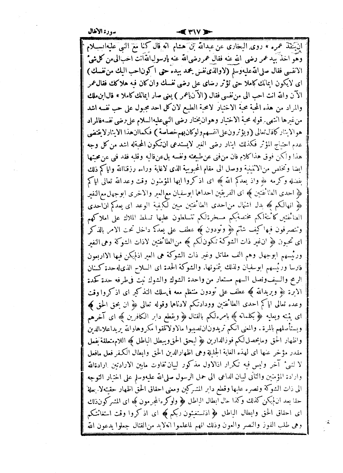 ان ينفد عمره روى البخاري عن عبد الله بن هشام انه قال كنا مع النبي عليه السلام وهو أخذ بيد عمر رضى الله عنه فقال عمر رضى الله عنه يا رسول الله أنت أحب الى من كل شىء إلا نفسي فقال صلى الله عليه وسلم (لا والذي نفس محمد بيده حتى أكون أحب إليك من نفسك) اى لا يكون إيمانك كاملا حتى تؤثر رضاى على رضى نفسك وان كان فيه هلاكك فقال عمر الآن والله أنت أحب الى من نفسى فقال (الآن يا عمر) يعنى صار إيمانك كاملا قال ابن ملك والمراد من هذه المحبة محبة الاختيار لا محبة الطبع لان كل أحد مجبول على حب نفسه أشد من غيرها انتهى. قوله محبة الاختيار وهو ان يختار رضى النبي عليه السلام على رضى نفسه فالمراد هو الإيثار كما قال تعالى وَيُؤْثِرُونَ عَلى أَنْفُسِهِمْ وَلَوْ كانَ بِهِمْ خَصاصَةٌ فكما ان هذا الإيثار لا يقتضى عدم احتياج المؤثر فكذلك إيثار رضى الغير لا يستدعى ان تكون المحبة له أشد من كل وجه هذا ولكن فوق هذا كلام فان من فنى عن طبيعته ونفسه بل عن قالبه وقلبه فقد فنى عن محبتها ايضا وتخلص من الاثنينية ووصل الى مقام المحبوبية الذي لا غاية وراءه ورزقنا الله وإياكم ذلك بفضله وكرمه وَإِذْ يَعِدُكُمُ اللَّهُ اى اذكروا ايها المؤمنون وقت وعد الله تعالى إياكم إِحْدَى الطَّائِفَتَيْنِ اى الفريقين إحداهما ابو سفيان مع العير والاخرى ابو جهل مع النفير أَنَّها لَكُمْ بدل اشتمال من احدى الطائفتين مبين لكيفية الوعد اى يعدكم ان احدى الطائفتين كائنة لكم مختصة بكم مسخرة لكم تتسلطون عليها تسلط الملاك على املاكهم وتتصرفون فيها كيف شئتم وَتَوَدُّونَ عطف على يعدكم داخل تحت الأمر بالذكر اى تحبون أَنَّ غَيْرَ ذاتِ الشَّوْكَةِ تَكُونُ لَكُمْ من الطائفتين لا ذات الشوكة وهى النفير ورئيسهم ابو جهل وهم الف مقاتل وغير ذات الشوكة هى العير إذ لم يكن فيها الا أربعون فارسا ورئيسهم ابو سفيان ولذلك يتمنونها. والشوكة الحدة اى السلاح الذي له حدة كسنان الرمح والسيف ونصل السهم مستعار من واحدة الشوك والشوك نبت فى طرفه حدة كحدة الابرة وَيُرِيدُ اللَّهُ عطف على تودون منتظم معه فى سلك التذكير اى اذكروا وقت وعده تعالى إياكم احدى الطائفتين وودادتكم لادناهما وقوله تعالى أَنْ يُحِقَّ الْحَقَّ اى يثبته ويعليه بِكَلِماتِهِ بامره لكم بالقتال وَيَقْطَعَ دابِرَ الْكافِرِينَ اى آخرهم ويستأصلهم بالمرة. والمعنى انكم تريدون ان تصيبوا مالا ولا تلقوا مكروها والله يريد إعلاء الدين واظهار الحق وما يحصل لكم فوز الدارين لِيُحِقَّ الْحَقَّ وَيُبْطِلَ الْباطِلَ اللام متعلقة بفعل مقدر مؤخر عنها اى لهذه الغاية الجليلة وهى اظهار الدين الحق وابطال الكفر فعل ما فعل لا لشى آخر وليس فيه تكرار إذ الاول مذكور لبيان تفاوت ما بين الإرادتين ارادة الله وارادة المؤمنين والثاني لبيان الداعي الى حمل الرسول صلى الله عليه وسلم على اختيار التوجه الى ذات الشوكة ونصره عليها وقطع دابر المشركين ومعنى احقاق الحق اظهار حقيته لا جعله حقا بعد ان لم يكن كذلك وكذا حال ابطال الباطل وَلَوْ كَرِهَ الْمُجْرِمُونَ اى المشركون ذلك اى احقاق الحق وابطال الباطل إِذْ تَسْتَغِيثُونَ رَبَّكُمْ اى اذكروا وقت استغاثتكم وهى طلب الفوز والنصر والعون وذلك انهم لما علموا انه لا بد من القتال جعلوا يدعون الله