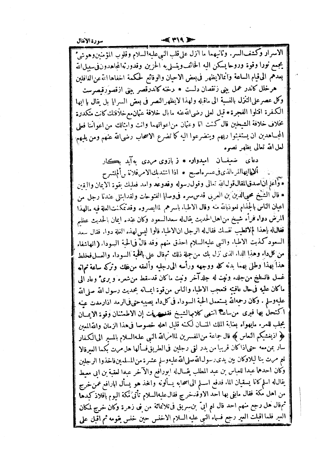 واعلم ان اصدق المقال قول الله تعالى وقول رسوله وقد وعد وأمد فعليك بقوة الايمان واليقين قال الشيخ محيى الدين بن العربي قدس سره فى وصايا الفتوحات ولقد ابتلى عندنا رجل من اعيان الناس بالجذام نعوذ بالله منه وقال الأطباء باسرهم لما ابصروه وقد تمكنت العلة فيه ما لهذا المرض دواء فرأه شيخ من اهل الحديث يقال له سعد السعود وكان عنده ايمان بالحديث عظيم فقال له يا هذا لم لا تطيب نفسك فقال له الرجل ان الأطباء قالوا ليس لهذه العلة دواء فقال سعد السعود كذبت الأطباء والنبي عليه السلام احذق منهم وقد قال فى الحبة السوداء انها شفاء من كل داء وهذا الداء الذي نزل بك من جملة ذلك ثم قال على بالحبة السوداء والعسل فخلط هذا بهذا وطلى بهما بدنه كله ووجهه ورأسه الى رجليه وألعقه من ذلك وتركه ساعة ثم انه غسل فانسلخ من جلده ونبت له جلد آخر ونبت ما كان قد سقط من شعره وبرىء وعاد الى ما كان عليه فى حال عافيته فتعجب الأطباء والناس من قوة إيمانه بحديث رسول الله صلى الله عليه وسلم. وكان رحمه الله يستعمل الحبة السوداء فى كل داء يصيبح حتى فى الرمد إذا رمدت عينه اكتحل بها فبرى من ساعته انتهى كلام الشيخ فقد عرفت ان الاطمئنان وقوة الايمان يجلب للمرء ما يهواه بعناية الملك المنان لكنه قليل اهله خصوصا فى هذا الزمان والله المعين إِذْ يُغَشِّيكُمُ النُّعاسَ قال جماعة من المفسرين لما امر الله النبي عليه السلام بالمسير الى الكفار سار بمن معه حتى إذا كان قريبا من بدر لقى رجلين فى الطريق فسألها هل مرت بكما العير قالا نعم مرت بنا ليلا وكان بين يدى رسول الله صلى الله عليه وسلم عشرة من المسلمين فاخذوا الرجلين وكان أحدهما عبدا للعباس بن عبد المطلب يقال له ابو رافع والآخر عبدا لعقبة بن ابى معيط يقال له اسلم كانا يسقيان الماء فدفع اسلم الى أصحابه يسألونه وأخذ هو يسأل أبا رافع عمن خرج من اهل مكة فقال ما بقي بها أحد الا وقد خرج فقال عليه السلام تأتى مكة اليوم بافلاذ كبدها ثم قال هل رجع منهم أحد قال نعم أبيّ بن سريق فى ثلاثمائة من بنى زهرة وكان خرج لمكان العير فلما أقبلت العير رجع فسماه النبي عليه السلام الأخنس حين خنس بقومه ثم اقبل على