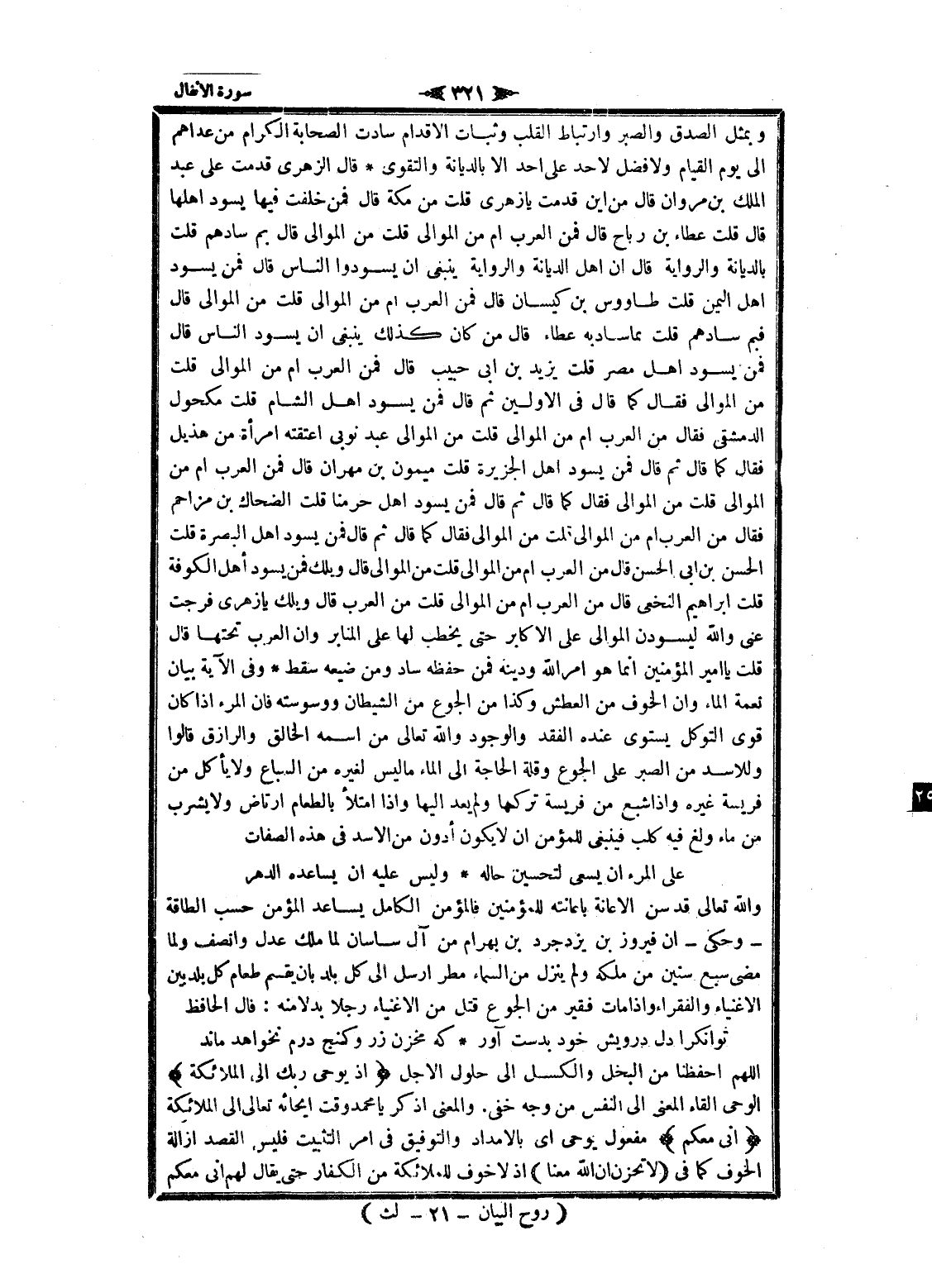 وبمثل الصدق والصبر وارتباط القلب وثبات الاقدام سادت الصحابة الكرام من عداهم الى يوم القيام ولا فضل لاحد على أحد الا بالديانة والتقوى قال الزهري قدمت على عبد الملك بن مروان قال من اين قدمت يا زهرى قلت من مكة قال فمن خلفت فيها يسود أهلها قال قلت عطاء بن رباح قال فمن العرب أم من الموالي قلت من الموالي قال بم سادهم قلت بالديانة والرواية قال ان اهل الديانة والرواية ينبغى ان يسودوا الناس قال فمن يسود اهل اليمن قلت طاووس بن كيسان قال فمن العرب أم من الموالي قلت من الموالي قال فبم سادهم قلت بما ساد به عطاء قال من كان كذلك ينبغى ان يسود الناس قال فمن يسود اهل مصر قلت يزيد بن ابى حبيب قال فمن العرب أم من الموالي قلت من الموالي فقال كما قال فى الأولين ثم قال فمن يسود اهل الشام قلت مكحول الدمشقي فقال من العرب أم من الموالي قلت من الموالي عبد نوبى أعتقته امرأة من هذيل فقال كما قال ثم قال فمن يسود اهل الجزيرة قلت ميمون بن مهران قال فمن العرب أم من الموالي قلت من الموالي فقال كما قال ثم قال فمن يسود اهل حرمنا قلت الضحاك بن مزاحم فقال من العرب أم من الموالي قلت من الموالي فقال كما قال ثم قال فمن يسود اهل البصرة قلت الحسن بن ابى الحسن قال من العرب أم من الموالي قلت من الموالي قال ويلك فمن يسود أهل الكوفة قلت ابراهيم النخعي قال من العرب أم من الموالي قلت من العرب قال ويلك يا زهرى فرجت عنى والله ليسودن الموالي على الأكابر حتى يخطب لها على المنابر وان العرب تحتها قال قلت يا امير المؤمنين انما هو امر الله ودينه فمن حفظه ساد ومن ضيعه سقط وفى الآية بيان نعمة الماء وان الخوف من العطش وكذا من الجوع من الشيطان ووسوسته فان المرء إذا كان قوى التوكل يستوى عنده الفقد والوجود والله تعالى من اسمه الخالق والرازق قالوا وللاسد من الصبر على الجوع وقلة الحاجة الى الماء ما ليس لغيره من السباع ولا يأكل من فريسة غيره وإذا شبع من فريسة تركها ولم يعد إليها وإذا امتلأ بالطعام ارتاض ولا يشرب من ماء ولغ فيه كلب فينبغى للمؤمن ان لا يكون أدون من الأسد فى هذه الصفات