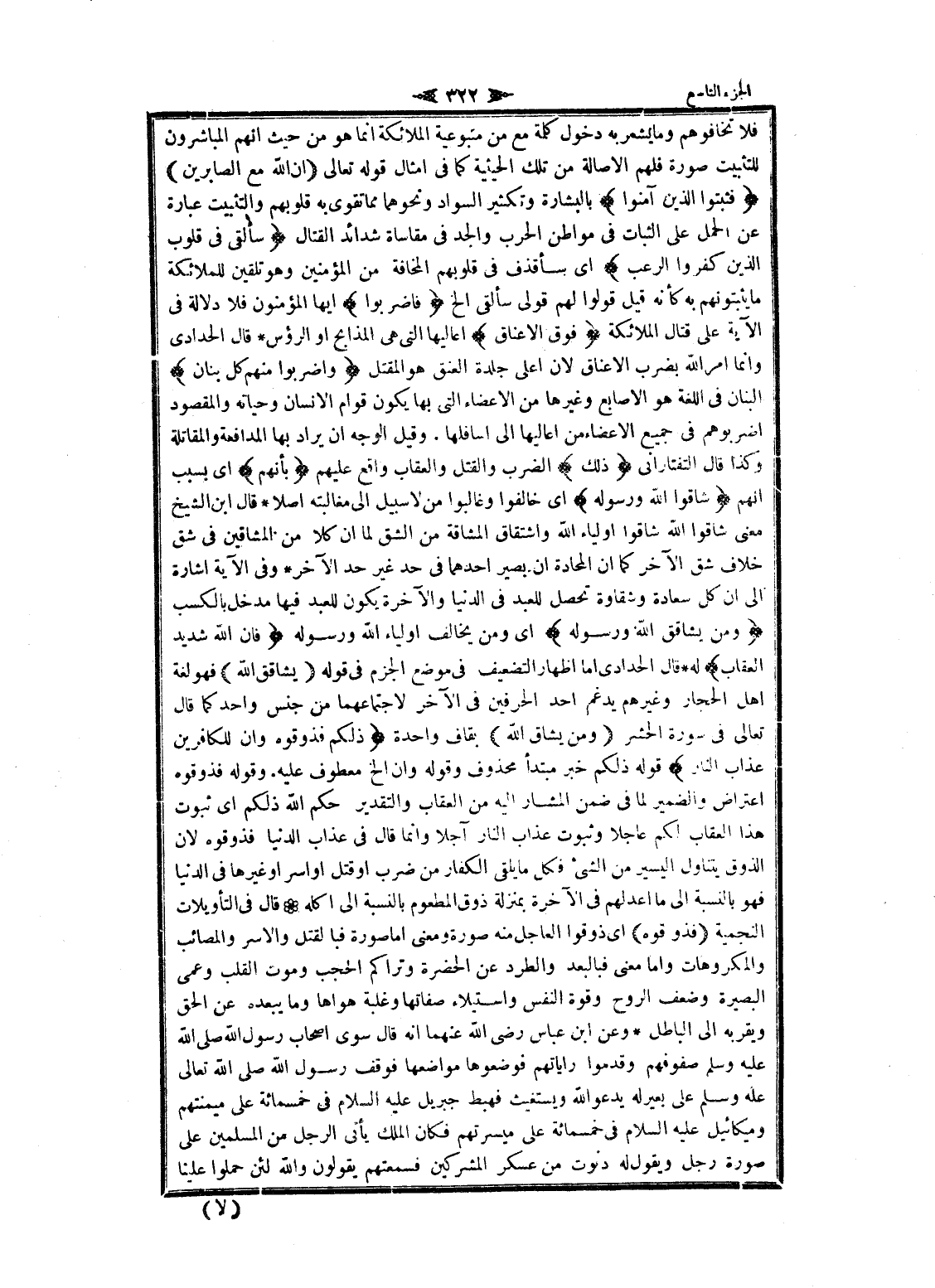 فلا تخافوهم وما يشعر به دخول كلمة مع من متبوعية الملائكة انما هو من حيث انهم المباشرون للتثبيت صورة فلهم الاصالة من تلك الحيثية كما فى أمثال قوله تعالى إِنَّ اللَّهَ مَعَ الصَّابِرِينَ فَثَبِّتُوا الَّذِينَ آمَنُوا بالبشارة وتكثير السواد ونحوهما مما تقوى به قلوبهم والتثبيت عبارة عن الحمل على الثبات فى مواطن الحرب والجد فى مقاساة شدائد القتال سَأُلْقِي فِي قُلُوبِ الَّذِينَ كَفَرُوا الرُّعْبَ اى سأقذف فى قلوبهم المخافة من المؤمنين وهو تلقين للملائكة ما يثبتونهم به كأنه قيل قولوا لهم قولى سألقى إلخ فَاضْرِبُوا ايها المؤمنون فلا دلالة فى الآية على قتال الملائكة فَوْقَ الْأَعْناقِ أعاليها التي هى المذابح او الرؤوس قال الحدادي وانما امر الله بضرب الأعناق لان أعلى جلدة العنق هو المقتل وَاضْرِبُوا مِنْهُمْ كُلَّ بَنانٍ البنان فى اللغة هو الأصابع وغيرها من الأعضاء التي بها يكون قوام الإنسان وحياته والمقصود اضربوهم فى جميع الأعضاء من أعاليها الى أسافلها. وقيل الوجه ان يراد بها المدافعة والمقاتلة وكذا قال التفتازانيّ لِكَ