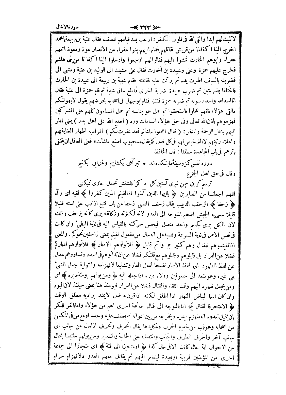 اللهم اجعلنا من الصابرين يا أَيُّهَا الَّذِينَ آمَنُوا إِذا لَقِيتُمُ الَّذِينَ كَفَرُوا لقيه اى رآه زَحْفاً الزحف الدبيب يقال زحف الصبى زحفا من باب فتح إذا دب على استه قليلا قليلا سمى به الجيش الدهم المتوجه الى العدو لانه لكثرته وتكاثفه يرى كأنه يزحف وذلك لان الكل يرى كجسم واحد متصل فيحس حركته بالقياس اليه فى غاية البطيء وان كانت فى نفس الأمر فى غاية السرعة ونصبه على انه حال من مفعول لقيتم بمعنى زاحفين نحوكم. والمعنى إذا لقيتموهم للقتال وهم كثير جم وأنتم قليل فَلا تُوَلُّوهُمُ الْأَدْبارَ فلا تولوهم أدباركم فضلا عن الفرار بل قابلوهم وقاتلوهم مع قتلكم فضلا عن ان تدانوهم فى العدد وتساووهم عدل عن لفظ الظهور الى لفظ الأدبار تقبيحا لفعل الفار وتشنيعا لا نهزامه والتولية جعل الشيء يلى غيره وهو متعد الى مفعولين وولاه دبره إذا جعله اليه وَمَنْ يُوَلِّهِمْ يَوْمَئِذٍ دُبُرَهُ اى ومن يجعل ظهره إليهم وقت اللقاء والقتال فضلا عن الفرار فيومئذ هنا بمعنى حينئذ لان اليوم وان كان اسما لبياض النهار إذا اطلق لكنه إذا قرن به فعل لا يمتد يراد به مطلق الوقت إِلَّا مُتَحَرِّفاً لِقِتالٍ اما بالتوجه الى قتال طائفة اخرى أهم من هؤلاء واما بالفر للكر بان يخيل لعدوه انه منهزم ليغره ويخرجه من بين أعوانه ثم يعطف عليه وحده او مع من فى المكمن من أصحابه وهو باب من خدع الحرب ومكايدها يقال انحرف وتحرف إذا مال من جانب الى جانب آخر والحرف الطرف والجانب وانتصابه على الحالية والتقدير ومن يولهم ملتبسا بحال من الأحوال اية حال كانت الا فى حال كذا أَوْ مُتَحَيِّزاً إِلى فِئَةٍ اى منجازا الى جماعة اخرى من المؤمنين قريبة او بعيدة لينضم إليهم ثم يقاتل معهم العدو فالانهزام حرام