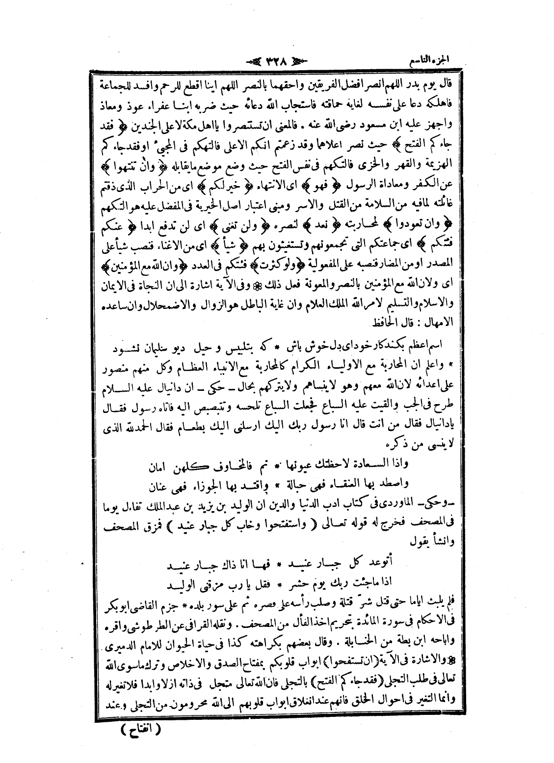 فلم يلبث أياما حتى قتل شرّ قتلة وصلب رأسه على قصره ثم على سور بلده جزم القاضي ابو بكر فى الاحكام فى سورة المائدة بتحريم أخذ الفأل من المصحف. ونقله القرافي عن الطرطوشى وأقره واباحه ابن بطة من الحنابلة. وقال بعضهم بكراهته كذا فى حياة الحيوان للامام الدميري والاشارة فى الآية إِنْ تَسْتَفْتِحُوا أبواب قلوبكم بمفتاح الصدق والإخلاص وترك ما سوى الله تعالى فى طلب التجلي فَقَدْ جاءَكُمُ الْفَتْحُ بالتجلى فان الله تعالى متجل فى ذاته ازلا وابدا فلا تغير له وانما التغير فى احوال الخلق فانهم عند انغلاق أبواب قلوبهم الى الله محرومون من التجلي وعند