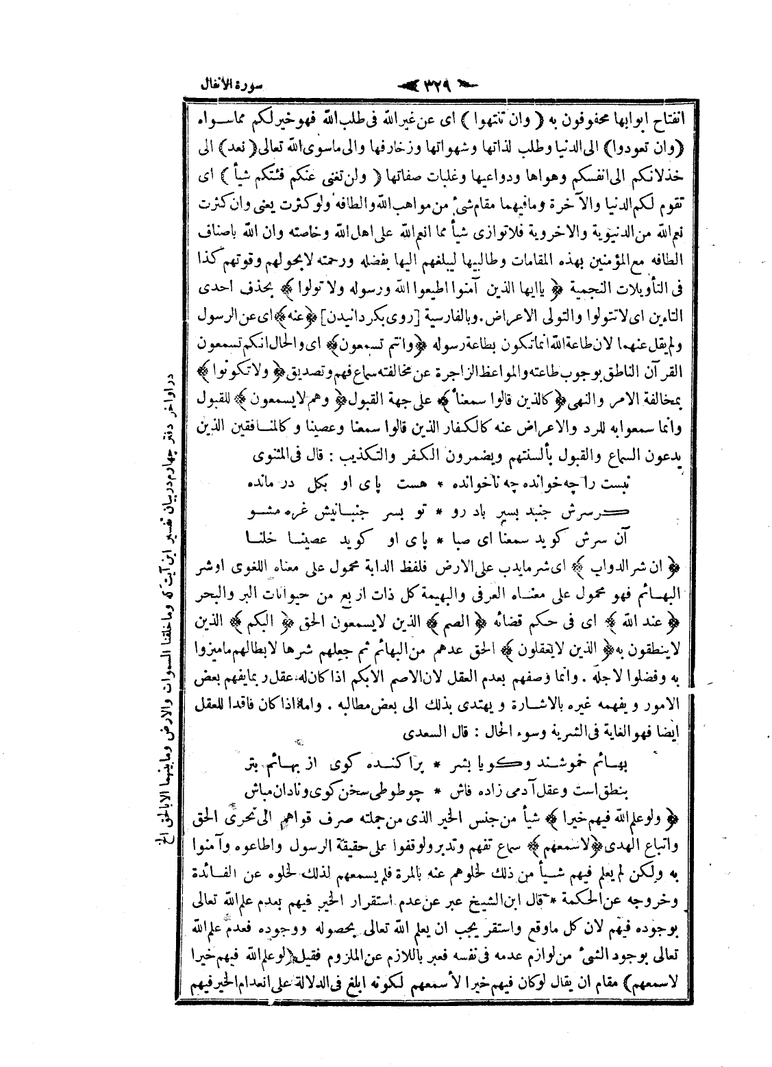 انفتاح ابوابها محفوفون به وَإِنْ تَنْتَهُوا اى عن غير الله فى طلب الله فهو خير لكم مما سواه وَإِنْ تَعُودُوا الى الدنيا وطلب لذاتها وشهواتها وزخارفها والى ما سوى الله تعالى نَعُدْ الى خذلانكم الى أنفسكم وهواها ودواعيها وغلبات صفاتها وَلَنْ تُغْنِيَ عَنْكُمْ فِئَتُكُمْ شَيْئاً اى تقوم لكم الدنيا والآخرة وما فيهما مقام شىء من مواهب الله والطافه ولو كثرت يعنى وان كثرت نعم الله من الدنيوية والاخروية فلا توازى شيأ مما أنعم الله على اهل الله وخاصته وان الله بأصناف الطافه مع المؤمنين بهذه المقامات وطالبيها ليبلغهم إليها بفضله ورحمته لا بحولهم وقوتهم كذا فى التأويلات النجمية يا أَيُّهَا الَّذِينَ آمَنُوا أَطِيعُوا اللَّهَ وَرَسُولَهُ وَلا تَوَلَّوْا بحذف احدى التاءين اى لا تتولوا والتولي الاعراض. وبالفارسية [روى بگردانيدن] عَنْهُ اى عن الرسول ولم يقل عنهما لان طاعة الله انما تكون بطاعة رسوله وَأَنْتُمْ تَسْمَعُونَ اى والحال انكم تسمعون القرآن الناطق بوجوب طاعته والمواعظ الزاجرة عن مخالفته سماع فهم وتصديق وَلا تَكُونُوا بمخالفة الأمر والنهى كَالَّذِينَ قالُوا سَمِعْنا على جهة القبول وَهُمْ لا يَسْمَعُونَ للقبول وانما سمعوا به للرد والاعراض عنه كالكفار الذين قالوا سمعنا وعصينا وكالمنافقين الذين يدعون السماع والقبول بألسنتهم ويضمرون الكفر والتكذيب: قال فى المثنوى