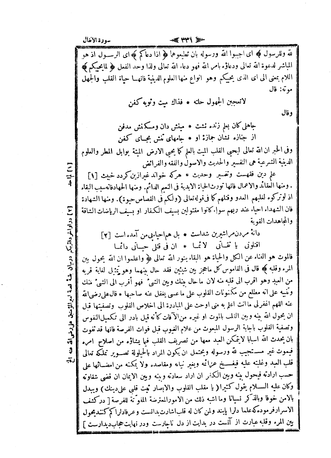 فالموت هو الفناء عن الكل والحياة هو البقاء بنور الله تعالى وَاعْلَمُوا أَنَّ اللَّهَ يَحُولُ بَيْنَ الْمَرْءِ وَقَلْبِهِ قال فى القاموس كل ما حجز بين شيئين فقد حال بينهما وهو تمثيل لغاية قربه من العبد وهو اقرب الى قلبه منه لان ما حال بينك وبين الشيء فهو أقرب الى الشيء منك وتنبيه على انه مطلع من مكنونات القلوب على ما عسى يغفل عنه صاحبها قال على رضى الله عنه اللهم اغفر لى ما أنت اعلم به منى او حث على المبادرة الى اخلاص القلوب وتصفيتها قبل ان يحول الله بينه وبين القلب بالموت او غيره من الآفات كأنه قيل بادر الى تكميل النفوس وتصفية القلوب بإجابة الرسول المبعوث من علام الغيوب قبل فوات الفرصة فانها قد ثفوت بان يحدث الله أسبابا لا يتمكن العبد معها من تصريف القلب فيما يشاؤه من إصلاح امره فيموت غير مستجيب لله ورسوله ويحتمل ان يكون المراد بالحيلولة تصوير تملكه تعالى قلب العبد وغلبته عليه فيفسخ عزائمه ويغير نيانه ومقاصده ولا يمكنه من إمضائها على حسب إرادته فيحول بينه وبين الكفر ان أراد سعادته وبينه وبين الايمان ان قضى شقاوته وكان عليه السلام يقول كثيرا (يا مقلب القلوب والابصار ثبت قلبى على دينك) ويبدل بالأمن خوفا وبالذكر نسيانا وما أشبه ذلك من الأمور المعترضة المفوّتة للفرصة [در كشف الاسرار فرموده كه علما دلرا پايند ولمن كان له قلب اشارت بدانست وعرفا دلرا كم كنند يحول بين المرء وقلبه عبارت از آنست در بدايت از دل ناچارست ودر نهايت حجاب ديدارست]