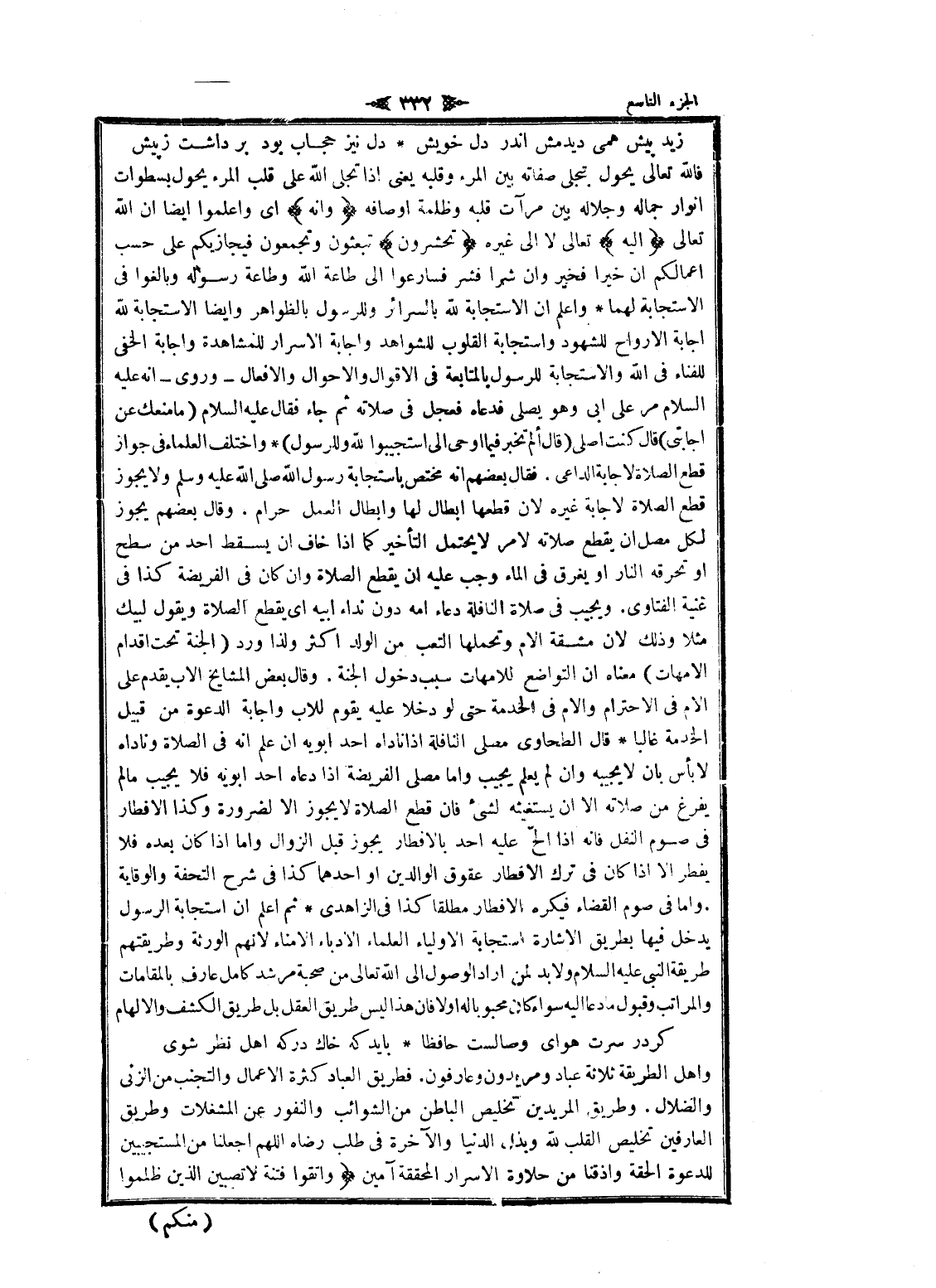 واهل الطريقة ثلاثة عباد ومريدون وعارفون. فطريق العباد كثرة الأعمال والتجنب من الزنى والضلال. وطريق المريدين تخليص الباطن من الشوائب والنفور عن المشغلات وطريق العارفين تخليص القلب لله وبذل الدنيا والآخرة فى طلب رضاه اللهم اجعلنا من المستجيبين للدعوة الحقة وأذقنا من حلاوة الاسرار المحققة آمين وَاتَّقُوا فِتْنَةً لا تُصِيبَنَّ الَّذِينَ ظَلَمُوا