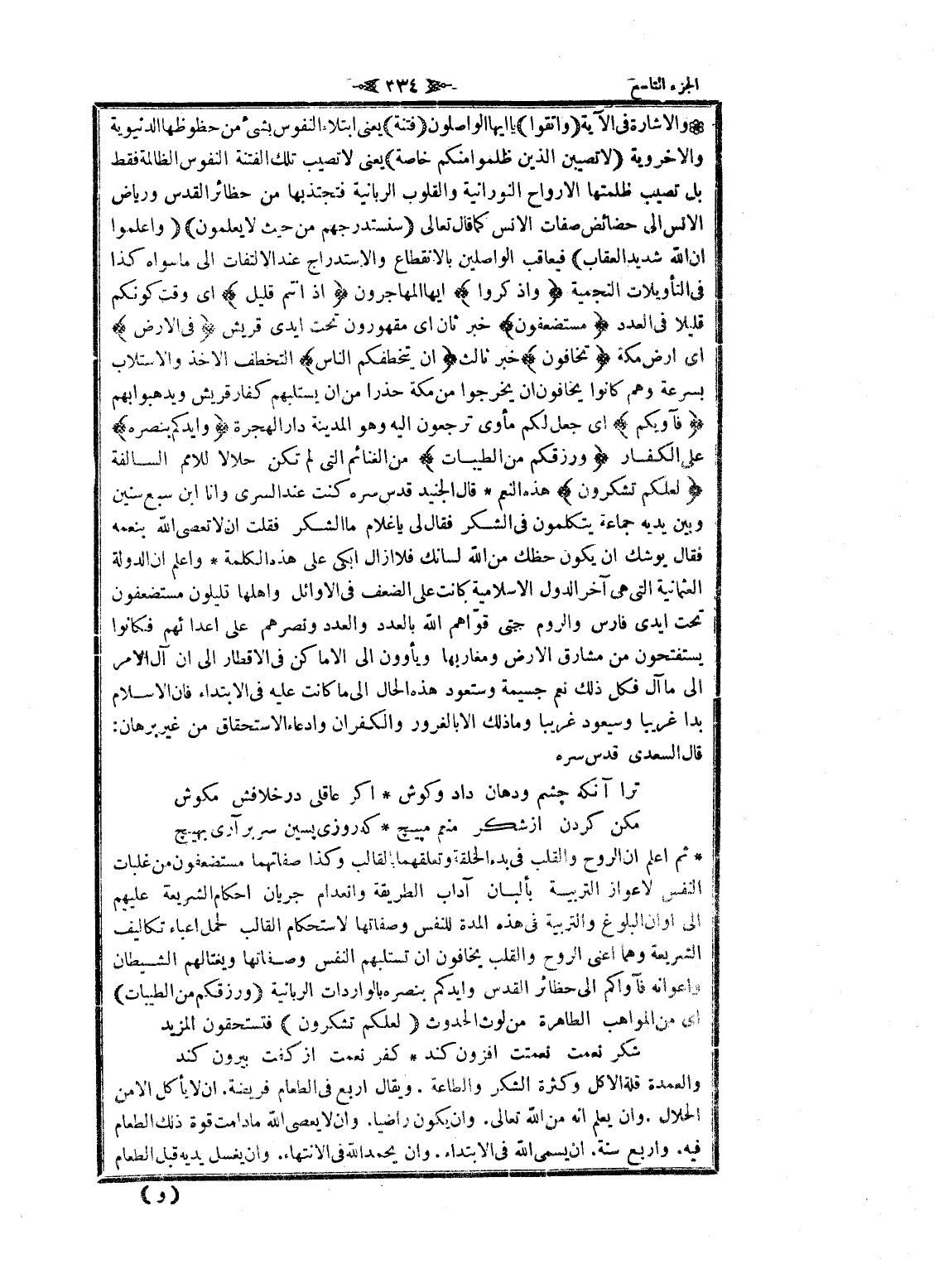 والاشارة فى الآية وَاتَّقُوا يا ايها الواصلون فِتْنَةً يعنى ابتلاء النفوس بشىء من حظوظها الدنيوية والاخروية لا تُصِيبَنَّ الَّذِينَ ظَلَمُوا مِنْكُمْ خَاصَّةً يعنى لا تصيب تلك الفتنة النفوس الظالمة فقط بل تصيب ظلمتها الأرواح النورانية والقلوب الربانية فتجتذبها من حظائر القدس ورياض الانس الى حضائض صفات الانس كما قال تعالى سَنَسْتَدْرِجُهُمْ مِنْ حَيْثُ لا يَعْلَمُونَ وَاعْلَمُوا أَنَّ اللَّهَ شَدِيدُ الْعِقابِ فيعاقب الواصلين بالانقطاع والاستدراج عند الالتفات الى ما سواه كذا فى التأويلات النجمية وَاذْكُرُوا ايها المهاجرون إِذْ أَنْتُمْ قَلِيلٌ اى وقت كونكم قليلا فى العدد مُسْتَضْعَفُونَ خبر ثان اى مقهورون تحت أيدي قريش فِي الْأَرْضِ اى ارض مكة تَخافُونَ خبر ثالث أَنْ يَتَخَطَّفَكُمُ النَّاسُ التخطف الاخذ والاستلاب بسرعة وهم كانوا يخافون ان يخرجوا من مكة حذرا من ان يستلبهم كفار قريش ويدهبوا بهم فَآواكُمْ اى جعل لكم مأوى ترجعون اليه وهو المدينة دار الهجرة وَأَيَّدَكُمْ بِنَصْرِهِ على الكفار وَرَزَقَكُمْ مِنَ الطَّيِّباتِ من الغنائم التي لم تكن حلالا للامم السالفة لَعَلَّكُمْ تَشْكُرُونَ هذه النعم قال الجنيد قدس سره كنت عند السرى وانا ابن سبع سنين وبين يديه جماعة يتكلمون فى الشكر فقال لى يا غلام ما الشكر فقلت ان لا تعصى الله بنعمه فقال يوشك ان يكون حظك من الله لسانك فلا أزال ابكى على هذه الكلمة واعلم ان الدولة العثمانية التي هى آخر الدول الاسلامية كانت على الضعف فى الأوائل وأهلها قليلون مستضعفون تحت أيدي فارس والروم حتى قوّاهم الله بالعدد والعدد ونصرهم على أعدائهم فكانوا يستفتحون من مشارق الأرض ومغاربها ويأوون الى الأماكن فى الأقطار الى ان آل الأمر الى ما آل فكل ذلك نعم جسيمة وستعود هذه الحال الى ما كانت عليه فى الابتداء فان الإسلام بدا غريبا وسيعود غريبا وما ذلك الا بالغرور والكفران وادعاء الاستحقاق من غير برهان: