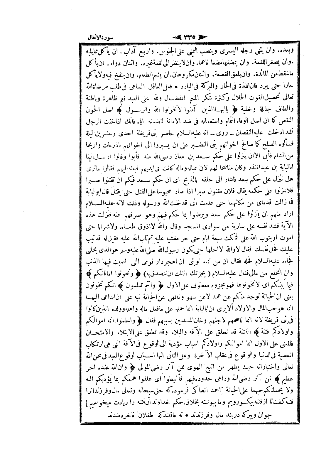 وبعده. وان يثنى رجله اليسرى وينصب اليمنى على الجلوس. واربع آداب. ان يأكل مما يليه وان يصغر اللقمة. وان يمضغها مضغا ناعما. وان لا ينظر الى لقمة غيره. واثنان دواء. ان يأكل ما سقط من المائدة. وان يلعق القصعة. واثنان مكروهان. ان يشم الطعام. وان ينفخ فيه ولا يأكل حارا حتى يبرد فان اللذة فى الحار والبركة فى البارد فعلى العاقل الساعي فى طلب مرضاة الله تعالى تحصيل القوت الحلال وكثرة شكر المنعم المفضال ولله على العبد نعم ظاهرة وباطنة والطاف جليلة وخفية يا أَيُّهَا الَّذِينَ آمَنُوا لا تَخُونُوا اللَّهَ وَالرَّسُولَ اصل الخون النقص كما ان اصل الوفاء التمام واستعماله فى ضد الامانة لتضمنه إياه فانك إذا خنت الرجل فقد ادخلت عليه النقصان- روى- انه عليه السلام حاصر بنى قريظة احدى وعشرين ليلة فسألوه الصلح كما صالح إخوانهم بنى النضير على ان يسيروا الى إخوانهم بأذرعات وأريحا من الشام فأبى الا ان ينزلوا على حكم سعد بن معاذ رضى الله عنه فأبوا وقالوا أرسل إلينا أبا لبابة بن عبد المنذر وكان مناصحا لهم لان عياله وماله كانت فى أيديهم فبعثه إليهم فقالوا ما ترى هل ننزل على حكم سعد فاشار الى حلقه بالذبح اى ان حكم سعد فيكم ان تقتلوا صبرا فلا تنزلوا على حكمه يقال فلان مقتول صبرا إذا صار محبوسا على القتل حتى يقتل قال ابو لبابة فما زالت قدماى من مكانهما حتى علمت انى قد خنت الله ورسوله وذلك لانه عليه السلام أراد منهم ان ينزلوا على حكم سعد ويرضوا بما حكم فيهم وهو صرفهم عنه فنزلت هذه الآية فشد نفسه على سارية من سوارى المسجد وقال والله لا أذوق طعاما ولا شرابا حتى أموت او يتوب الله على فمكث سبعة ايام حتى خر مغشيا عليه ثم تاب الله عليه فقيل له قد ينب عليك فحل نفسك فقال لا والله لا أحلها حتى يكون رسول الله صلى الله عليه وسلم هو الذي يحلنى فجاءه عليه السلام فحله فقال ان من تمام توبتى ان اهجر دار قومى التي أصبت فيها الذنب وان انخلع من مالى فقال عليه السلام (يجزنك الثلث ان تتصدق به) وَتَخُونُوا أَماناتِكُمْ فيما بينكم اى لا تخونوها فهو مجزوم معطوف على الاول وَأَنْتُمْ تَعْلَمُونَ انكم تخونون يعنى ان الخيانة توجد منكم عن عمد لا عن سهو ولما نهى عن الخيانة نبه على ان الداعي إليها انما هو حب المال والأولاد ألا يرى ان أبا لبابة انما حمله على ما فعل ماله واهله وولده الذين كانوا فى بنى قريظة لانه انما ناصحهم لاجلهم وخان المسلمين بسببهم فقال وَاعْلَمُوا أَنَّما أَمْوالُكُمْ وَأَوْلادُكُمْ فِتْنَةٌ