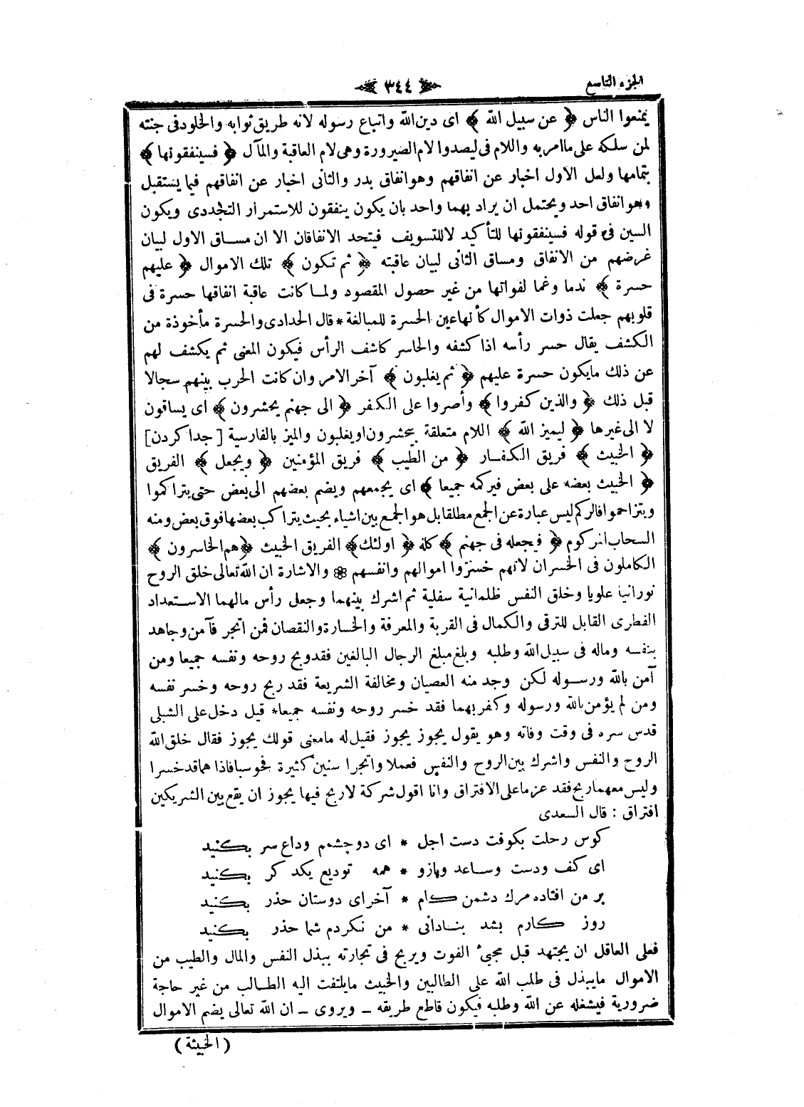 يمنعوا الناس عَنْ سَبِيلِ اللَّهِ اى دين الله واتباع رسوله لانه طريق ثوابه والخلود فى جنته لمن سلكه على ما امر به واللام فى ليصدوا لام الصيرورة وهى لام العاقبة والمآل فَسَيُنْفِقُونَها بتمامها ولعل الاول اخبار عن انفاقهم وهو انفاق بدر والثاني اخبار عن انفاقهم فيما يستقبل هو انفاق أحد ويحتمل ان يراد بهما واحد بان يكون ينفقون للاستمرار التجددي ويكون السين فى قوله فسينفقونها للتأكيد لا للتسويف فيتحد الانفاقان الا ان مساق الاول لبيان غرضهم من الانفاق ومساق الثاني لبيان عاقبته ثُمَّ تَكُونُ تلك الأموال عَلَيْهِمْ حَسْرَةً ندما وغما لفواتها من غير حصول المقصود ولما كانت عاقبة إنفاقها حسرة فى قلوبهم جعلت ذوات الأموال كأنها عين الحسرة للمبالغة قال الحدادي والحسرة مأخوذة من الكشف يقال حسر رأسه إذا كشفه والحاسر كاشف الرأس فيكون المعنى ثم يكشف لهم عن ذلك ما يكون حسرة عليهم ثُمَّ يُغْلَبُونَ آخر الأمر وان كانت الحرب بينهم سجالا قبل ذلك وَالَّذِينَ كَفَرُوا وأصروا على الكفر إِلى جَهَنَّمَ يُحْشَرُونَ اى يساقون لا الى غيرها لِيَمِيزَ اللَّهُ اللام متعلقة بيحشرون او يعلبون والميز بالفارسية [جدا كردن] الْخَبِيثَ فريق الكفار مِنَ الطَّيِّبِ فريق المؤمنين وَيَجْعَلَ الفريق الْخَبِيثَ بَعْضَهُ عَلى بَعْضٍ فَيَرْكُمَهُ جَمِيعاً اى يجمعهم ويضم بعضهم الى بعض حتى يتراكموا ويتزاحموا فالركم ليس عبارة عن الجمع مطلقا بل هو الجمع بين أشياء بحيث يتراكب بعضها فوق بعض ومنه السحاب المركوم فَيَجْعَلَهُ فِي جَهَنَّمَ كله أُولئِكَ الفريق الخبيث هُمُ الْخاسِرُونَ الكاملون فى الخسران لانهم خسروا أموالهم وأنفسهم والاشارة ان الله تعالى خلق الروح نورانيا علويا وخلق النفس ظلمانية سفلية ثم أشرك بينهما وجعل رأس مالهما الاستعداد الفطري القابل للترقى والكمال فى القربة والمعرفة والخسارة والنقصان فمن اتجر فآمن وجاهد بنفسه وماله فى سبيل الله وطلبه وبلغ مبلغ الرجال البالغين فقد وبخ روحه ونفسه جميعا ومن آمن بالله ورسوله لكن وجد منه العصيان ومخالفة الشريعة فقد ربح روحه وخسر نفسه ومن لم يؤمن بالله ورسوله وكفر بهما فقد خسر روحه ونفسه جميعا قيل دخل على الشبلي قدس سره فى وقت وفاته وهو يقول يجوز يجوز فقيل له ما معنى قولك يجوز فقال خلق الله الروح والنفس وأشرك بين الروح والنفس فعملا واتجرا سنين كثيرة فحوسبا فاذا هما قد خسرا وليس معهما ربح فقد عزما على الافتراق وانا أقول شركة لا ريح فيها يجوز ان يقع بين الشريكين افتراق: قال السعدي