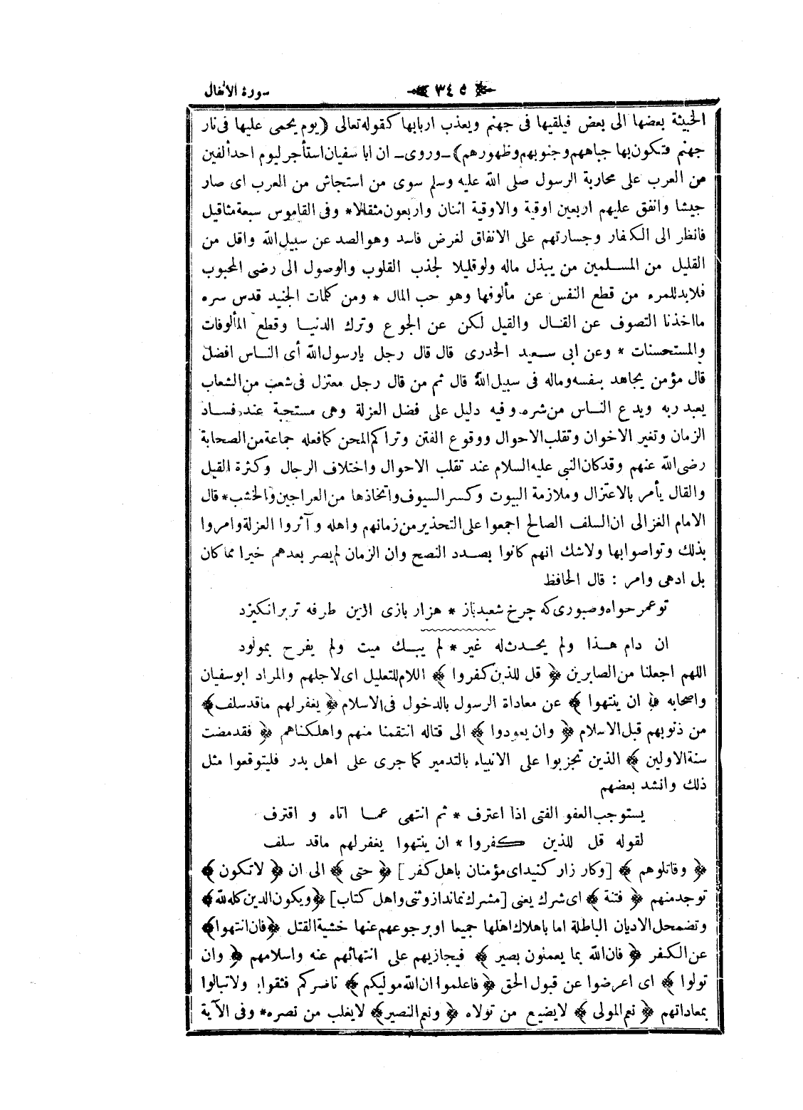 الخبيثة بعضها الى بعض فيلقيها فى جهنم ويعذب أربابها كقوله تعالى يَوْمَ يُحْمى عَلَيْها فِي نارِ جَهَنَّمَ فَتُكْوى بِها جِباهُهُمْ وَجُنُوبُهُمْ وَظُهُورُهُمْ- وروى- ان أبا سفيان استأجر ليوم أحد ألفين من العرب على محاربة الرسول صلى الله عليه وسلم سوى من استجاش من العرب اى صار جيشا وأنفق عليهم أربعين اوقية والاوقية اثنان وأربعون مثقالا وفى القاموس سبعة مثاقيل فانظر الى الكفار وجسارتهم على الانفاق لغرض فاسد وهو الصد عن سبيل الله واقل من القليل من المسلمين من يبذل ماله ولو قليلا لجذب القلوب والوصول الى رضى المحبوب فلا بد للمرء من قطع النفس عن مألوفها وهو حب المال ومن كلمات الجنيد قدس سره ما أخذنا التصوف عن القال والقيل لكن عن الجوع وترك الدنيا وقطع المألوفات والمستحسنات وعن ابى سعيد الخدري قال قال رجل يا رسول الله أي الناس أفضل قال مؤمن يجاهد بنفسه وماله فى سبيل الله قال ثم من قال رجل معتزل فى شعب من الشعاب يعبد ربه ويدع الناس من شره وفيه دليل على فضل العزلة وهى مستحبة عند فساد الزمان وتغير الاخوان وتقلب الأحوال ووقوع الفتن وتراكم المحن كما فعله جماعة من الصحابة رضى الله عنهم وقد كان النبي عليه السلام عند تقلب الأحوال واختلاف الرجال وكثرة القيل والقال يأمر بالاعتزال وملازمة البيوت وكسر السيوف واتخاذها من العراجين والخشب قال الامام الغزالي ان السلف الصالح اجمعوا على التحذير من زمانهم واهله وآثروا العزلة وأمروا بذلك وتواصوا بها ولا شك انهم كانوا بصدد النصح وان الزمان لم يصر بعدهم خيرا مما كان بل أدهى وامر: قال الحافظ