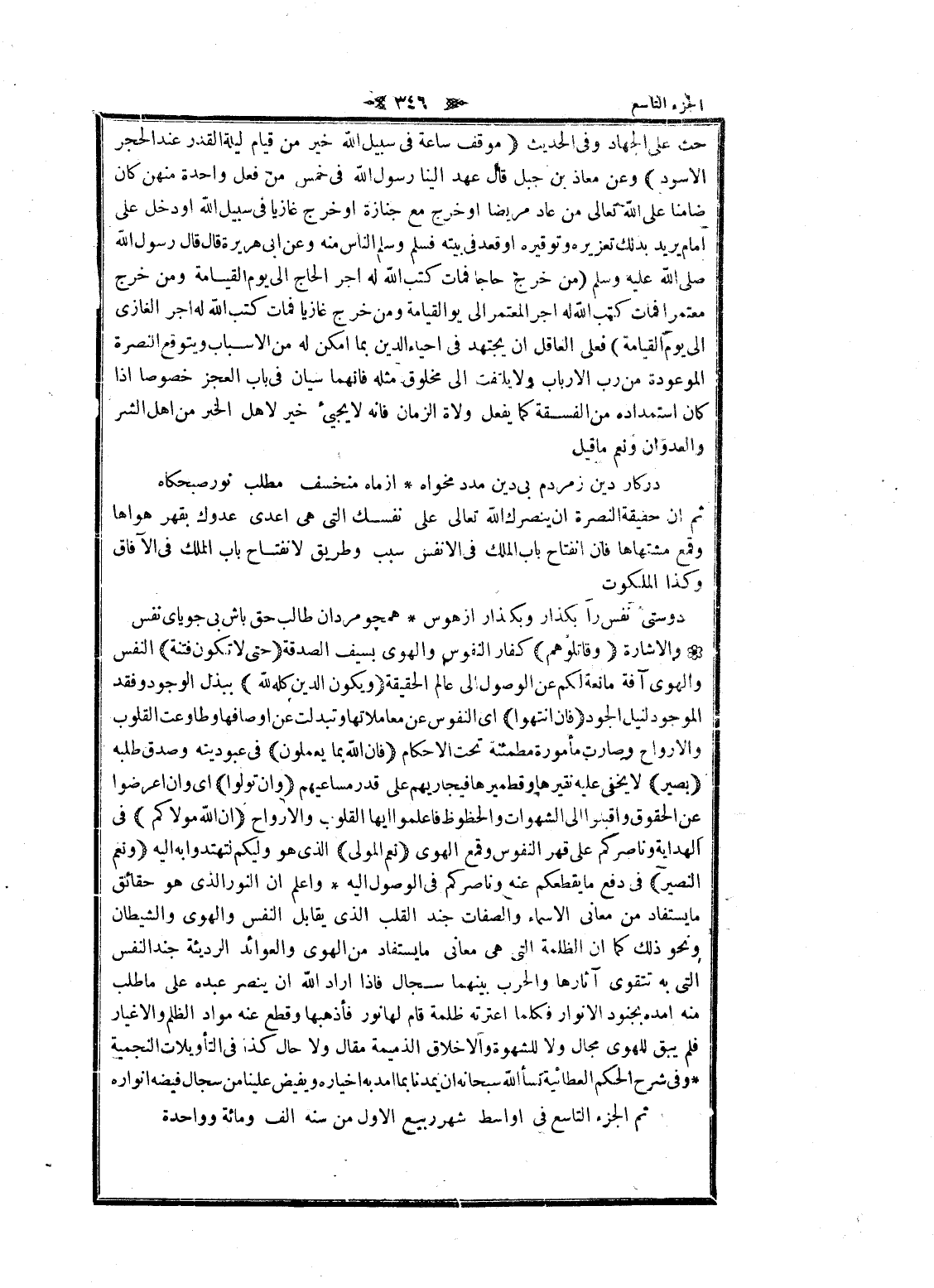 حث على الجهاد وفى الحديث موقف ساعة فى سبيل الله خير من قيام ليلة القدر عند الحجر الاسود وعن معاذ بن جبل قال عهد إلينا رسول الله فى خمس من فعل واحدة منهن كان ضامنا على الله تعالى من عاد مريضا او خرج مع جنازة او خرج غازيا فى سبيل الله او دخل على امام يريد بذلك تعزيره وتوقيره او قعد فى بيته فسلم وسلم الناس منه وعن ابى هريرة قال قال رسول الله صلى الله عليه وسلم (من خرج حاجا فمات كتب الله له اجر الحاج الى يوم القيامة ومن خرج معتمرا فمات كتب الله له اجر المعتمر الى يو القيامة ومن خرج غازيا فمات كتب الله له اجر الغازي الى يوم القيامة) فعلى العاقل ان يجتهد فى احياء الدين بما أمكن له من الأسباب ويتوقع النصرة الموعودة من رب الأرباب ولا يلتفت الى مخلوق مثله فانهما سيان فى باب العجز خصوصا إذا كان استمداده من الفسقة كما يفعل ولاة الزمان فانه لا يجيىء خير لاهل الخير من اهل الشر والعدوان ونعم ما قيل