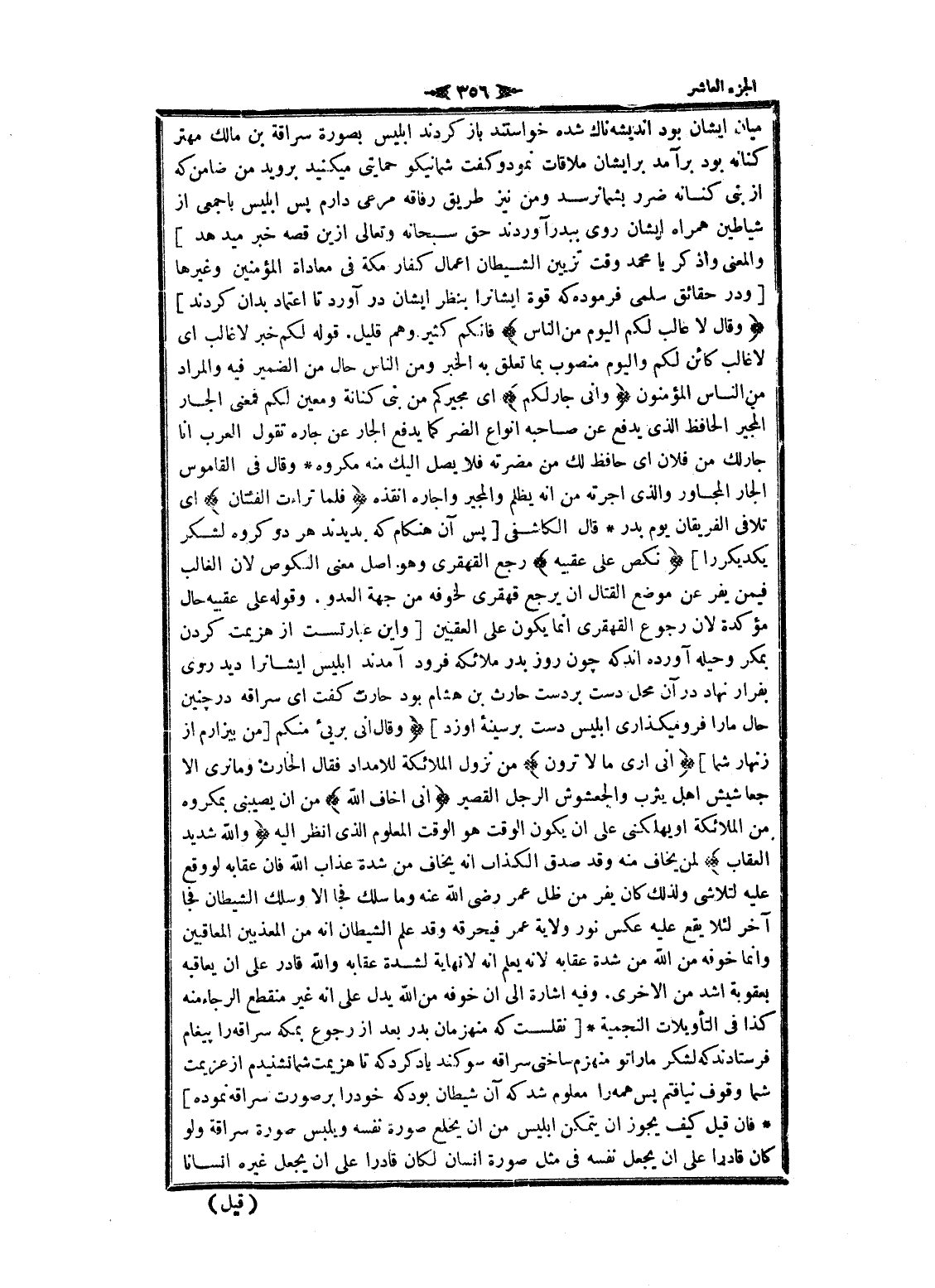 ميان ايشان بود انديشه ناك شده خواستند باز كردند إبليس بصورة سراقة بن مالك مهتر كنانه بود بر آمد بر ايشان ملاقات نمود وكفت شما نيكو حمايتى ميكنيد برويد من ضامن كه از بنى كنانه ضرر بشما نرسد ومن نيز طريق رفاقه مرعى دارم پس إبليس با جمعى از شياطين همراه ايشان روى ببدر آوردند حق سبحانه وتعالى ازين قصه خبر ميدهد] والمعنى واذكر يا محمد وقت تزيين الشيطان اعمال كفار مكة فى معاداة المؤمنين وغيرها [ودر حقائق سلمى فرموده كه قوة ايشانرا بنظر ايشان در آورد تا اعتماد بدان كردند] وَقالَ لا غالِبَ لَكُمُ الْيَوْمَ مِنَ النَّاسِ فانكم كثير وهم قليل. قوله لكم خبر لا غالب اى لا غالب كائن لكم واليوم منصوب بما تعلق به الخبر ومن الناس حال من الضمير فيه والمراد من الناس المؤمنون وَإِنِّي جارٌ لَكُمْ اى مجيركم من بنى كنانة ومعين لكم فمعنى الجار المجير الحافظ الذي يدفع عن صاحبه انواع الضر كما يدفع الجار عن جاره تقول العرب انا جار لك من فلان اى حافظ لك من مضرته فلا يصل إليك منه مكروه وقال فى القاموس الجار المجاور والذي أجرته من انه يظلم والمجير واجاره أنقذه فَلَمَّا تَراءَتِ الْفِئَتانِ اى تلافى الفريقان يوم بدر قال الكاشفى [پس آن هنكام كه بديدند هر دو كروه لشكر يكديكر را] نَكَصَ عَلى عَقِبَيْهِ رجع القهقرى وهو اصل معنى النكوص لان الغالب فيمن يفر عن موضع القتال ان يرجع قهقرى لخوفه من جهة العدو. وقوله على عقبيه حال مؤكدة لان رجوع القهقرى انما يكون على العقبين [واين عبارتست از هزيمت كردن بمكر وحيله آورده اند كه چون روز بدر ملائكة فرود آمدند إبليس ايشانرا ديد روى بفرار نهاد در آن محل دست بر دست حارث بن هشام بود حارث كفت اى سراقه در چنين حال ما را فرو ميكذارى إبليس دست بر سينه او زد] وَقالَ إِنِّي بَرِيءٌ مِنْكُمْ [من بيزارم از زنهار شما] إِنِّي أَرى ما لا تَرَوْنَ من نزول الملائكة للامداد فقال الحارث وما نرى الا جعاشيش اهل يثرب والجعشوش الرجل القصير إِنِّي أَخافُ اللَّهَ من ان يصيبنى بمكروه من الملائكة او يهلكنى على ان يكون الوقت هو الوقت المعلوم الذي انظر اليه وَاللَّهُ شَدِيدُ الْعِقابِ لمن يخاف منه وقد صدق الكذاب انه يخاف من شدة عذاب الله فان عقابه لو وقع عليه لتلاشى ولذلك كان يفر من ظل عمر رضى الله عنه وما سلك فجا الا وسلك الشيطان فجا آخر لئلا يقع عليه عكس نور ولاية عمر فيحرقه وقد علم الشيطان انه من المعذبين المعاقبين وانما خوفه من الله من شدة عقابه لانه يعلم انه لا نهاية لشدة عقابه والله قادر على ان يعاقبه بعقوبة أشد من الاخرى. وفيه اشارة الى ان خوفه من الله يدل على انه غير منقطع الرجاء منه كذا فى التأويلات النجمية [نقلست كه منهزمان بدر بعد از رجوع بمكة سراقه را پيغام فرستادند كه لشكر ما را تو منهزم ساختى سراقه سوكند ياد كرد كه تا هزيمت شما نشنيدم از عزيمت شما وقوف نيافتم پس همه را معلوم شد كه آن شيطان بود كه خود را بر صورت سراقه نموده] فان قيل كيف يجوز ان يتمكن إبليس من ان يخلع صورة نفسه ويلبس صورة سراقة ولو كان قادرا على ان يجعل نفسه فى مثل صورة انسان لكان قادرا على ان يجعل غيره إنسانا