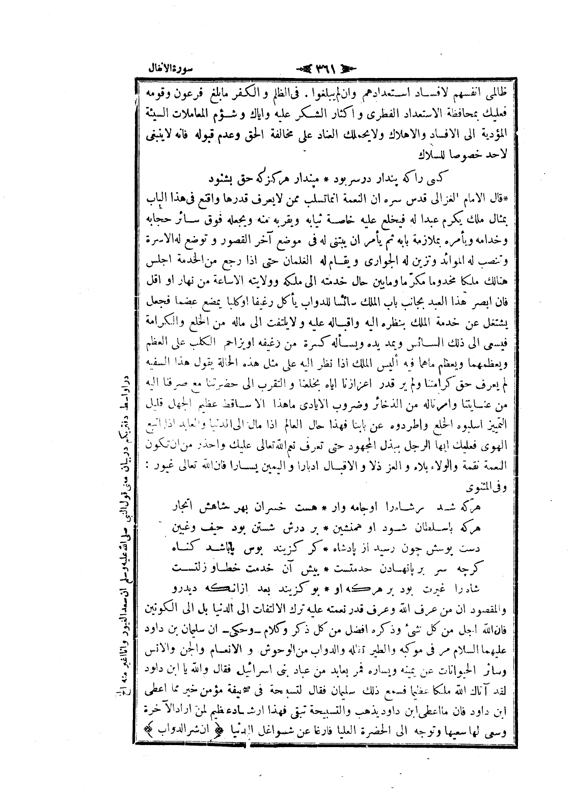 قال الامام الغزالي قدس سره ان النعمة انما تسلب ممن لا يعرف قدرها واقنع فى هذا الباب بمثال ملك يكرم عبدا له فيخلع عليه خاصة ثيابه ويقربه منه ويجعله فوق سائر حجابه وخدامه ويأمره بملازمة بابه ثم يأمر ان يبتنى له فى موضع آخر القصور وتوضع له الاسرة وتنصب له الموائد وتزين له الجواري ويقام له الغلمان حتى إذا رجع من الخدمة اجلس هنالك ملكا مخدوما مكرّما ما وما بين حال خدمته الى ملكه وولايته الا ساعة من نهار او اقل فان ابصر هذا العبد بجانب باب الملك سائسا للدواب يأكل رغيفا او كلبا يمضع عضما فجعل يشتغل عن خدمة الملك بنظره اليه وإقباله عليه ولا يلتفت الى ماله من الخلع والكرامة فيسعى الى ذلك السائس ويمد يده ويسأله كسرة من رغيفه او يزاحم الكلب على العظم ويعظمهما ويعظم ماهما فيه أليس الملك إذا نظر اليه على مثل هذه الحالة يقول هذا السفيه لم يعرف حق كرامتنا ولم ير قدر إعزازنا إياه بخلعنا والتقرب الى حضرتنا مع صرفنا اليه من عنايتنا وأمرنا له من الذخائر وضروب الأيادي ما هذا الا ساقط عظيم الجهل قليل التمييز اسلبوه الخلع واطردوه عن بابنا فهذا حال العالم إذا مال الى الدنيا والعابد إذا اتبع الهوى فعليك ايها الرجل ببذل المجهود حتى تعرف نعم الله تعالى عليك واحذر من ان تكون النعمة نقمة والولاء بلاء والعز ذلا والإقبال إدبارا واليمين يسارا فان الله تعالى غيور:
