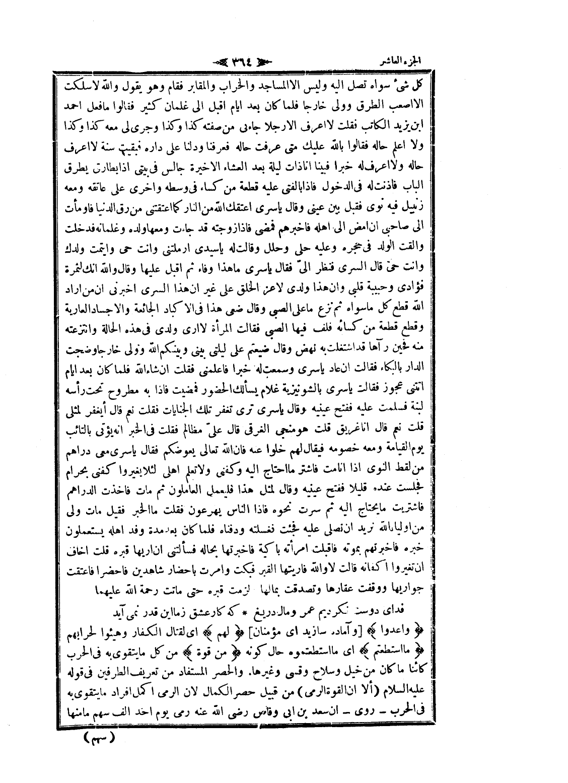 كل شىء سواه تصل اليه وليس الا المساجد والخراب والمقابر فقام وهو يقول والله لا سلكت الا أصعب الطرق وولى خارجا فلما كان بعد ايام اقبل الى غلمان كثير فقالوا ما فعل احمد ابن يزيد الكاتب فقلت لا اعرف الا رجلا جاءنى من صفته كذا وكذا وجرى لى معه كذا وكذا ولا اعلم حاله فقالوا بالله عليك متى عرفت حاله فعرفنا ودلنا على داره فبقيت سنة لا اعرف حاله ولا اعرف له خبرا فبينا انا ذات ليلة بعد العشاء الاخيرة جالس فى بيتي إذا بطارق يطرق الباب فأذنت له فى الدخول فاذا بالفتى عليه قطعة من كساء فى وسطه واخرى على عاتقه ومعه زنبيل فيه نوى فقبل بين عينى وقال يا سري اعتقك الله من النار كما أعتقتني من رق الدنيا فاومأت الى صاحبى ان امض الى اهله فاخبرهم فمضى فاذا زوجته قد جاءت ومعها ولده وغلمانه فدخلت والقت الولد فى حجره وعليه حلى وحلل وقالت له يا سيدى ارملتنى وأنت حى وأيتمت ولدك وأنت حى قال السرى فنظر الىّ فقال يا سري ما هذا وفاء ثم اقبل عليها وقال والله انك لثمرة فؤادى وحبيبة قلبى وان هذا ولدي لاعز الخلق على غير ان هذا السرى أخبرني ان من أراد الله قطع كل ما سواه ثم نزع ما على الصبى وقال ضعى هذا فى الأكباد الجائعة والأجساد العارية وقطع قطعة من كسائه فلف فيها الصبى فقالت المرأة لا ارى ولدي فى هذه الحالة وانتزعته منه فحين رآها قد اشتغلت به نهض وقال ضيعتم على ليلتى بينى وبينكم الله وولى خارجا وضجت الدار بالبكاء فقالت ان عاد يا سري وسمعت له خيرا فاعلمنى فقلت ان شاء الله فلما كان بعد ايام أتتني عجوز فقالت يا سري بالشونيزية غلام يسألك الحضور فمضيت فاذا به مطروح تحت رأسه لبنة فسلمت عليه ففتح عينيه وقال يا سري ترى تغفر تلك الجنايات فقلت نعم قال أيغفر لمثلى قلت نعم قال انا غريق قلت هو منجى الغرقى قال علىّ مظالم فقلت فى الخبر انه يؤتى بالتائب يوم القيامة ومعه خصومه فيقال لهم خلوا عنه فان الله تعالى يعوضكم فقال يا سري معى دراهم من لقط النوى إذا أنا مت فاشتر ما احتاج اليه وكفنى ولا تعلم أهلي لئلا يغيروا كفنى بحرام فجلست عنده قليلا ففتح عينيه وقال لمثل هذا فليعمل العاملون ثم مات فاخذت الدراهم فاشتريت ما يحتاج اليه ثم سرت نحوه فاذا الناس يهرعون فقلت ما الخبر فقيل مات ولى من اولياء الله نريد ان نصلى عليه فجئت فغسلته ودفناه فلما كان بعد مدة وفد اهله يستعملون خبره فاخبرتهم بموته فاقبلت امرأته باكية فاخبرتها بحاله فسألتنى ان أريها قبره قلت أخاف ان تغيروا أكفانه قالت لا والله فاريتها القبر فبكت وأمرت بإحضار شاهدين فاحضرا فاعتقت جواريها ووقفت عقارها وتصدقت بمالها لزمت قبره حتى ماتت رحمة الله عليهما