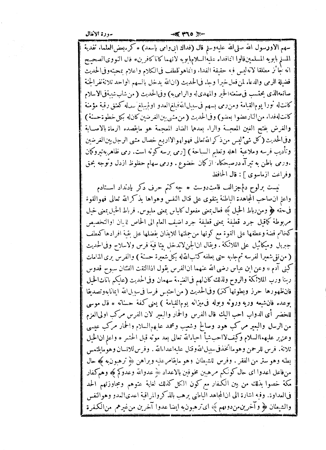 سهم الا ورسول الله صلى الله عليه وسلم قال (فداك ابى وأمي يا سعد) كره بعض العلماء تفدية المسلم بابويه المسلمين قالوا انما فداه عليه السلام بابويه لانهما كانا كافرين قال النووي الصحيح انه جائز مطلقا لانه ليس فيه حقيقة الفداء وانما هو تلطف فى الكلام واعلام بمحبته وفى الحديث فضيلة الرمي والدعاء لمن فعل خيرا وجاء فى الحديث (ان الله يدخل بالسهم الواحد ثلاثة نفر الجنة صانعه الذي يحتسب فى صنعته الخير والمهدى له والرامي به) وفى الحديث (من شاب شيبة فى الإسلام كانت له نورا يوم القيامة ومن رمى بسهم فى سبيل الله فبلغ العدو او لم يبلغ كان له كعتق رقبة مؤمنة كانت له فداء من