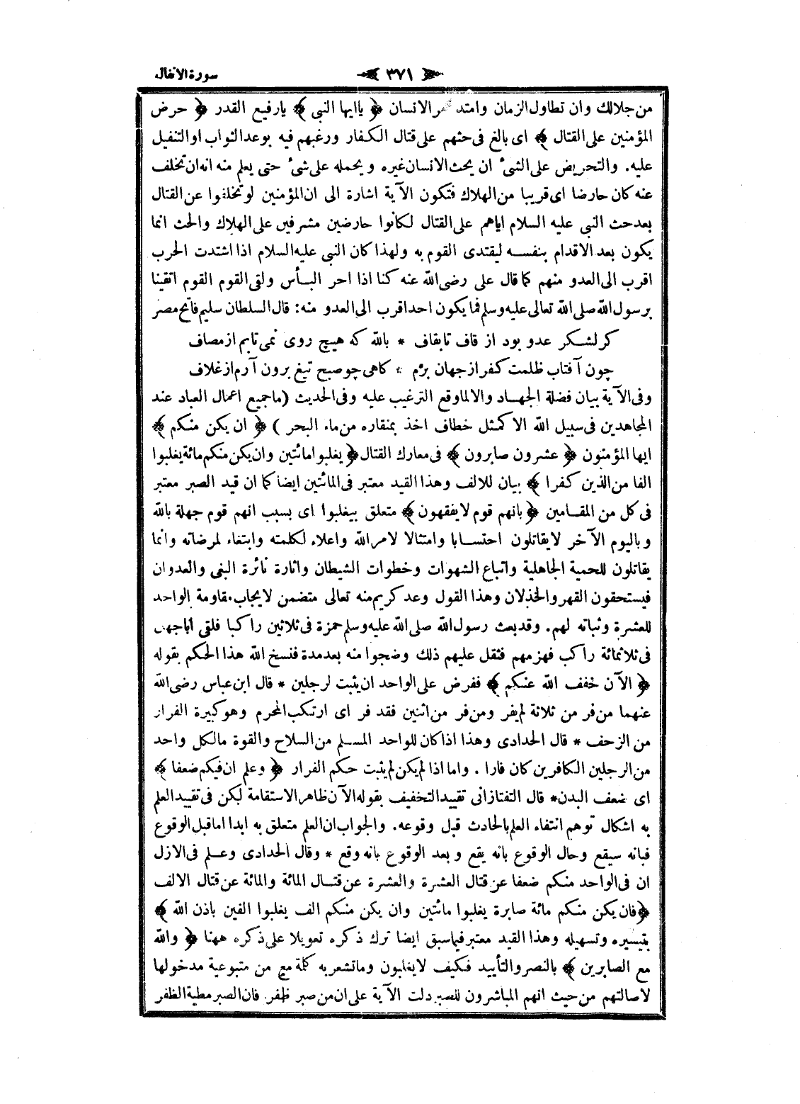 وفى الآية بيان فضلة الجهاد والا لما وقع الترغيب عليه وفى الحديث (ما جميع اعمال العباد عند المجاهدين فى سبيل الله الا كمثل خطاف أخذ بمنقاره من ماء البحر) إِنْ يَكُنْ مِنْكُمْ ايها المؤمنون عِشْرُونَ صابِرُونَ فى معارك القتال يَغْلِبُوا مِائَتَيْنِ وَإِنْ يَكُنْ مِنْكُمْ مِائَةٌ يَغْلِبُوا أَلْفاً مِنَ الَّذِينَ كَفَرُوا بيان للالف وهذا القيد معتبر فى المائتين ايضا كما ان قيد الصبر معتبر فى كل من المقامين بِأَنَّهُمْ قَوْمٌ لا يَفْقَهُونَ متعلق بيغلبوا اى بسبب انهم قوم جهلة بالله باليوم الآخر لا يقاتلون احتسابا وامتثالا لامر الله وإعلاء لكلمته وابتغاء لمرضاته وانما يقاتلون للحمية الجاهلية واتباع الشهوات وخطوات الشيطان واثارة ثائرة البغي والعدوان فيستحقون القهر والخذلان وهذا القول وعد كريم منه تعالى متضمن لا يجاب مقاومة الواحد للعشرة وثباته لهم. وقد بعث رسول الله صلى الله عليه وسلم حمزة فى ثلاثين راكبا فلقى أبا جهل فى ثلاثمائة راكب فهزمهم فثقل عليهم ذلك وضجوا منه بعد مدة فنسخ الله هذا الحكم بقوله الْآنَ خَفَّفَ اللَّهُ عَنْكُمْ ففرض على الواحد ان يثبت لرجلين قال ابن عباس رضى الله عنهما من فر من ثلاثة لم يفر ومن فر من اثنين فقد فر اى ارتكب المحرم وهو كبيرة الفرار من الزحف قال الحدادي وهذا إذا كان للواحد المسلم من السلاح والقوة ما لكل واحد من الرجلين الكافرين كان فارا. واما إذا لم يكن لم يثبت حكم الفرار وَعَلِمَ أَنَّ فِيكُمْ ضَعْفاً اى ضعف البدن قال التفتازانيّ تقييد التخفيف بقوله الآن ظاهر الاستقامة لكن فى تقييد العلم به إشكال توهم انتفاء العلم بالحادث قبل وقوعه. والجواب ان العلم متعلق به ابدا اما قبل الوقوع فبانه سيقع وحال الوقوع بانه يقع وبعد الوقوع بانه وقع وقال الحدادي وعلم فى الأزل ان فى الواحد منكم ضعفا عن قتال العشرة والعشرة عن قتال المائة والمائة عن قتال الالف فَإِنْ يَكُنْ مِنْكُمْ مِائَةٌ صابِرَةٌ يَغْلِبُوا مِائَتَيْنِ وَإِنْ يَكُنْ مِنْكُمْ أَلْفٌ يَغْلِبُوا أَلْفَيْنِ بِإِذْنِ اللَّهِ بتيسيره وتسهيله وهذا القيد معتبر فيما سبق ايضا ترك ذكره تعويلا على ذكره هاهنا وَاللَّهُ مَعَ الصَّابِرِينَ بالنصر والتأييد فكيف لا يغلبون وما تشعر به كلمة مع من متبوعية مدخولها لاصالتهم من حيث انهم المباشرون للصبر دلت الآية على ان من صبر ظفر فان الصبر مطية الظفر