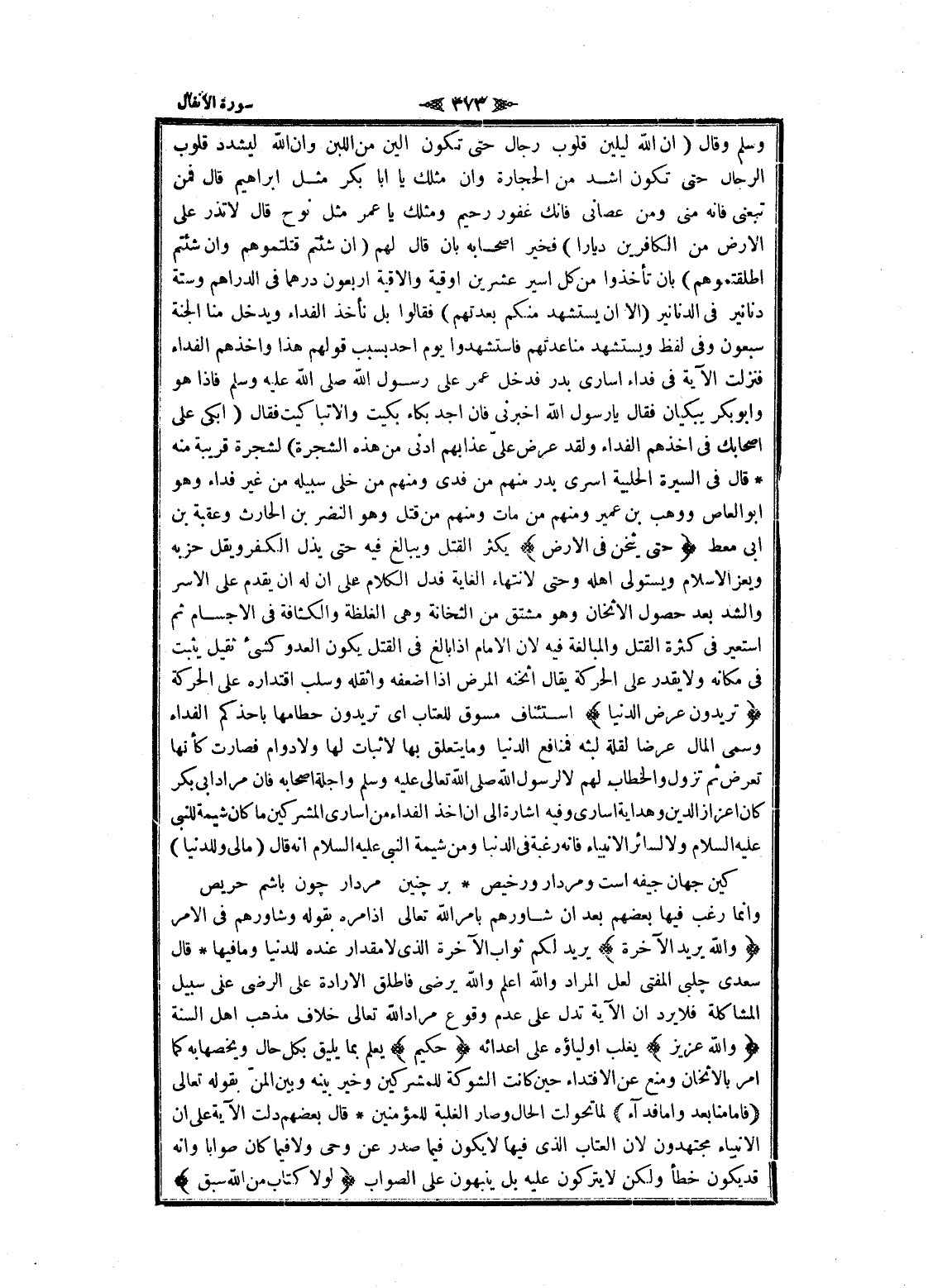 وسلم وقال (ان الله ليلين قلوب رجال حتى تكون ألين من اللبن وان الله ليشدد قلوب الرجال حتى تكون أشد من الحجارة وان مثلك يا أبا بكر مثل ابراهيم قال فمن تبعني فانه منى ومن عصانى فانك غفور رحيم ومثلك يا عمر مثل نوح قال لا تذر على الأرض من الكافرين ديارا) فخير أصحابه بان قال لهم (ان شئتم قتلتموهم وان شئتم اطلقتموهم) بان تأخذوا من كل أسير عشرين اوقية والأوقية أربعون درهما فى الدراهم وستة دنانير فى الدنانير (الا ان يستشهد منكم بعدتهم) فقالوا بل نأخذ الفداء ويدخل منا الجنة سبعون وفى لفظ ويستشهد منا عدتهم فاستشهدوا يوم أحد بسبب قولهم هذا وأخذهم الفداء فنزلت الآية فى فداء أسارى بدر فدخل عمر على رسول الله صلى الله عليه وسلم فاذا هو وابو بكر يبكيان فقال يا رسول الله أخبرني فان أجد بكاء بكيت وإلا تباكيت فقال (ابكى على أصحابك فى أخذهم الفداء ولقد عرض علىّ عذابهم ادنى من هذه الشجرة) لشجرة قريبة منه قال فى السيرة الحلبية اسرى بدر منهم من فدى ومنهم من خلى سبيله من غير فداء وهو ابو العاص ووهب بن عمير ومنهم من مات ومنهم من قتل وهو النضر بن الحارث وعقبة بن ابى معط حَتَّى يُثْخِنَ فِي الْأَرْضِ يكثر القتل ويبالغ فيه حتى يذل الكفر ويقل حزبه ويعز الإسلام ويستولى اهله وحتى لانتهاء الغاية فدل الكلام على ان له ان يقدم على الاسر والشد بعد حصول الإثخان وهو مشتق من الثخانة وهى الغلظة والكثافة فى الأجسام ثم استعير فى كثرة القتل والمبالغة فيه لان الامام إذا بالغ فى القتل يكون العدو كشىء ثقيل يثبت فى مكانه ولا يقدر على الحركة يقال أثخنه المرض إذا أضعفه وأثقله وسلب اقتداره على الحركة تُرِيدُونَ عَرَضَ الدُّنْيا استئناف مسوق للعتاب اى تريدون حطامها بأخذكم الفداء وسمى المال عرضا لقلة لبثه فمنافع الدنيا وما يتعلق بها لا ثبات لها ولا دوام فصارت كأنها تعرض ثم تزول والخطاب لهم لا لرسول الله صلى الله تعالى عليه وسلم واجلة أصحابه فان مراد ابى بكر كان إعزاز الدين وهداية أسارى وفيه اشارة الى ان أخذ الفداء من أسارى المشركين ما كان شيمة للنبى عليه السلام ولا لسائر الأنبياء فانه رغبة فى الدنيا ومن شيمة النبي عليه السلام انه قال (مالى وللدنيا)