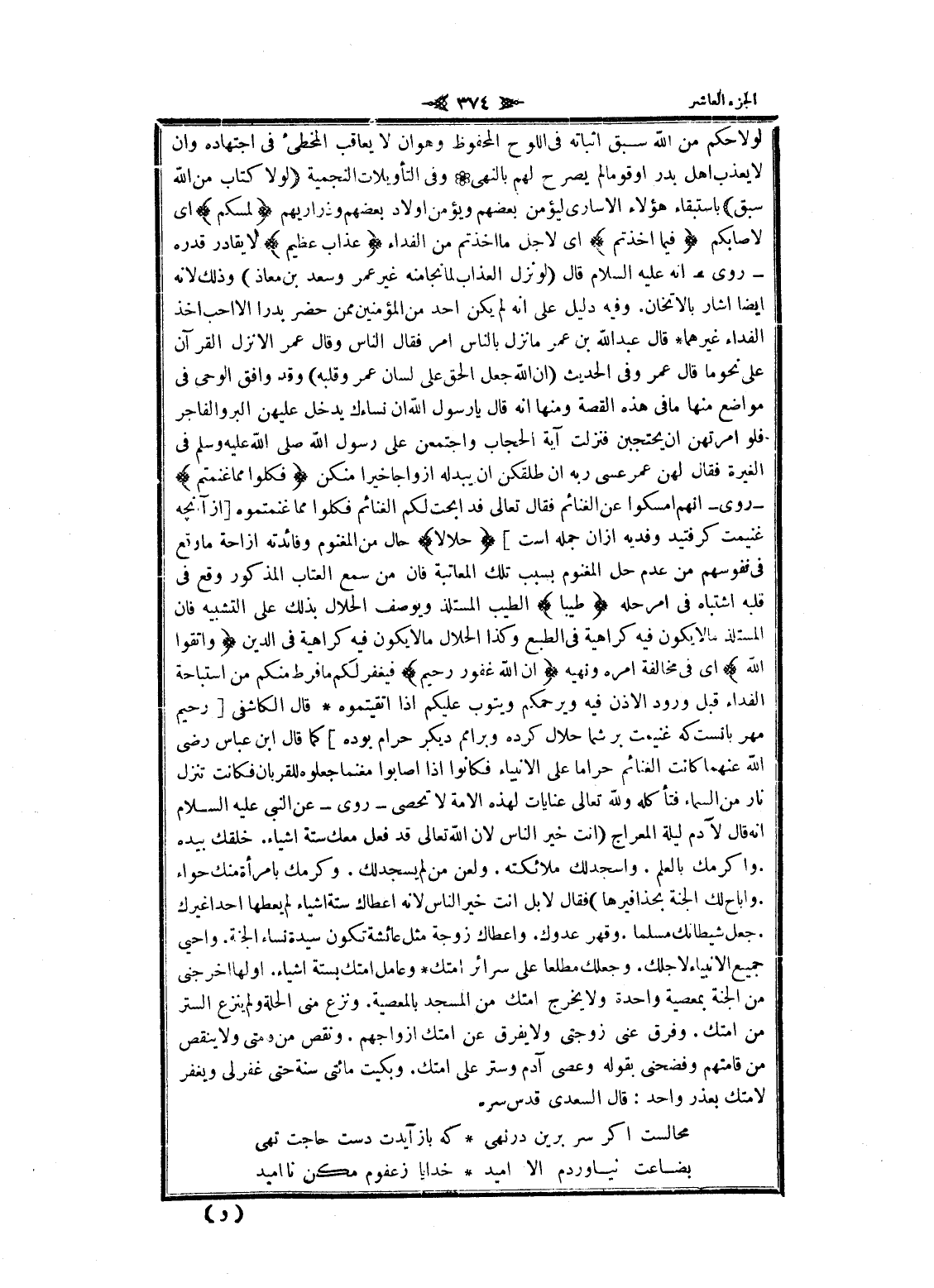 لولا حكم من الله سبق إثباته فى اللوح المحفوظ وهو ان لا يعاقب المخطئ فى اجتهاد وان لا يعذب اهل بدر او قوما لم يصرح لهم بالنهى وفى التأويلات النجمية لَوْلا كِتابٌ مِنَ اللَّهِ سَبَقَ باستبقاء هؤلاء الأسارى ليؤمن بعضهم ويؤمن أولاد بعضهم وذراريهم لَمَسَّكُمْ اى لاصابكم فِيما أَخَذْتُمْ اى لاجل ما أخذتم من الفداء عَذابٌ عَظِيمٌ لا يقادر قدره- روى- انه عليه السلام قال (لو نزل العذاب لما نجامنه غير عمر وسعد بن معاذ) وذلك لانه ايضا أشار بالاتخاذ. وفيه دليل على انه لم يكن أحد من المؤمنين ممن حضر بدرا الا أحب أخذ الفداء غيرهما قال عبد الله بن عمر ما نزل بالناس امر فقال الناس وقال عمر إلا نزل القرآن على نحو ما قال عمر وفى الحديث (ان الله جعل الحق على لسان عمر وقلبه) وقد وافق الوحى فى مواضع منها ما فى هذه القصة ومنها انه قال يا رسول الله ان نساءك يدخل عليهن البر والفاجر فلو امرتهن ان يحتجبن فنزلت آية الحجاب واجتمعن على رسول الله صلى الله عليه وسلم فى الغيرة فقال لهن عمر عسى ربه ان طلقكن ان يبدله أزواجا خيرا منكن فَكُلُوا مِمَّا غَنِمْتُمْ- روى- انهم أمسكوا عن الغنائم فقال تعالى قد ابحت لكم الغنائم فكلوا مما غنمتموه [از آنچهـ غنيمت كرفتيد وفديه از ان جمله است] حَلالًا حال من المغنوم وفائدته ازاحة ما وقع فى نفوسهم من عدم حل المغنوم بسبب تلك المعاتبة فان من سمع العتاب المذكور وقع فى قلبه اشتباه فى امر حله طَيِّباً الطيب المستلذ ويوصف الحلال بذلك على التشبيه فان المستلذ ما لا يكون فيه كراهية فى الطبع وكذا الحلال ما لا يكون فيه كراهية فى الدين وَاتَّقُوا اللَّهَ اى فى مخالفة امره ونهيه إِنَّ اللَّهَ غَفُورٌ رَحِيمٌ فيغفر لكم ما فرط منكم من استباحة الفداء قبل ورود الاذن فيه ويرحمكم ويتوب عليكم إذا اتقيتموه قال الكاشفى [رحيم مهر بانست كه غنيمت بر شما حلال كرده وبر امم ديكر حرام بوده] كما قال ابن عباس رضى الله عنهما كانت الغنائم حراما على الأنبياء فكانوا إذا أصابوا مغنما جعلوه للقربان فكانت تنزل نار من السماء فتأكله ولله تعالى عنايات لهذه الامة لا تحصى- روى- عن النبي عليه السلام انه قال لآدم ليلة المعراج (أنت خير الناس لان الله تعالى قد فعل معك ستة أشياء. خلقك بيده. وأكرمك بالعلم. واسجد لك ملائكته. ولعن من لم يسجد لك. وكرمك بامرأة منك حواء. وأباح لك الجنة بحذافيرها) فقال لابل أنت خير الناس لانه اعطاك ستة أشياء لم يعطها أحدا غيرك. جعل شيطانك مسلما. وقهر عدوك. واعطاك زوجة مثل عائشة تكون سيدة نساء الجنة. واحيى جميع الأنبياء لاجلك. وجعلك مطلعا على سرائر أمتك وعامل أمتك بستة أشياء. أولها أخرجني من الجنة بمعصية واحدة ولا يخرج أمتك من المسجد بالمعصية. ونزع منى الحلة ولم ينزع الستر من أمتك. وفرق عنى زوجتى ولا يفرق عن أمتك أزواجهم. ونقص من قامتى ولا ينقص من قامتهم وفضحنى بقوله وعصى آدم وستر على أمتك. وبكيت مائتى سنة حتى غفر لى ويغفر لامتك بعذر واحد: قال السعدي قدس سره