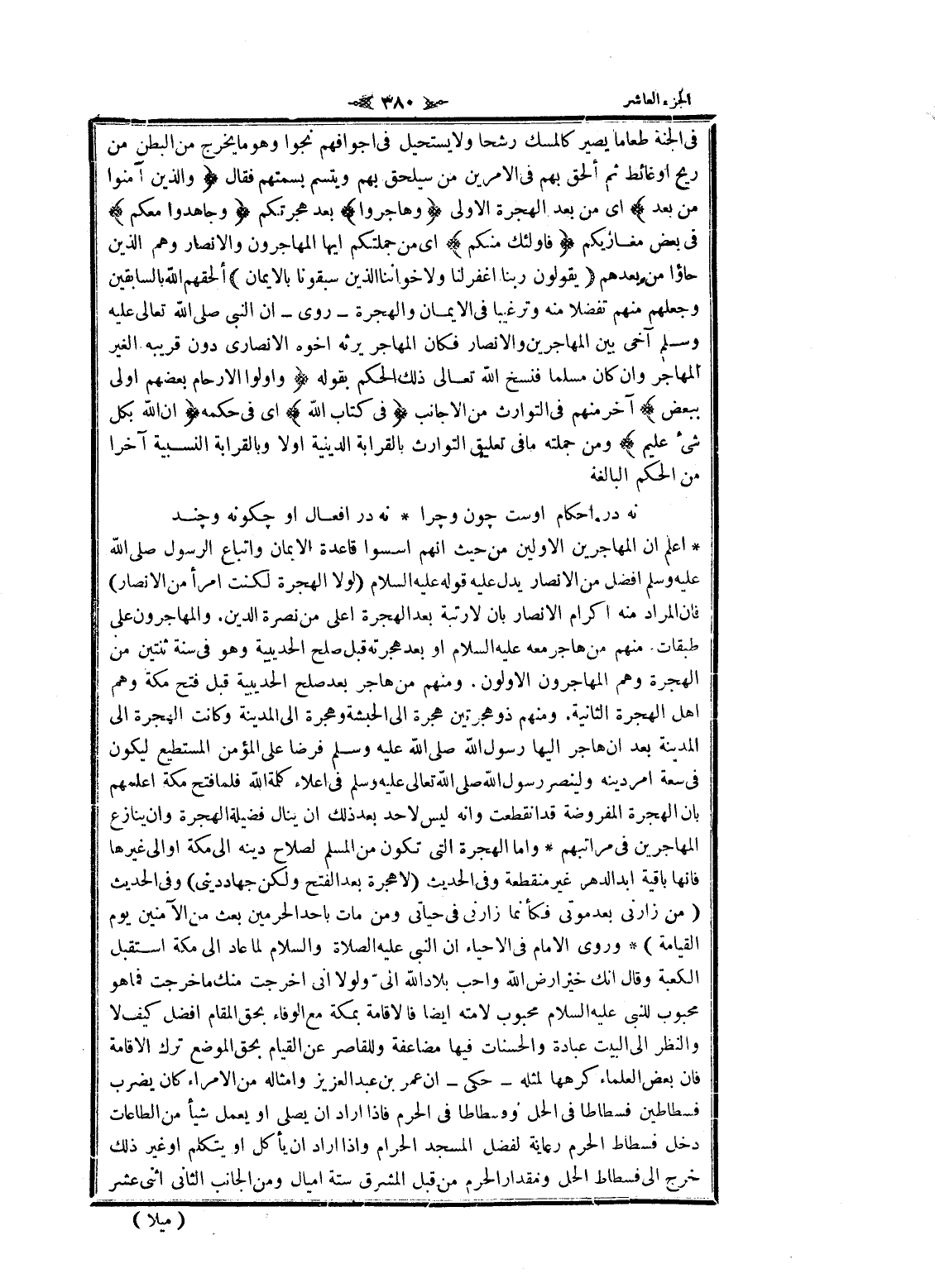 اعلم ان المهاجرين الأولين من حيث انهم أسسوا قاعدة الايمان واتباع الرسول صلى الله عليه وسلم أفضل من الأنصار يدل عليه قوله عليه السلام (لولا الهجرة لكنت امرأ من الأنصار) فان المراد منه إكرام الأنصار بان لا رتبة بعد الهجرة أعلى من نصرة الدين. والمهاجرون على طبقات منهم من هاجر معه عليه السلام او بعد هجرته قبل صلح الحديبية وهو فى سنة ثنتين من الهجرة وهم المهاجرون الأولون. ومنهم من هاجر بعد صلح الحديبية قبل فتح مكة وهم اهل الهجرة الثانية. ومنهم ذو هجرتين هجرة الى الحبشة وهجرة الى المدينة وكانت الهجرة الى المدينة بعد ان هاجر إليها رسول الله صلى الله عليه وسلم فرضا على المؤمن المستطيع ليكون فى سعة امر دينه ولينصر رسول الله صلى الله عليه وسلم فى إعلاء كلمة الله فلما فتح مكة أعلمهم بان الهجرة المفروضة قد انقطعت وانه ليس لاحد بعد ذلك ان ينال فضيلة الهجرة وان ينازع المهاجرين فى مراتبهم واما الهجرة التي تكون من المسلم لصلاح دينه الى مكة او الى غيرها فانها باقية ابد الدهر غير منقطعة وفى الحديث (لا هجرة بعد الفتح ولكن جهاد دينى) وفى الحديث (من زارنى بعد موتى فكأنما زارنى فى حياتى ومن مات بأحد الحرمين بعث من الآمنين يوم القيامة) وروى الامام فى الاحياء ان النبي عليه الصلاة والسلام لما عاد الى مكة استقبل الكعبة وقال انك خير ارض الله وأحب بلاد الله الىّ ولولا انى أخرجت منك ما خرجت فما هو محبوب للنبى عليه السلام محبوب لامته ايضا فالاقامة بمكة مع الوفاء بحق المقام أفضل كيف لا والنظر الى البيت عبادة والحسنات فيها مضاعفة وللقاصر عن القيام بحق الموضع ترك الاقامة فان بعض العلماء كرهها لمثله- حكى- ان عمر بن عبد العزيز وأمثاله من الأمراء كان يضرب فسطاطين فسطاطا فى الحل وفسطاطا فى الحرم فاذا أراد ان يصلى او يعمل شيأ من الطاعات دخل فسطاط الحرم رعاية لفضل المسجد الحرام وإذا أراد ان يأكل او يتكلم او غير ذلك خرج الى فسطاط الحل ومقدار الحرم من قبل المشرق ستة أميال ومن الجانب الثاني اثنى عشر