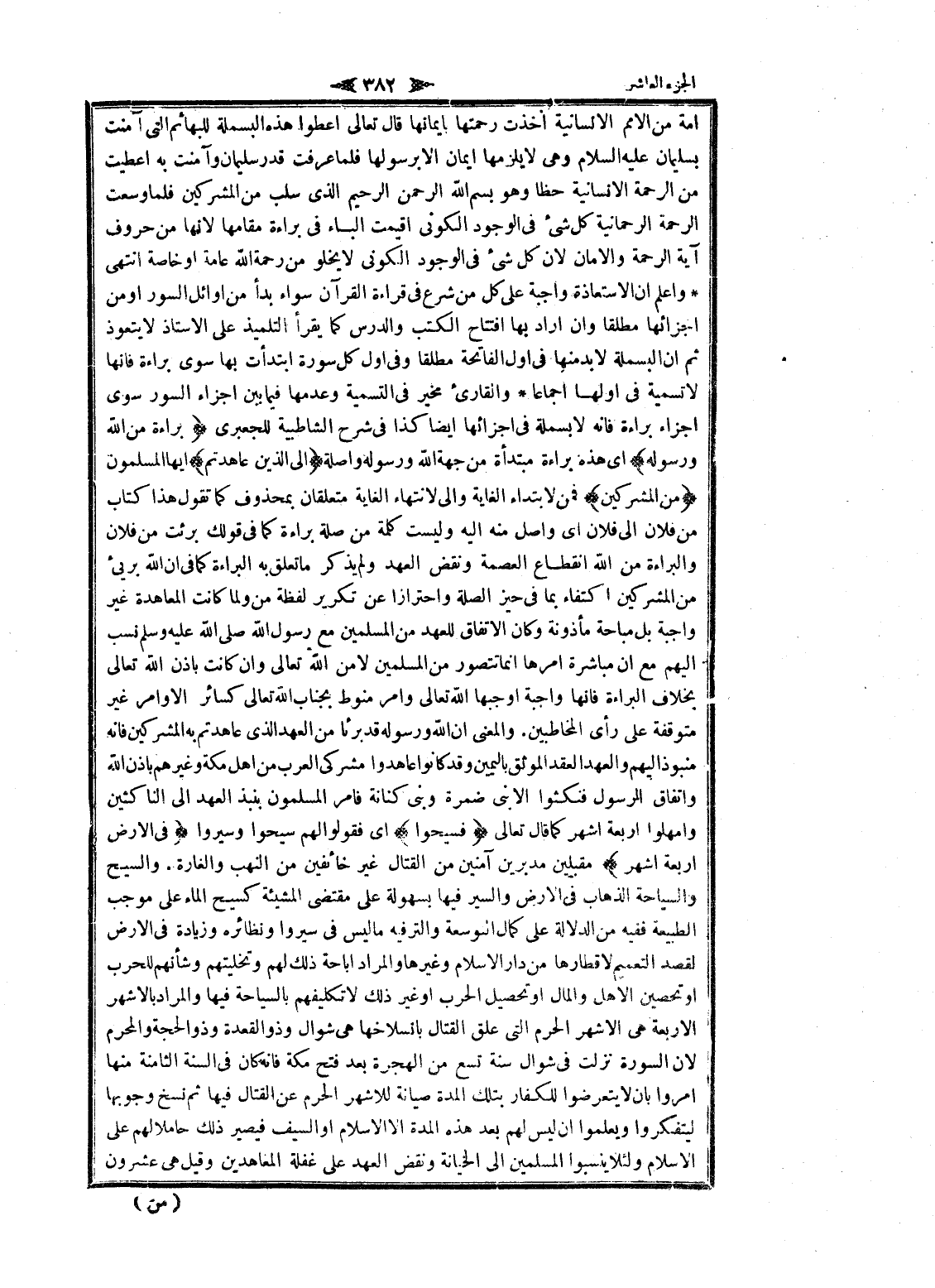 امة من الأمم الانسانية أخذت رحمتها بايمانها قال تعالى اعطوا هذه البسملة للبهائم التي آمنت بسليمان عليه السلام وهى لا يلزمها ايمان الا برسولها فلما عرفت قدر سليمان وآمنت به أعطيت من الرحمة الانسانية حظا وهو بسم الله الرحمن الرحيم الذي سلب من المشركين فلما وسعت الرحمة الرحمانية كل شىء فى الوجود الكونى أقيمت الباء فى براءة مقامها لانها من حروف آية الرحمة والامان لان كل شىء فى الوجود الكونى لا يخلو من رحمة الله عامة او خاصة انتهى واعلم ان الاستعاذة واجبة على كل من شرع فى قراءة القرآن سواء بدأ من أوائل السور او من اجزائها مطلقا وان أراد بها افتتاح الكتب والدرس كما يقرأ التلميذ على الأستاذ لا يتعوذ ثم ان البسملة لا بد منها فى أول الفاتحة مطلقا وفى أول كل سورة ابتدأت بها سوى براءة فانها لا تسمية فى أولها اجماعا والقارئ مخير فى التسمية وعدمها فيما بين اجزاء السور سوى اجزاء براءة فانه لا بسملة فى اجزائها ايضا كذا فى شرح الشاطبية للجعبرى بَراءَةٌ مِنَ اللَّهِ وَرَسُولِهِ اى هذه براءة مبتدأة من جهة الله ورسوله واصلة إِلَى الَّذِينَ عاهَدْتُمْ ايها المسلمون مِنَ الْمُشْرِكِينَ فمن لابتداء الغاية والى لانتهاء الغاية متعلقان بمحذوف كما تقول هذا كتاب من فلان الى فلان اى واصل منه اليه وليست كلمة من صلة براءة كما فى قولك برئت من فلان والبراءة من الله انقطاع العصمة ونقض العهد ولم يذكر ما تعلق به البراءة كما فى ان الله بريىء من المشركين اكتفاء بما فى حيز الصلة واحترازا عن تكرير لفظة من ولما كانت المعاهدة غير واجبة بل مباحة مأذونة وكان الاتفاق للعهد من المسلمين مع رسول الله صلى الله عليه وسلم نسب إليهم مع ان مباشرة أمرها انما تتصور من المسلمين لامن الله تعالى وان كانت بإذن الله تعالى بخلاف البراءة فانها واجبة أوجبها الله تعالى وامر منوط بجناب الله تعالى كسائر الأوامر غير متوقفة على رأى المخاطبين. والمعنى ان الله ورسوله قد برئا من العهد الذي عاهدتم به المشركين فانه منبوذ إليهم والعهد العقد الموثق باليمين وقد كانوا عاهدوا مشركى العرب من اهل مكة وغيرهم بإذن الله واتفاق الرسول فنكثوا الا بنى ضمرة وبنى كنانة فامر المسلمون بنبذ العهد الى الناكثين وأمهلوا اربعة أشهر كما قال تعالى فَسِيحُوا اى فقولوا لهم سيحوا وسيروا فِي الْأَرْضِ أَرْبَعَةَ أَشْهُرٍ مقبليين مدبرين آمنين من القتال غير خائفين من النهب والغارة. والسيح والسياحة الذهاب فى الأرض والسير فيها بسهولة على مقتضى المشيئة كسيح الماء على موجب الطبيعة ففيه من الدلالة على كمال التوسعة والترفيه ما ليس فى سيروا ونظائره وزيادة فى الأرض لقصد التعميم لا قطارها من دار الإسلام وغيرها والمراد اباحة ذلك لهم وتخليتهم وشأنهم للحرب او تحصين الأهل والمال او تحصيل الحرب او غير ذلك لا تكليفهم بالسياحة فيها والمراد بالأشهر الاربعة هى الأشهر الحرم التي علق القتال بانسلاخها هى شوال وذو القعدة وذو الحجة والمحرم لان السورة نزلت فى شوال سنة تسع من الهجرة بعد فتح مكة فانه كان فى السنة الثامنة منها أمروا بان لا يتعرضوا للكفار بتلك المدة صيانة للاشهر الحرم عن القتال فيها ثم نسخ وجوبها ليتفكروا ويعلموا ان ليس لهم بعد هذه المدة الا الإسلام او السيف فيصير ذلك حاملا لهم على الإسلام ولئلا ينسبوا المسلمين الى الخيانة ونقض العهد على غفلة المعاهدين وقيل هى عشرون