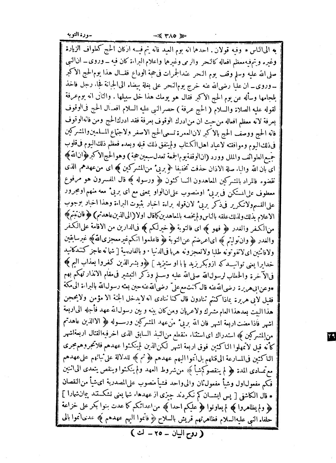 به الى الناس وفيه قولان. أحدهما انه يوم العيد فانه يتم فيه اركان الحج كطواف الزيادة وغيره ويتم فيه معظم أفعاله كالنحر والرمي وغيرهما واعلام البراءة كان فيه- وروى- ان النبي صلى الله عليه وسلم وقف يوم النحر عند الجمرات فى حجة الوداع فقال هذا يوم الحج الأكبر- وروى- ان عليا رضى الله عنه خرج يوم النحر على بغلة بيضاء الى الجبانة فجاء رجل فاخذ بلجامها وسأله عن يوم الحج الأكبر فقال هو يومك هذا خل سبيلها. والثاني انه يوم عرفة لقوله عليه الصلاة والسلام (الحج عرفة) حصر النبي عليه السلام افعال الحج فى الوقوف بعرفة لانه معظم أفعاله من حيث ان من أدرك الوقوف بعرفة فقد أدرك الحج ومن فاته الوقوف فاته الحج ووصف الحج بالأكبر لان العمرة تسمى الحج الأصغر ولاجتماع المسلمين والمشركين فى ذلك اليوم وموافقته لاعياد اهل الكتاب ولم يتفق ذلك قبله وبعده فعظم ذلك اليوم فى قلوب جميع الطوائف والملل وورد (ان الوقفة يوم الجمعة تعدل سبعين حجة) وهو الحج الأكبر أَنَّ اللَّهَ اى بان الله والباء صلة الاذان حذفت تخفيفا بَرِيءٌ مِنَ الْمُشْرِكِينَ اى من عهدهم الذي نقضوه فالمراد بالمشركين المعاهدون الناكثون وَرَسُولِهِ قال المفسرون هو مرفوع معطوف على المستكن فى بريىء او منصوب على ان الواو بمعنى مع اى بريىء معه منهم او مجرور على القسم ولا تكرير فى ذكر بريىء لان قوله براءة اخبار بثبوت البراءة وهذا اخبار بوجوب الاعلام بذلك ولذلك علقه بالناس ولم يخصه بالمعاهدين كما قال اولا إِلَى الَّذِينَ عاهَدْتُمْ فَإِنْ تُبْتُمْ من الكفر والغدر فَهُوَ اى فالتوبة خَيْرٌ لَكُمْ فى الدارين من الاقامة على الكفر والغدر وَإِنْ تَوَلَّيْتُمْ اى أعرضتم عن التوبة فَاعْلَمُوا أَنَّكُمْ غَيْرُ مُعْجِزِي اللَّهِ غير سابقين ولا فائتين اى لا تفوتونه طلبا ولا تعجزونه هربا فى الدنيا. وبالفارسية [شما نه عاجز كنندكانيد خدايرا يعنى توانيد كه ازو بكر يزيد يا با او ستيزيد] وَبَشِّرِ الَّذِينَ كَفَرُوا بِعَذابٍ أَلِيمٍ فى الآخرة والخطاب لرسول الله صلى الله عليه وسلم وذكر التبشير فى مقام الانذار تهكم بهم وعن ابى هريرة رضى الله عنه قال كنت مع علىّ رضى الله عنه حين بعثه رسول الله بالبراءة الى مكة فقيل لابى هريرة بماذا كنتم تنادون قال كنا ننادى انه لا يدخل الجنة الا مؤمن ولا يحجن هذا البيت بعد هذا العام مشرك ولا عريان ومن كان بينه وبين رسول الله عهد فأجله الى اربعة أشهر فاذا مضت اربعة أشهر فان الله بريىء من عهد المشركين ورسوله إِلَّا الَّذِينَ عاهَدْتُمْ مِنَ الْمُشْرِكِينَ استدراك اى استثناء منقطع من النبذ السابق الذي اخر فيه القتال اربعة أشهر كأنه قيل لا تمهلوا الناكثين فوق اربعة أشهر لكن الذين لم ينكثوا عهدهم فلا تجروهم مجرى الناكثين فى المسارعة الى قتلهم بل أتموا إليهم عهدهم ثُمَّ للدلالة على ثباتهم على عهدهم مع تمادى المدة لَمْ يَنْقُصُوكُمْ شَيْئاً من شروط العهد ولم ينكثوا وينقص يتعدى الى اثنين فكم مفعول أول وشيأ مفعول ثان والى واحد فشيأ منصوب على المصدرية اى شيأ من النقصان قال الكاشفى [پس ايشان كم نكردند چيزى از عهدهاء شما يعنى نشكستند پيمان شما را] وَلَمْ يُظاهِرُوا لم يعاونوا عَلَيْكُمْ أَحَداً من أعدائكم كما عدت بنوا بكر على خزاعة حلفاء النبي عليه السلام فظاهرتهم قريش بالسلاح فَأَتِمُّوا إِلَيْهِمْ عَهْدَهُمْ عدى أتموا بالى