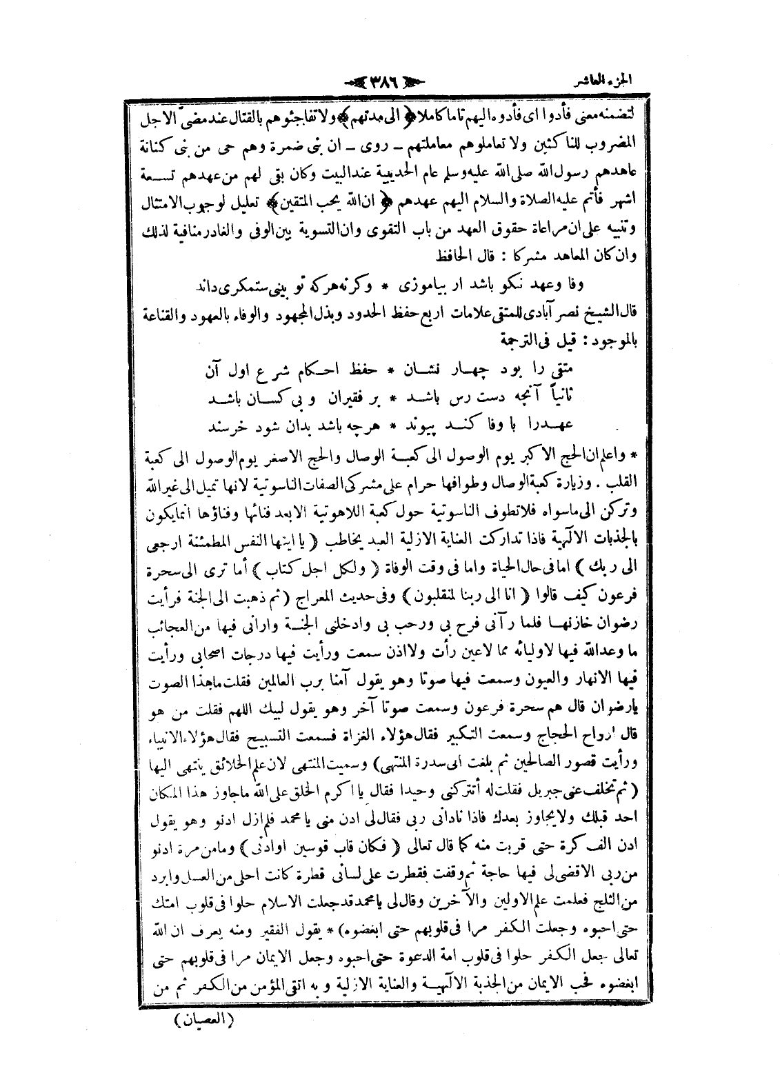 واعلم ان الحج الأكبر يوم الوصول الى كعبة الوصال والحج الأصغر يوم الوصول الى كعبة القلب. وزيارة كعبة الوصال وطوافها حرام على مشركى الصفات الناسوتية لانها تميل الى غير الله وتركن الى ما سواه فلا تطوف الناسوتية حول كعبة اللاهوتية الا بعد فنائها وفناؤها انما يكون بالجذبات الالهية فاذا تداركت العناية الازلية العبد يخاطب يا أَيَّتُهَا النَّفْسُ الْمُطْمَئِنَّةُ ارْجِعِي إِلى رَبِّكِ اما فى حال الحياة واما فى وقت الوفاة لِكُلِّ أَجَلٍ كِتابٌ أما ترى الى سحرة فرعون كيف قالوا إِنَّا إِلى رَبِّنا لَمُنْقَلِبُونَ وفى حديث المعراج (ثم ذهبت الى الجنة فرأيت رضوان خازنها فلما رآنى فرح بي ورحب بي وأدخلني الجنة وأراني فيها من العجائب ما وعد الله فيها لاوليائه مما لا عين رأت ولا اذن سمعت ورأيت فيها درجات أصحابي ورأيت فيها الأنهار والعيون وسمعت فيها صوتا وهو يقول آمنا برب العالمين فقلت ما هذا الصوت يا رضوان قال هم سحرة فرعون وسمعت صوتا آخر وهو يقول لبيك اللهم فقلت من هو قال أرواح الحجاج وسمعت التكبير فقال هؤلاء الغزاة فسمعت التسبيح فقال هؤلاء الأنبياء ورأيت قصور الصالحين ثم بلغت الى سدرة المنتهى) وسميت المنتهى لان علم الخلائق ينتهى إليها (ثم تخلف عنى جبريل فقلت له أتتركني وحيدا فقال يا أكرم الخلق على الله ما جاوز هذا المكان أحد قبلك ولا يجاوز بعدك فاذا نادانى ربى فقال لى ادن منى يا محمد فلم ازل ادنو وهو يقول ادن الف كرة حتى قربت منه كما قال تعالى فَكانَ قابَ قَوْسَيْنِ أَوْ أَدْنى وما من مرة ادنو من ربى إلا قضى لى فيها حاجة ثم وقفت فقطرت على لسانى قطرة كانت احلى من العسل وأبرد من الثلج فعلمت علم الأولين والآخرين وقال لى يا محمد قد جعلت الإسلام حلوا فى قلوب أمتك حتى احبوه وجعلت الكفر مرا فى قلوبهم حتى ابغضوه) يقول الفقير ومنه يعرف ان الله تعالى جعل الكفر حلوا فى قلوب امة الدعوة حتى احبوه وجعل الايمان مرا فى قلوبهم حتى ابغضوه فحب الايمان من الجذبة الالهية والعناية الازلية وبه اتقى المؤمن من الكفر ثم من