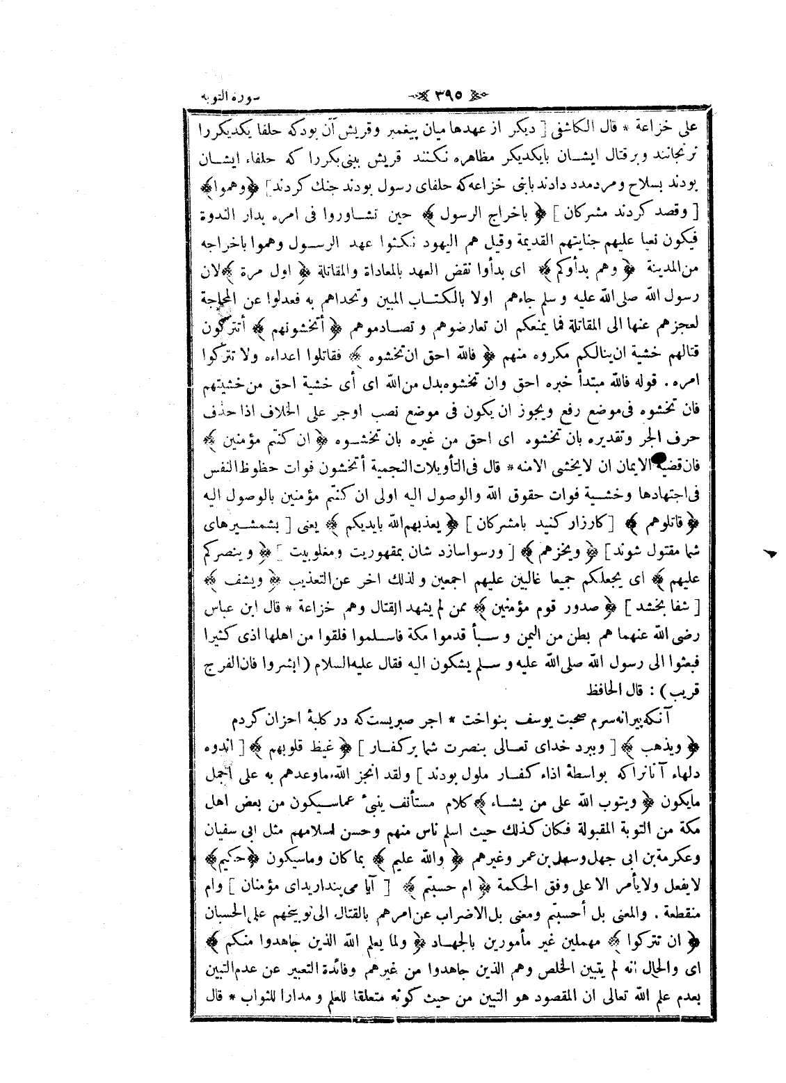 على خزاعة قال الكاشفى [ديكر از عهدها ميان پيغمبر وقريش آن بود كه حلفا يكديكر را نرنجانند وبر قتال ايشان با يكديكر مظاهره نكنند قريش ببني بكر را كه حلفاء ايشان بودند بسلاح ومرد مدد دادند با بنى خزاعه كه حلفاى رسول بودند جنك كردند] وَهَمُّوا [وقصد كردند مشركان] بِإِخْراجِ الرَّسُولِ حين تشاوروا فى امره بدار الندوة فيكون نعيا عليهم جنايتهم القديمة وقيل هم اليهود نكثوا عهد الرسول وهموا بإخراجه من المدينة وَهُمْ بَدَؤُكُمْ اى بدأوا نقض العهد بالمعاداة والمقاتلة أَوَّلَ مَرَّةٍ لان رسول الله صلى الله عليه وسلم جاءهم اولا بالكتاب المبين وتحداهم به فعدلوا عن المحاجة لعجزهم عنها الى المقاتلة فما يمنعكم ان تعارضوهم وتصادموهم أَتَخْشَوْنَهُمْ أتتركون قتالهم خشية ان ينالكم مكروه منهم فَاللَّهُ أَحَقُّ أَنْ تَخْشَوْهُ فقاتلوا أعداءه ولا تتركوا امره. قوله فالله مبتدأ خبره أحق وان تخشوه بدل من الله اى أي خشية أحق من خشيتهم فان تخشوه فى موضع رفع ويجوز ان يكون فى موضع نصب او جر على الخلاف إذا حذف حرف الجر وتقديره بان تخشوه اى أحق من غيره بان تخشوه إِنْ كُنْتُمْ مُؤْمِنِينَ فان قضية الايمان ان لا يخشى الا منه قال فى التأويلات النجمية أتخشون فوات حظوظ النفس فى اجتهادها وخشية فوات حقوق الله والوصول اليه اولى ان كنتم مؤمنين بالوصول اليه قاتِلُوهُمْ [كارزار كنيد با مشركان] يُعَذِّبْهُمُ اللَّهُ بِأَيْدِيكُمْ يعنى [بشمشيرهاى شما مقتول شوند] وَيُخْزِهِمْ [ورسوا سازد شان بمقهوريت ومغلوبيت] وَيَنْصُرْكُمْ عَلَيْهِمْ اى يجعلكم جميعا غالبين عليهم أجمعين ولذلك اخر عن التعذيب وَيَشْفِ [شفا بخشد] صُدُورَ قَوْمٍ مُؤْمِنِينَ ممن لم يشهد القتال وهم خزاعة قال ابن عباس رضى الله عنهما هم بطن من اليمن وسبأ قدموا مكة فاسلموا فلقوا من أهلها أذى كثيرا فبعثوا الى رسول الله صلى الله عليه وسلم يشكون اليه فقال عليه السلام (ابشروا فان الفرج قريب) : قال الحافظ