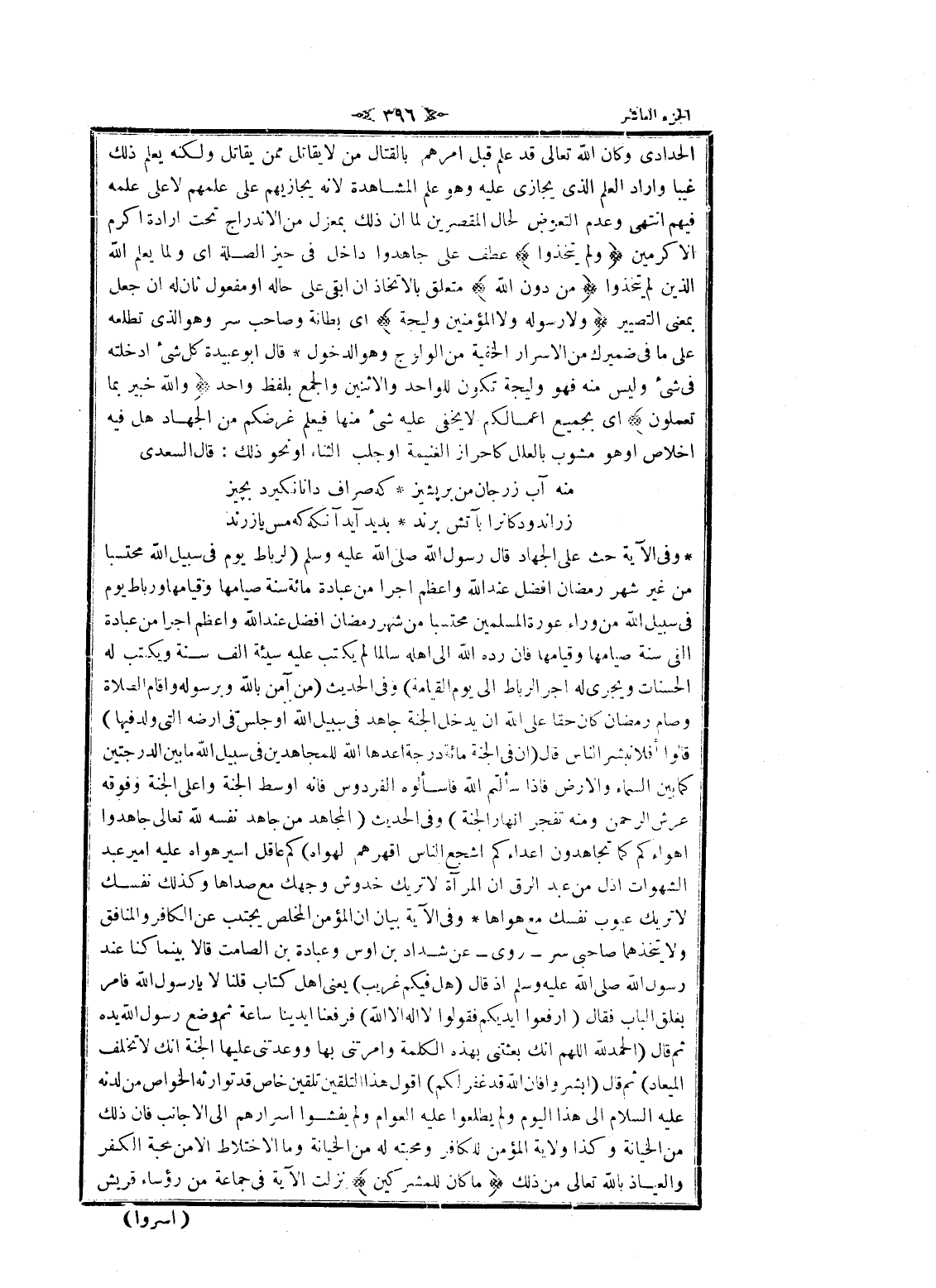 وفى الآية حث على الجهاد قال رسول الله صلى الله عليه وسلم (لرباط يوم فى سبيل الله محتسبا من غير شهر رمضان أفضل عند الله وأعظم اجرا من عبادة مائة سنة صيامها وقيامها ورباط يوم فى سبيل الله من وراء عورة المسلمين محتسبا من شهر رمضان أفضل عند الله وأعظم اجرا من عبادة الفى سنة صيامها وقيامها فان رده الله الى اهله سالما لم يكتب عليه سيئة الف سنة ويكتب له الحسنات ويجرى له اجر الرباط الى يوم القيامة) وفى الحديث (من آمن بالله وبرسوله واقام الصلاة وصام رمضان كان حقا على الله ان يدخل الجنة جاهد فى سبيل الله او جلس فى ارضه التي ولد فيها) قالوا أفلا نبشر الناس قال (ان فى الجنة مائة درجة أعدها الله للمجاهدين فى سبيل الله ما بين الدرجتين كما بين السماء والأرض فاذا سألتم الله فاسألوه الفردوس فانه اوسط الجنة وأعلى الجنة وفوقه عرش الرحمن ومنه تفجر انهار الجنة) وفى الحديث (المجاهد من جاهد نفسه لله تعالى جاهدوا أهواءكم كما تجاهدون أعداءكم أشجع الناس اقهرهم لهواه) كم عاقل أسير هواه عليه امير عبد الشهوات أذل من عبد الرق ان المرآة لا تريك خدوش وجهك مع صداها وكذلك نفسك لا تريك عيوب نفسك مع هواها وفى الآية بيان ان المؤمن المخلص يجتنب عن الكافر والمنافق ولا يتخذهما صاحبى سر- روى- عن شداد بن أوس وعبادة بن الصامت قالا بينما كنا عند رسول الله صلى الله عليه وسلم إذ قال (هل فيكم غريب) يعنى اهل كتاب قلنا لا يا رسول الله فامر يغلق الباب فقال (ارفعوا ايديكم فقولوا لا اله الا الله) فرفعنا أيدينا ساعة ثم وضع رسول الله يده ثم قال (الحمد لله اللهم انك بعثتني بهذه الكلمة وأمرتني بها ووعدتني عليها الجنة انك لا تخلف الميعاد) ثم قال (ابشروا فان الله قد غفر لكم) أقول هذا التلقين تلقين خاص قد توارثه الخواص من لدنه عليه السلام الى هذا اليوم ولم يطلعوا عليه العوام ولم يفشوا أسرارهم الى الأجانب فان ذلك من الخيانة وكذا ولاية المؤمن للكافر ومحبته له من الخيانة وما الاختلاط الا من محبة الكفر والعياذ بالله تعالى من ذلك ما كانَ لِلْمُشْرِكِينَ نزلت الآية فى جماعة من رؤساء قريش