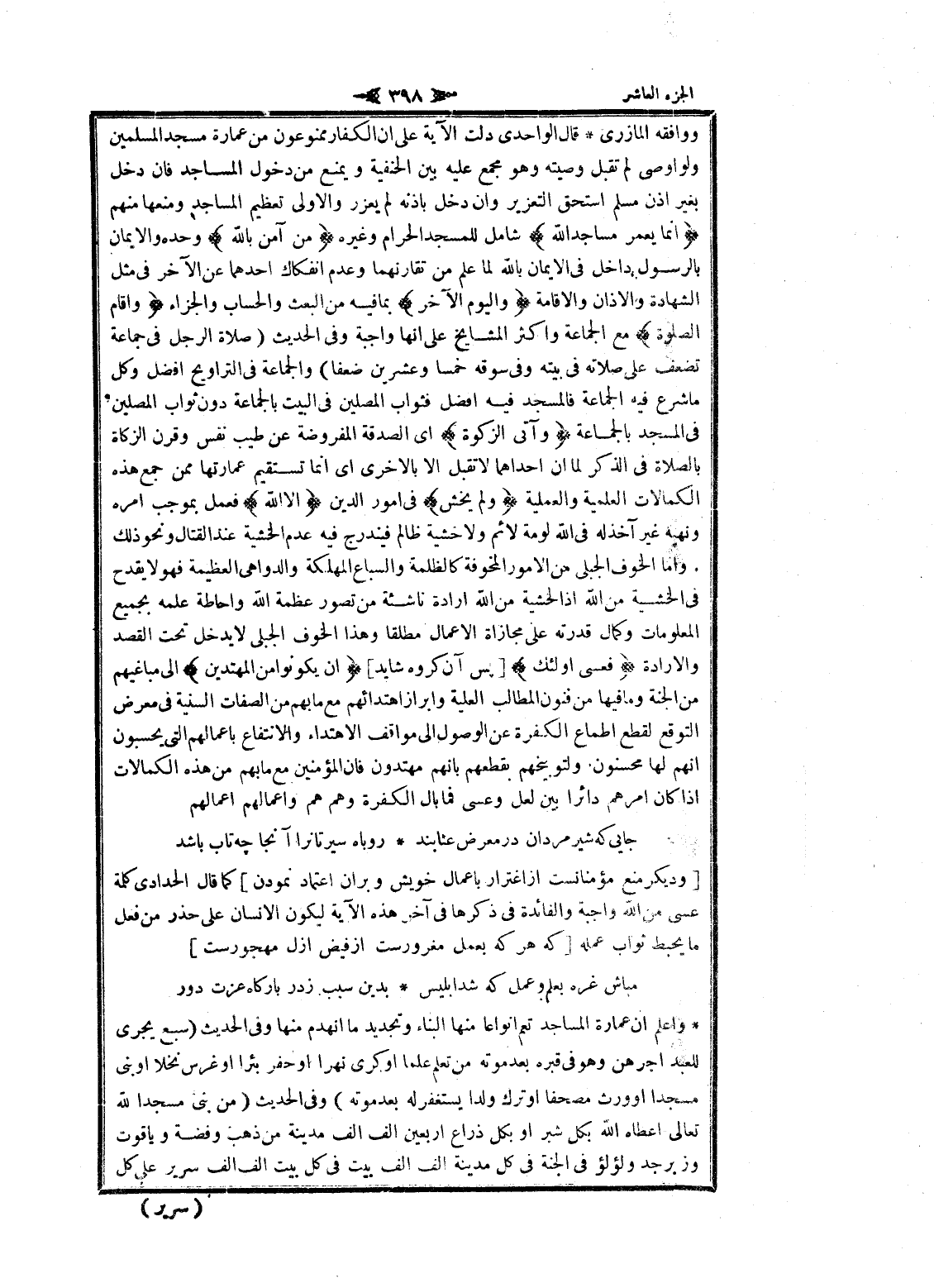 ووافقه المازري قال الواحدي دلت الآية على ان الكفار ممنوعون من عمارة مسجد المسلمين ولو اوصى لم تقبل وصيته وهو مجمع عليه بين الحنفية ويمنع من دخول المساجد فان دخل بغير اذن مسلم استحق التعزير وان دخل باذنه لم يعزر والاولى تعظيم المساجد ومنعها منهم إِنَّما يَعْمُرُ مَساجِدَ اللَّهِ شامل للمسجد الحرام وغيره مَنْ آمَنَ بِاللَّهِ وحده والايمان بالرسول داخل فى الايمان بالله لما علم من تقارنهما وعدم انفكاك أحدهما عن الآخر فى مثل الشهادة والاذان والاقامة وَالْيَوْمِ الْآخِرِ بما فيه من البعث والحساب والجزاء وَأَقامَ الصَّلاةَ مع الجماعة واكثر المشايخ على انها واجبة وفى الحديث (صلاة الرجل فى جماعة تضعف على صلاته فى بيته وفى سوقه خمسا وعشرين ضعفا) والجماعة فى التراويح أفضل وكل ما شرع فيه الجماعة فالمسجد فيه أفضل فثواب المصلين فى البيت بالجماعة دون ثواب المصلين فى المسجد بالجماعة وَآتَى الزَّكاةَ اى الصدقة المفروضة عن طيب نفس وقرن الزكاة بالصلاة فى الذكر لما ان إحداهما لا تقبل الا بالأخرى اى انما تستقيم عمارتها ممن جمع هذه الكمالات العلمية والعلمية وَلَمْ يَخْشَ فى امور الدين إِلَّا اللَّهَ فعمل بموجب امره ونهيه غير آخذ له فى الله لومة لائم ولا خشية ظالم فيندرج فيه عدم الخشية عند القتال ونحو ذلك. واما الخوف الجبلي من الأمور المخوفة كالظلمة والسباع المهلكة والدواهي العظيمة فهو لا يقدح فى الخشية من الله إذ الخشية من الله ارادة ناشئة من تصور عظمة الله واحاطة علمه بجميع المعلومات وكمال قدرته على مجازاة الأعمال مطلقا وهذا الخوف الجبلي لا يدخل تحت القصد والارادة فَعَسى أُولئِكَ [پس آن كروه شايد] أَنْ يَكُونُوا مِنَ الْمُهْتَدِينَ الى مباغيهم من الجنة وما فيها من فنون المطالب العلية وإبراز اهتدائهم مع ما بهم من الصفات السنية فى معرض التوقع لقطع اطماع الكفرة عن الوصول الى مواقف الاهتداء والانتفاع بأعمالهم التي يحسبون انهم لها محسنون ولتوبيخهم بقطعهم بانهم مهتدون فان المؤمنين مع ما بهم من هذه الكمالات إذا كان أمرهم دائرا بين لعل وعسى فما بال الكفرة وهم هم وأعمالهم أعمالهم