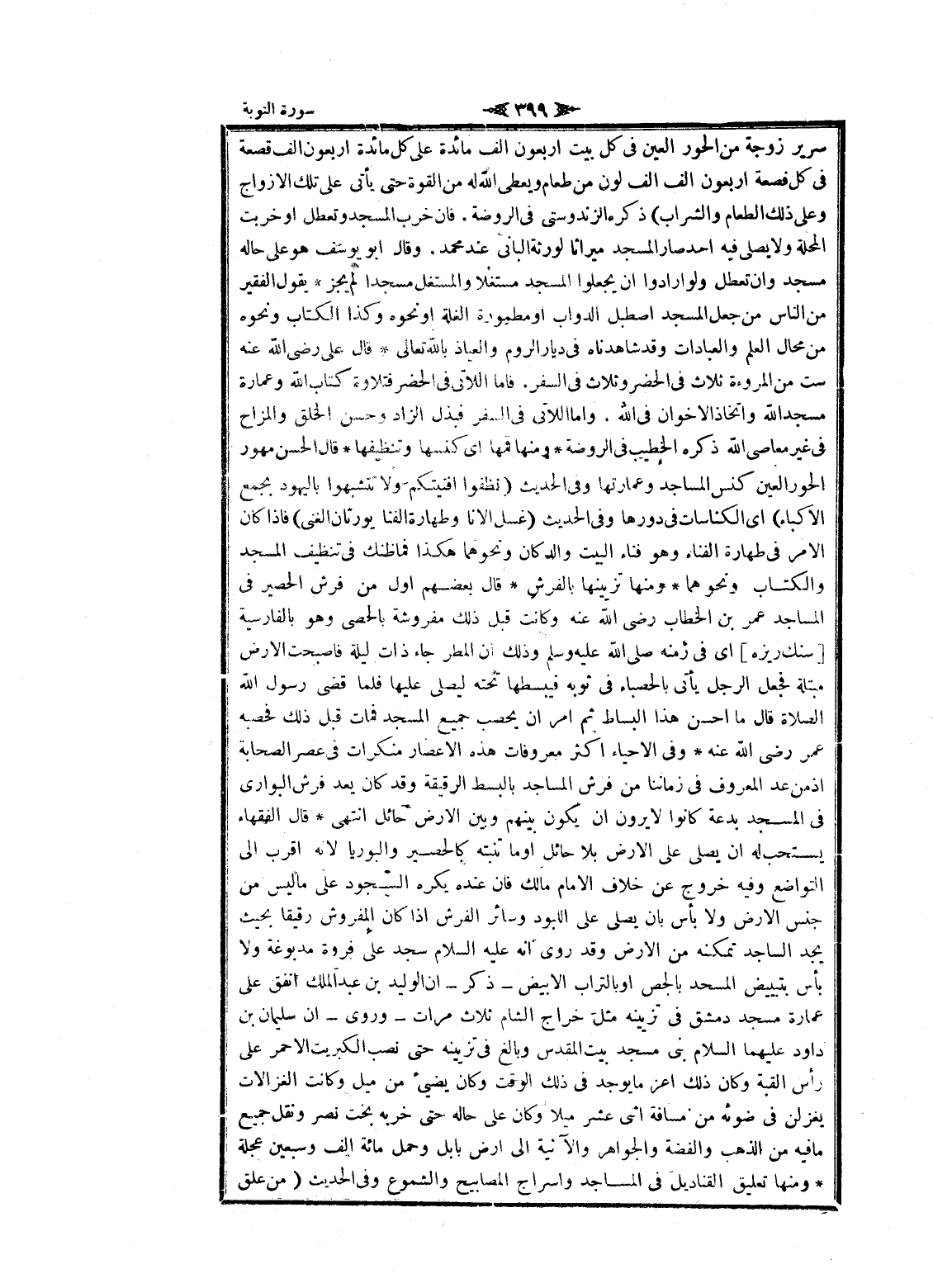 سرير زوجة من الحور العين فى كل بيت أربعون الف مائدة على كل مائدة أربعون الف قصة فى كل قصعة أربعون الف الف لون من طعام ويعطى الله له من القوة حتى يأتى على تلك الأزواج وعلى ذلك الطعام والشراب) ذكره الزندوستى فى الروضة. فان خرب المسجد وتعطل او خربت المحلة ولا يصلى فيه أحد صار المسجد ميراثا لورثة الباني عند محمد. وقال ابو يوسف هو على حاله مسجد وان تعطل ولو أرادوا ان يجعلوا المسجد مستغلا والمستغل مسجدا لم يجز يقول الفقير من الناس من جعل المسجد إصطبل الدواب او مطمورة الغلة او نحوه وكذا الكتاب ونحوه من محال العلم والعبادات وقد شاهدناه فى ديار الروم والعياذ بالله تعالى قال على رضى الله عنه ست من المروءة ثلاث فى الحضر وثلاث فى السفر. فاما اللاتي فى الحضر فتلاوة كتاب الله وعمارة مسجد الله واتخاذ الاخوان فى الله. واما اللاتي فى السفر فبذل الزاد وحسن الخلق والمزاح فى غير معاصى الله ذكره