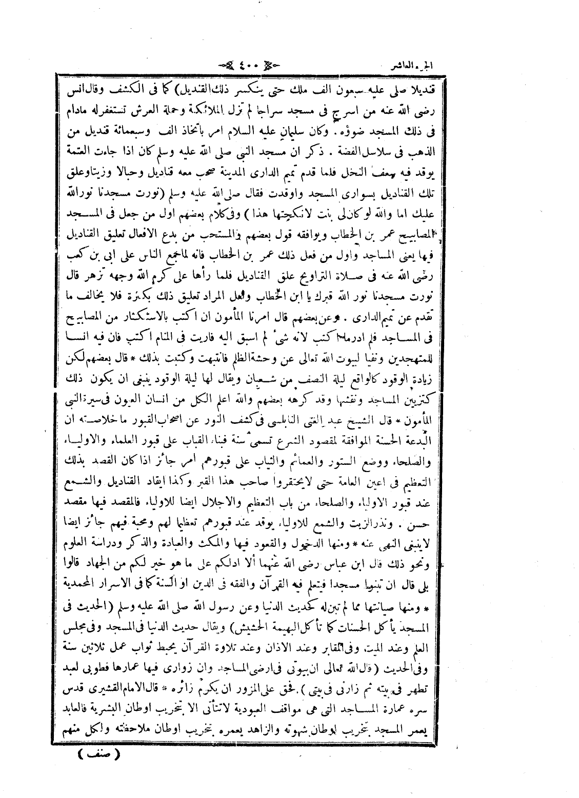 لا يحتقروا صاحب هذا القبر وكذا إيقاد القناديل والشمع عند قبور الأولياء والصلحاء من باب التعظيم والإجلال ايضا للاولياء فالمقصد فيها مقصد حسن. ونذر الزيت والشمع للاولياء يوقد عند قبورهم تعظيما لهم ومحبة فيهم جائز ايضا لا ينبغى النهى عنه ومنها الدخول والقعود فيها والمكث والعبادة والذكر ودراسة العلوم ونحو ذلك قال ابن عباس رضى الله عنهما ألا أدلكم على ما هو خير لكم من الجهاد قالوا بلى قال ان تبنوا مسجدا فيتعلم فيه القرآن والفقه فى الدين او السنة كما فى الاسرار المحمدية ومنها صيانتها مما لم تبن له كحديث الدنيا وعن رسول الله صلى الله عليه وسلم (الحديث فى المسجد يأكل الحسنات كما تأكل البهيمة الحشيش) ويقال حديث الدنيا فى المسجد وفى مجلس العلم وعند الميت وفى المقابر وعند الاذان وعند تلاوة القرآن يحبط ثواب عمل ثلاثين سنة وفى الحديث (قال الله تعالى ان بيوتى فى ارضى المساجد وان زوارى فيها عمارها فطوبى لعبد تطهر فى بيته ثم زارنى فى بيتي) فحق على المزور ان يكرم زائره قال الامام القشيري قدس سره عمارة المساجد التي هى مواقف العبودية لا تتأتى الا بتخريب أوطان البشرية فالعابد يعمر المسجد بتخريب أوطان شهوته والزاهد يعمره بتخريب أوطان ملاحظته ولكل منهم