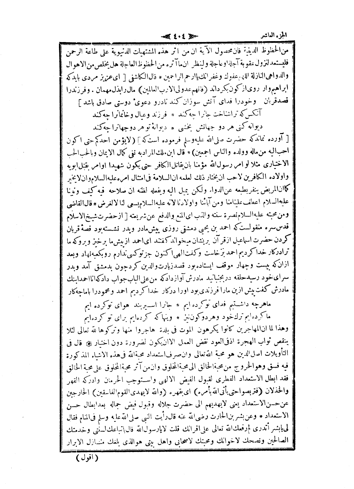 [آورده نماند كه حضرت صلى الله عليه وسلم فرموده است كه] (لا يؤمن أحدكم حتى أكون أحب اليه من ماله وولده والناس أجمعين) قال ابن ملك المراد به نفى كمال الايمان وبالحب الحب الاختياري مثلا لو امر رسول الله مؤمنا بان يقاتل الكافر حتى يكون شهيدا او امر بقتل أبويه وأولاده الكافرين لاحب ان يختار ذلك لعلمه ان السلامة فى امتثال امره عليه السلام وان لا يخير كما ان المريض ينفر بطبعه عن الدواء ولكن يميل اليه ويفعله لظنه ان صلاحه فيه كيف ونينا عليه السلام اعطف علينا منا ومن آبائنا وأولادنا لانه عليه السلام يسعى لنا لا لغرض قال القاضي ومن محبته عليه السلام نصرة سنته والذب اى المنع والدفع عن شريعته [از حضرت شيخ الإسلام قدس سره منقولست كه احمد بن يحيى دمشقى روزى پيش مادر و پدر نشسته بود قصه قربان كردن حضرت إسماعيل از قرآن بريشان ميخواند گفتند اى احمد از پيش ما بر خيز وبرو كه ما ترا در كار خدا كرديم احمد برخاست وگفت الهى اكنون جز تو كسى ندارم رو بكعبه نهاد وبعد از ان كه بيست و چهار موقف ايستاده بود قصد زيارت والدين كرد چون بدمشق آمد وبدر سراى خود رسيد حلقه در بجنبانيد مادرش آواز داد كه من على الباب جواب داد كه انا احمد ابنك مادرش گفت پيش ازين ما را فرزندى بود او را در كار خدا كرديم احمد ومحمود را با ما چهـ كار