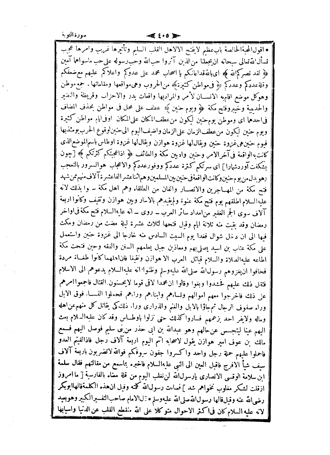 أقول المحبة الخالصة باب عظيم لا يفتح الا لاهل القلب السليم وتأثيرها غريب وأمرها عجيب نسأل الله تعالى سبحانه ان يجعلنا من الذين آثروا حب الله وحب رسوله على حب ما سواهما آمين لَقَدْ نَصَرَكُمُ اللَّهُ اى بالله قد أعانكم يا اصحاب محمد على عدوكم وأعلاكم عليهم مع ضعفكم وقلة عددكم وعددكم فِي مَواطِنَ كَثِيرَةٍ من الحروب وهى مواقعها ومقاماتها. جمع موطن وهو كل موضع اقام به الإنسان لأمر والمراد بها واقعات بدر والأحزاب وقريظة والنضير والحديبية وخيبر وفتح مكة وَيَوْمَ حُنَيْنٍ عطف على محل فى مواطن بحذف المضاف فى أحدهما اى وموطن يوم حنين ليكون من عطف المكان على المكان او فى ايام مواطن كثيرة ويوم حنين ليكون من عطف الزمان على الزمان وأضيف اليوم الى حنين لوقوع الحرب يومئذ بها فيوم حنين هى غزوة حنين ويقال لها غزوة هوازن ويقال لها غزوة أوطاس باسم الموضع الذي كانت به الواقعة فى آخر الأمر وحنين واد بين مكة والطائف إِذْ أَعْجَبَتْكُمْ كَثْرَتُكُمْ [چون بشگفت آورد شما را] اى سرتكم كثرة عددكم ووفور عددكم والاعجاب هو السرور بالتعجب رهو بدل من يوم حنين وكانت الواقعة فى حنين بين المسلمين وهم اثنا عشر الفا عشرة آلاف منهم ممن شهد فتح مكة من المهاجرين والأنصار والفان من الطلقاء وهم اهل مكة سموا بذلك لانه عليه السلام اطلقهم يوم فتح مكة عنوة ولم يقيدهم بالاسار وبين هوازن وثقيف وكانوا اربعة آلاف سوى الجم الغفير من امداد سائر العرب- روى- انه عليه السلام فتح مكة فى اواخر رمضان وقد بقيت منه ثلاثة ايام وقيل فتحها لثلاث عشرة ليلة مضت من رمضان ومكث فيها الى ان دخل شوال فغدا يوم السبت السادس منه خارجا الى غزوة حنين واستعمل على مكة عتاب بن أسيد يصلى بهم ومعاذبن جبل يعلمهم السنن والفقه وحين فتحت مكة أطاعه عليه الصلاة والسلام قبائل العرب الا هوازن ونقيفا فان أهلهما كانوا طغاة مردة فخافوا ان يغزوهم رسول الله صلى الله عليه وسلم وظنوا انه عليه السلام يدعوهم الى الإسلام فثقل ذلك عليهم فحشدوا وبغوا وقالوا ان محمدا لاقى قوما لا يحسنون القتال فاجمعوا أمرهم على ذلك فاخرجوا معهم أموالهم ونساءهم وأبناءهم وراءهم فحملوا النساء فوق الإبل وراء صفوف الرجال ثم جاؤا بالإبل والغنم والذراري وراء ذلك كى يقاتل كل منهم عن اهله وماله ولا يفر أحد بزعمهم فساروا كذلك حتى نزلوا باوطاس وقد كان عليه السلام بعث إليهم عينا ليتجسس عن حالهم وهو عبد الله بن ابى حدر من بنى سليم فوصل إليهم فسمع مالك بن عوف امير هوازن يقول لاصحابه أنتم اليوم اربعة آلاف رجل فاذا لقيتم العدو فاحملوا عليهم حملة رجل واحد واكسروا جفون سيوفكم فو الله لا تضربون باربعة آلاف سيف شيأ الا فرج فاقبل العين الى النبي عليه السلام فاخبره بما سمع من مقالتهم فقال سلمة ابن سلامة الوقسى الأنصاري يا رسول الله لن نغلب اليوم من قلة معناه بالفارسية [ما امروز از قلت لشكر مغلوب نخواهم شد] فساءت رسول الله كلمته وقيل ان هذه الكلمة قالها أبو بكر رضى الله عنه وقيل قالها رسول الله صلى الله عليه وسلم قال الامام صاحب التفسير الكبير وهو بعيد لانه عليه السلام كان فى اكثر الأحوال متوكلا على الله منقطع القلب عن الدنيا وأسبابها