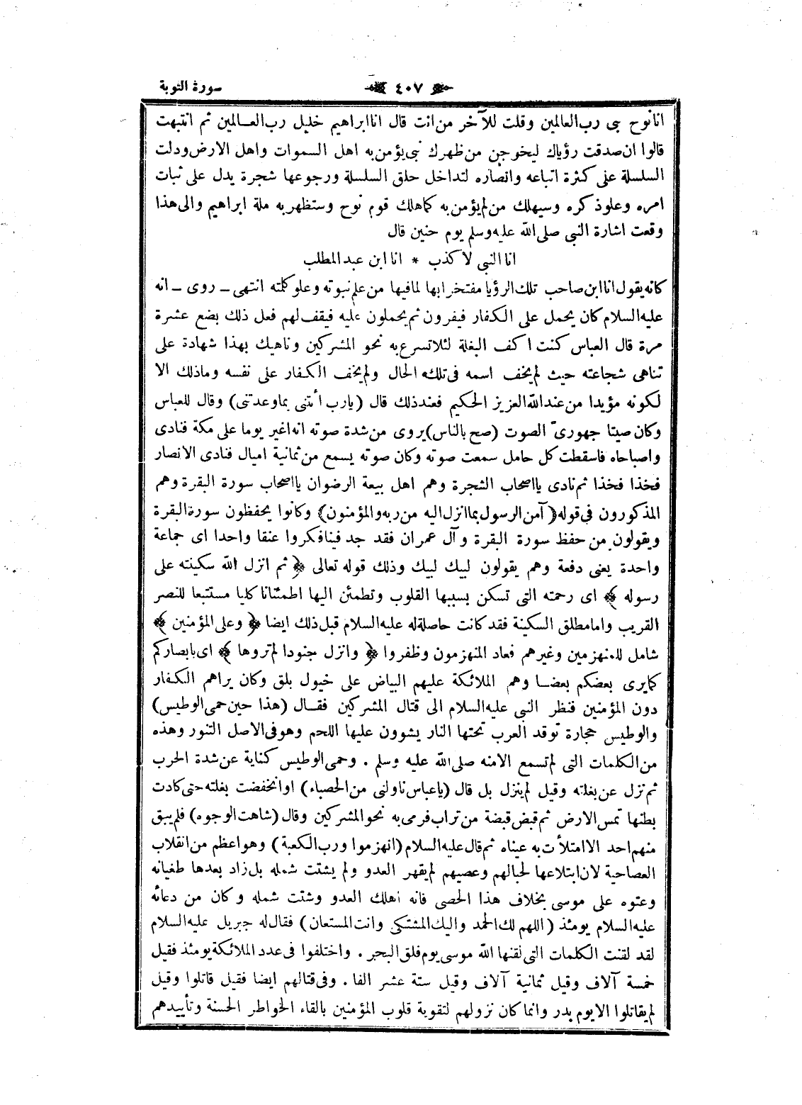 كانه يقول انا ابن صاحب تلك الرؤيا مفتخرا بها لما فيها من علم نبوته وعلو كلمته انتهى- روى- انه عليه السلام كان يحمل على الكفار فيفرون ثم يحملون عليه فيقف لهم فعل ذلك بضع عشرة مرة قال العباس كنت اكف البغلة لئلا تسرع به نحو المشركين وناهيك بهذا شهادة على تناهى شجاعته حيث لم يخف اسمه فى تلك الحال ولم يخف الكفار على نفسه وما ذلك الا لكونه مؤيدا من عند الله العزيز الحكيم فعند ذلك قال (يا رب ائتنى بما وعدتني) وقال للعباس وكان صيتا جمهورىّ الصوت (صح بالناس) يروى من شدة صوته انه أغير يوما على مكة فنادى وا صباحاه فاسقطت كل حامل سمعت صوته وكان صوته يسمع من ثمانية أميال فنادى الأنصار فخذا فخذا ثم نادى يا اصحاب الشجرة وهم اهل بيعة الرضوان يا اصحاب سورة البقرة وهم المذكورون فى قوله آمَنَ الرَّسُولُ بِما أُنْزِلَ إِلَيْهِ مِنْ رَبِّهِ وَالْمُؤْمِنُونَ وكانوا يحفظون سورة البقرة ويقولون من حفظ سورة البقرة وآل عمران فقد جد فينا فكروا عنقا واحدا اى جماعة واحدة يعنى دفعة وهم يقولون لبيك لبيك وذلك قوله تعالى ثُمَّ أَنْزَلَ اللَّهُ سَكِينَتَهُ عَلى رَسُولِهِ اى رحمته التي تسكن بسببها القلوب وتطمئن إليها اطمئنانا كليا مستتبعا للنصر القريب واما مطلق السكينة فقد كانت حاصلة له عليه السلام قبل ذلك ايضا وَعَلَى الْمُؤْمِنِينَ شامل للمنهزمين وغيرهم فعاد المنهزمون وظفروا وَأَنْزَلَ جُنُوداً لَمْ تَرَوْها اى بأبصاركم كما يرى بعضكم بعضا وهم الملائكة عليهم البياض على خيول بلق وكان يراهم الكفار دون المؤمنين فنظر النبي عليه السلام الى قتال المشركين فقال (هذا حين حمى الوطيس) والوطيس حجارة توقد العرب تحتها النار يشوون عليها اللحم وهو فى الأصل التنور وهذه من الكلمات التي لم تسمع إلا منه صلى الله عليه وسلم. وحمى الوطيس كناية عن شدة الحرب ثم نزل عن بغلته وقيل لم ينزل بل قال (يا عباس ناولنى من الحصباء) او انخفضت بغلته حتى كادت بطنها تمس الأرض ثم قبض قبضة من تراب فرمى به نحو المشركين وقال (شاهت الوجوه) فلم يبق منهم أحد الا امتلأت به عيناه ثم قال عليه السلام (انهزموا ورب الكعبة) وهو أعظم من انقلاب العصا حية لان ابتلاعها لحبالهم وعصيهم لم يقهر الغدو ولم يشتت شمله بل زاد بعدها طغيانه وعتوه على موسى بخلاف هذا الحصى فانه أهلك العدو وشتت شمله وكان من دعائه عليه السلام يومئذ (اللهم لك الحمد وإليك المشتكى وأنت المستعان) فقال له جبريل عليه السلام لقد لقنت الكلمات التي لقنها الله موسى يوم فلق البحر. واختلفوا فى عدد الملائكة يومئذ فقيل خمسة آلاف وقيل ثمانية آلاف وقيل ستة عشر الفا. وفى قتالهم ايضا فقيل قاتلوا وقيل لم يقاتلوا الا يوم بدر وانما كان نزولهم لتقوية قلوب المؤمنين بإلقاء الخواطر الحسنة وتأييدهم
