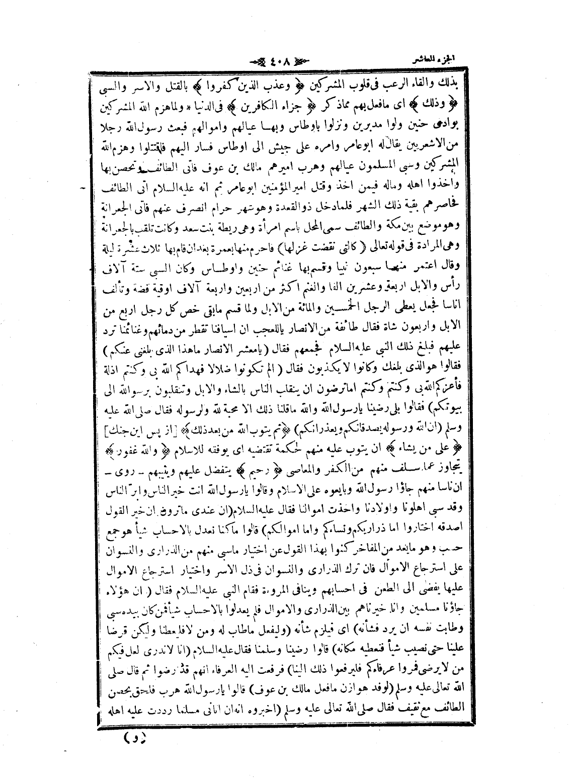 بذلك وإلقاء الرعب فى قلوب المشركين وَعَذَّبَ الَّذِينَ كَفَرُوا بالقتل والاسر والسبي وَذلِكَ اى ما فعل بهم مما ذكر جَزاءُ الْكافِرِينَ فى الدنيا ولما هزم الله المشركين بوادي حنين ولوا مدبرين ونزلوا باوطاس وبها عيالهم وأموالهم فبعث رسول الله رجلا من الأشعريين يقال له ابو عامر وامره على جيش الى أوطاس فسار إليهم فاقتتلوا وهزم الله المشركين وسبى المسلمون عيالهم وهرب أميرهم مالك بن عوف فاتى الطائف وتحصن بها وأخذوا اهله وماله فيمن أخذ وقتل امير المؤمنين ابو عامر ثم انه عليه السلام اتى الطائف فحاصرهم بقية ذلك الشهر فلما دخل ذو القعدة وهو شهر حرام انصرف عنهم فاتى الجعرانة وهو موضع بين مكة والطائف سمى المحل باسم امرأة وهى ريطة بنت سعد وكانت تلقب بالجعرانة وهى المرادة فى قوله تعالى كَالَّتِي نَقَضَتْ غَزْلَها فاحرم منها بعمرة بعد ان قام بها ثلاث عشرة ليلة وقال اعتمر منها سبعون نبيا وقسم بها غنائم حنين وأوطاس وكان السبي ستة آلاف رأس والإبل اربعة وعشرين الفا والغنم اكثر من أربعين واربعة آلاف اوقية قضة وتألف أناسا فجعل يعطى الرجل الخمسين والمائة من الإبل ولما قسم ما بقي خص كل رجل اربع من الإبل وأربعون شاة فقال طائفة من الأنصار يا للعجب ان اسيافنا تقطر من دمائهم وغنائمنا ترد عليهم فبلغ ذلك النبي عليه السلام فجمعهم فقال (يا معشر الأنصار ما هذا الذي بلغني عنكم) فقالوا هو الذي بلغك وكانوا لا يكذبون فقال (الم تكونوا ضلالا فهداكم الله بي وكنتم اذلة فأعزكم الله بي وكنتم وكنتم اما ترضون ان ينقلب الناس بالشاء والإبل وتنقلبون برسول الله الى بيوتكم) فقالوا بلى رضينا يا رسول الله والله ما قلنا ذلك الا محبة لله ولرسوله فقال صلى الله عليه وسلم (ان الله ورسوله يصدقانكم ويعذرانكم) ثُمَّ يَتُوبُ اللَّهُ مِنْ بَعْدِ ذلِكَ [از پس اين جنك] عَلى مَنْ يَشاءُ ان يتوب عليه منهم لحكمة تقتضيه اى يوفقه للاسلام وَاللَّهُ غَفُورٌ يتجاوز عما سلف منهم من الكفر والمعاصي رَحِيمٌ يتفضل عليهم ويثيبهم- روى- ان ناسا منهم جاؤا رسول الله وبايعوه على الإسلام وقالوا يا رسول الله أنت خير الناس وابرّ الناس وقد سبى أهلونا وأولادنا وأخذت أموالنا فقال عليه السلام (ان عندى ما ترون ان خير القول أصدقه اختاروا اما ذراريكم ونساءكم واما أموالكم) قالوا ما كنا نعدل بالاحساب شيأ هو جمع حسب وهو ما بعد من المفاخر كنوا بهذا القول عن اختيار ما سبى منهم من الذراري والنسوان على استرجاع الأموال فان ترك الذراري والنسوان فى ذل الاسر واختيار استرجاع الأموال عليها يفضى الى الطعن فى أحسابهم وينافى المروءة فقام النبي عليه السلام فقال (ان هؤلاء جاؤنا مسلمين وانا خيرناهم بين الذراري والأموال فلم يعدلوا بالاحساب شيأ فمن كان بيده سبى وطابت نفسه ان يرد فشأنه) اى فيلزم شأنه (وليفعل ما طاب له ومن لا فليعطنا وليكن قرضا علينا حتى نصيب شيأ فنعطيه مكانه) قالوا رضينا وسلمنا فقال عليه السلام (انا لا ندرى لعل فيكم من لا يرضى فمروا عرفاءكم فليرفعوا ذلك إلينا) فرفعت اليه العرفاء انهم قد رضوا ثم قال صلى الله تعالى عليه وسلم (لوفد هوازن ما فعل مالك بن عوف) قالوا يا رسول الله هرب فلحق بحصن الطائف مع ثقيف فقال صلى الله عليه وسلم (اخبروه انه ان أتاني مسلما رددت عليه اهله