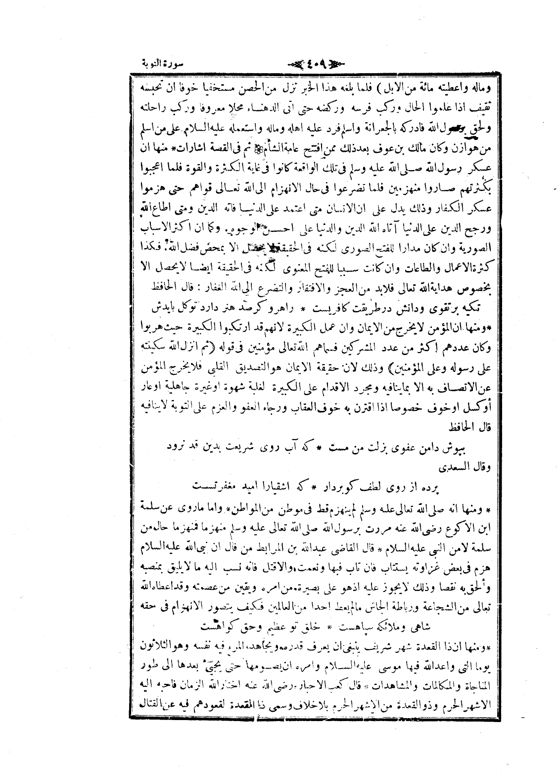 ومنها ان المؤمن لا يخرج من الايمان وان عمل الكبيرة لانهم قد ارتكبوا الكبيرة حيث هربوا وكان عددهم اكثر من عدد المشركين فسماهم الله تعالى مؤمنين فى قوله ثُمَّ أَنْزَلَ اللَّهُ سَكِينَتَهُ عَلى رَسُولِهِ وَعَلَى الْمُؤْمِنِينَ وذلك لان حقيقة الايمان هو التصديق القلبي فلا يخرج المؤمن عن الاتصاف به الا بما ينافيه ومجرد الاقدام على الكبيرة لغلبة شهوة او غيرة جاهلية او عار أو كسل او خوف خصوصا إذا اقترن به خوف العقاب ورجاء العفو والعزم على التوبة لا ينافيه قال الحافظ